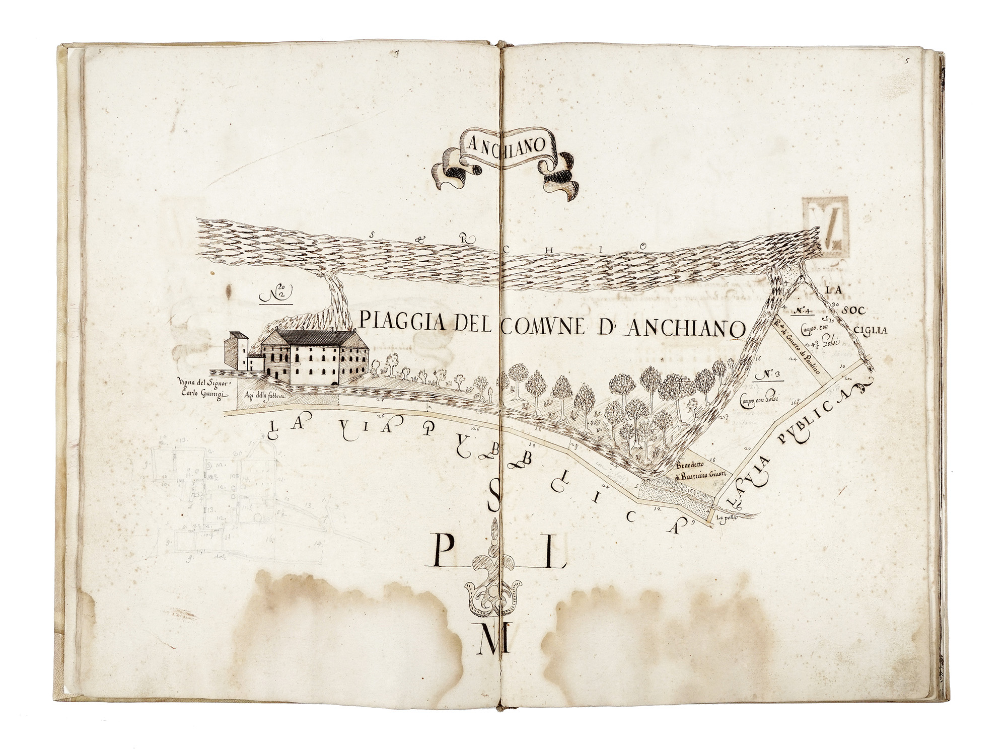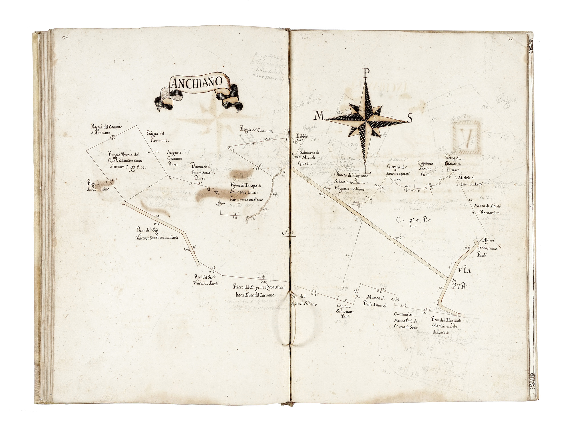 Manoscritto a inchiostro bruno. Carte [1], 37, [10]. Veline protettive ai disegni. Alcune bruniture, ma ottime condizioni. Legatura in pergamena moderna. Dimensioni: 405x270 mm. (1) Cabreo compilato da Vincenzo Finucci di Casabasciana, pubblico agrimensore. Il frontespizio è seguito dal Ristretto delle misure e beni d'Anchiano (di Lucca). Ogni appezzamento è presentato con una breve introduzione (con capolettera decorato), i rilievi tipografici sono disegnati in scala, con indicazione delle dimensioni (in catene agrimensorie), dei proprietari confinanti e, in alcuni casi, del tipo di piantumazione (olive, selve ecc.). Sono anche riportati i punti cardinali con l'antica dicitura: S (settentrione) M (meridione) L (levante) P (ponente). Nelle piantine, si notano il fiume Serchio e le proprietà della chiesa S. Pietro, tuttora esistente. Alla carta 27 è presente uno stemma nobiliare.