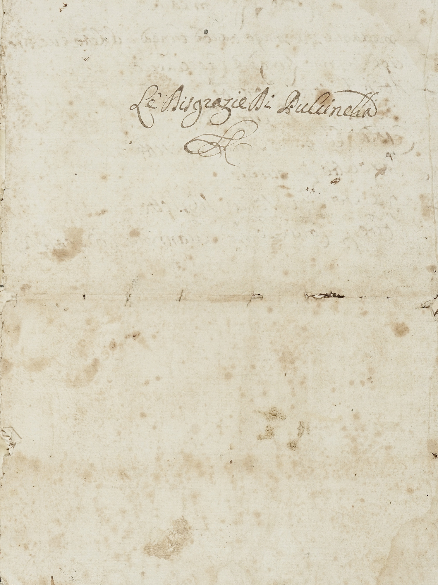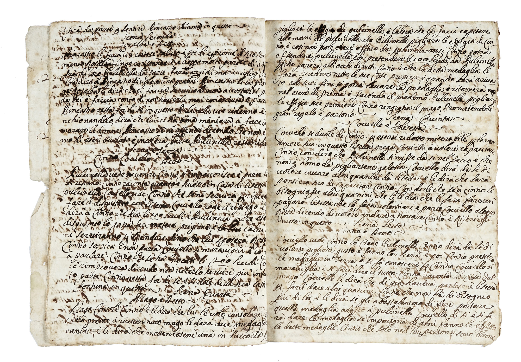 Manoscritto a inchiostro bruno. Carte 8. Testo in italiano. Carta con filigrana. La prima carta staccata dal fascicolo. Alcune bruniture della carta, ma testo comunque abbastanza leggibile. Non presenta brossura o legatura. Dimensioni: 270x200 mm. (1) Canovaccio della commedia che ha come protagonista Pulcinella, uno dei personaggi più celebri della commedia dell'arte. La commedia è suddivisa in 3 atti. I personaggi sono (indicati alla fine del manoscritto): Pulcinella, Rosalba, Cintio, Pincastro, Rosalba, Lisetta, Coviello, Mago. Al verso del frontespizio sono indicate le Robbe per la Comedia: 2 medaglie per il mago barba lunga per il detto e vestito e sottana lunga e cappellaccio – 2 abiti da sbirri e barbe – Prigioni per Pulcinella [...]. Incipit della commedia: Atto Ptimo Scena P.a Pulcinella e Rosalba e Coviello da Parte. Pulcinella dirà a Rosalba perché è venuto in Napoli e Rosalba che lasia di Roma non le si confaceva in questo. Coviello da parte si metterà un fazzoletto in faccia e farrà segno a Rosalba [...].