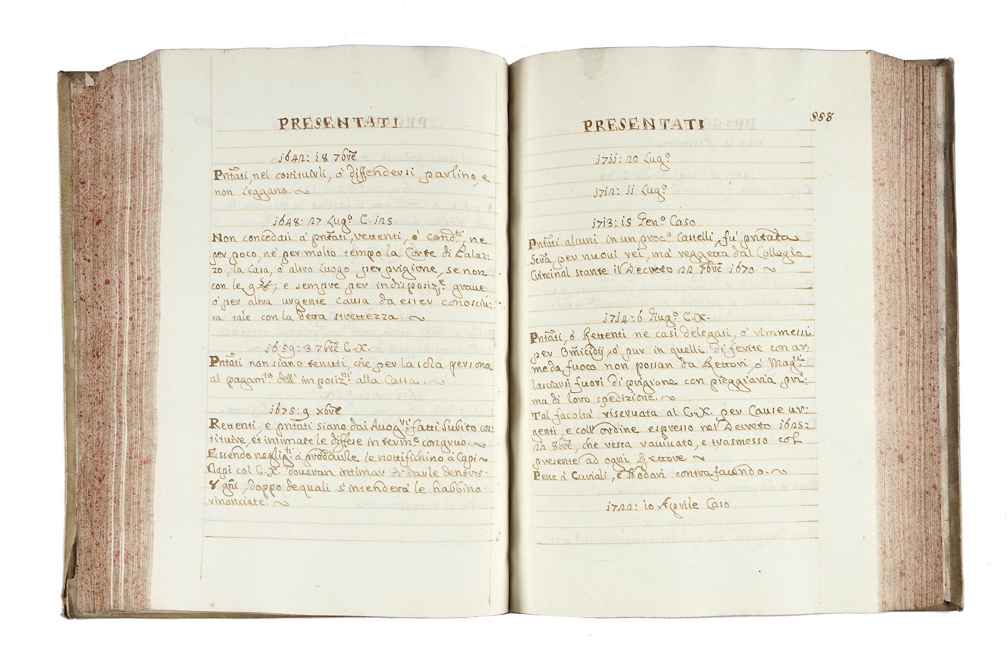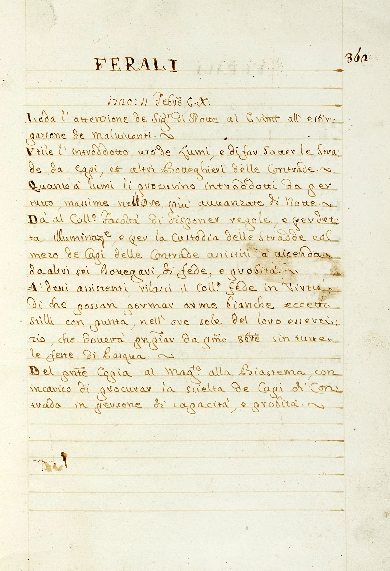 Manoscritto a inchiostro bruno. Carte [1], 262-737 cui seguono alcune carte bianche, mentre l'ultima carta è scritta e contiene i seguenti argomenti: Bandi o altre sentenze, Galera, Camerotto, Inabilità alla Galera, Priggione alla luce. Questo è il secondo volume di due (il primo è mancante). Carte pesanti in ottimo stato. Legatura in pergamena. Dimensioni: 350x245 mm. (1) Interessantissimo manoscritto suddiviso per argomenti in ordine alfabetico (da Ferali a Ziffera). All'interno di ogni argomento sono descritte le leggi per anno di emanazione o i fatti accaduti. Alcuni esempi: Ferali: 11 febbraio 1720. Utile l'introdotto uso de Lumi, e di far batter le strade da Capi et altri Botteghieri delle Contrade. Quanto a Lumi li procurino introdotti da per tutto, massime nelle ore più avanzate di notte [...]. – Fornaci: 10 settembre 1682. Non si possa permetter erezione di Fornaci se non con 4/5 per tre anni al più [...]. – Fusta: 28 novembre 1547. A' Condannati in Galera sin che stavano in prigione, sia dato un pane di più al giorno, si che sian tre [...]. – Guardiani delle prigioni: 10 novembre 1462. Chiavi de Camerati ogni sera sian portate al Doge. 13 aprile 1583. Non lascino parlar a Prigioni senza mandato de Capi. – Guardie dell'Arsenale: 18 marzo 1560: Ogni sera dall'Appuntador sia appontati essi Guardiani per assicurar che vi vadan, ne mandino sostituti. Sian pagati ogni settimana a ragione di soldi otto per notte a cadauno. – Homicidj: 28 marzo 1629. Chiunque sarà ricetto, sponda o favore a chi ammazzerà, o ferirà con arma da taglio, o fuoco alcuno, cada nelle pene dovute ai medesimi delinquenti. In tali casi li vicini d'habitazione, e per passaggio faccino dar subito campana a martello in pena di prigione [...]. Proibito a Barcaroli levar di notte persone non conosciute. – Infermaria: 7 aprile 1564. Essendo conveniente proveder a Prigioni, che amalando non han modo di curarsi [...] ordina di far netar, e profumar imediate tutte le prigioni [...]. Maschere: 21 gennaio 1477. Prohibito l'andar coperti la faccia come mummie. 28 febbraio 1540. Maschere da Santo, o con habiti da Romito prohibite pena un anno di prigione. – Meretrici: 30 giugno 1615. A meretrici prohibito andar in Barca con Batticosso di Felzi alti o bassi, di giorno e notte in maschera o senza. Così l'andar in qualsiasi habito a feste o Nozze di persone Nobili et honeste o sagre, balli di villa, in Chiese, Fiere [...]. Pene cinque anni di prigione, taglio del naso et orecchie e fusta da S. Marco a Rialto. – Monasteri de frati e monache: 15 febbraio 1621. Ne' monasteri de Monache non possan riceversi con soli ordini de capi, donne maritate seben non fosse seguito al loro sposalizio [...]. Morti: 30 giugno 1632. Morto uno in prigione nel tempo in che si leggeva il suo processo, che si continuasse a leggerlo. – Muranesi: 20 dicembre 1627. Prohibita l'estrazione da Venezia per altri luoghi che per Murano della Lume Cattina, Rocca, Ceneri et ogni altra materia necessaria al lavoro de Vetri. Pene a sensali e contraffattori. – Sodomiti: 11 dicembre 1460. Assolto un Puto che uccise chi lo tentava di sodomia. 18 agosto 1462. Ad un accusador falso di sodomia data pena di tagliarli il naso e cavarli un occhio ecc.