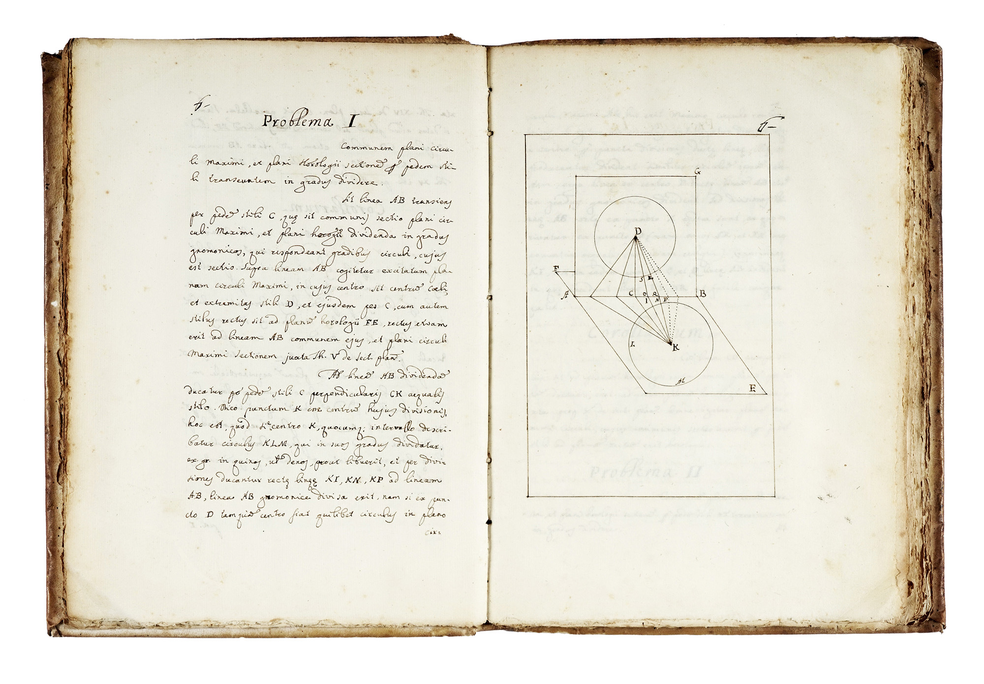 Manoscritto cartaceo a china. Pagine 154 scritte e 60 bianche (la numerazione delle pagg. segue gli argomenti, per cui molti numeri nel testo sono ripetuti). Testo in latino. Il manoscritto contiene 27 disegni geometrici a china, 9 tavole geometriche a china ripiegate e 25 tabelle gnomoniche. Ex Libris manoscritto al foglio di guardia. Legatura coeva in piena pergamena. Condizioni più che buone. Dimensioni 160x220 mm. (1) Pregevole trattato di gnomonica, indispensabile all'epoca per la progettazione e costruzione degli orologi solari. È suddiviso in tre sezioni principali: le sezioni 1 e 2: De horologiis geometrice describendis, comprendono il De Planetorum declinatione theorema; la sezione 3: De horologis mobilibus comprende il De quadrantis constructione atque usu. Il testo propone un gran numero di definitiones, propositiones, theoremi, corollarii, problemi, ecc. Il trattato termina con 25 complesse tabelle gnomoniche, che riportano l'Altitudine solis in horis Italicis, ac Babylonicis con riferimento ai giorni, alle ore ed ai segni zodiacali.