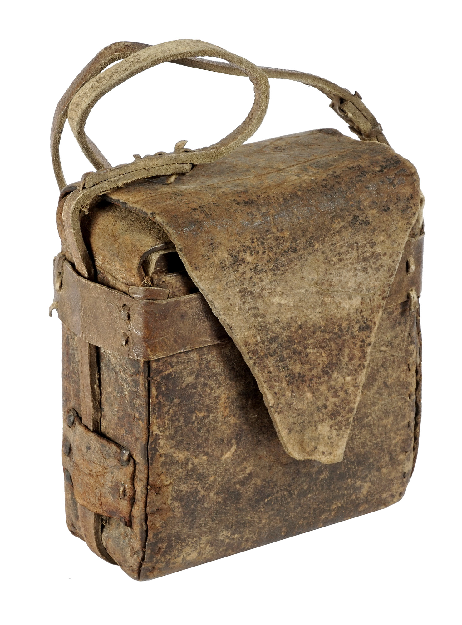 Manoscritto a inchiostro nero e rosso (145x145 mm). Fogli 223. Rigatura dei fogli. Legatura su assi di legno con pelle impressa. Fascicoli un po' slegati. Codice conservato in una piccola e antica borsa in pelle con tracolla conservata. Conservata anche la stoffa originale a protezione dei fogli. (1)