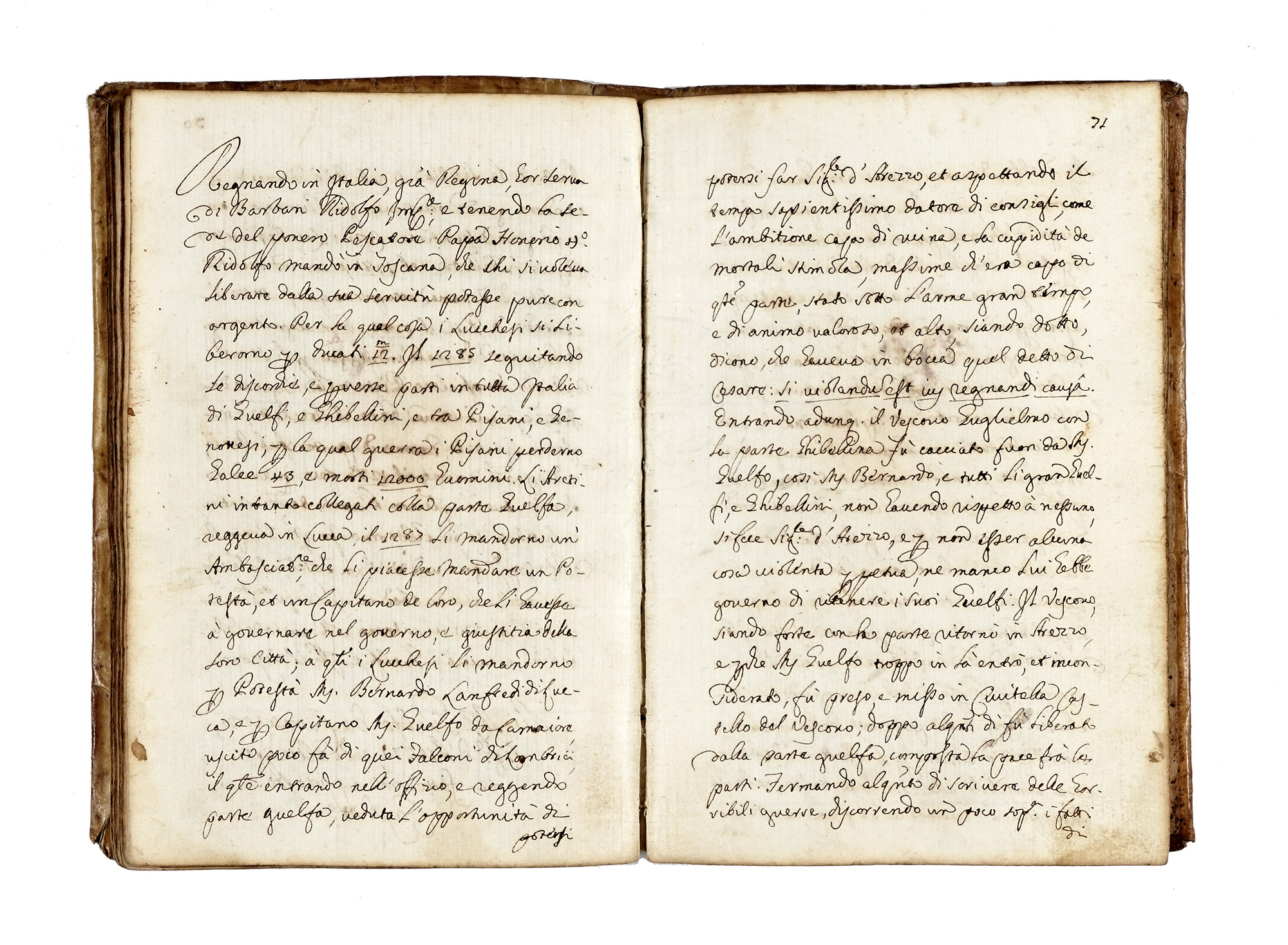 Manoscritto a inchiostro bruno. Carte [1], 153, [5]. Alcune carte con bruniture, ma leggibili. Fascicoli in parte staccati dalla legatura. Legatura in pergamena floscia dell'epoca. Dimensioni: 200x135 mm. (1) La Historia di Camaiore inizia con un Proemio ed è suddivisa in 6 Libri, dal IV secolo d.C. fino al XVI secolo. L'ultimo libro contiene il Corollario e descrive i soldati, gli uomini dotti, i medici, i notai e i grammatici.