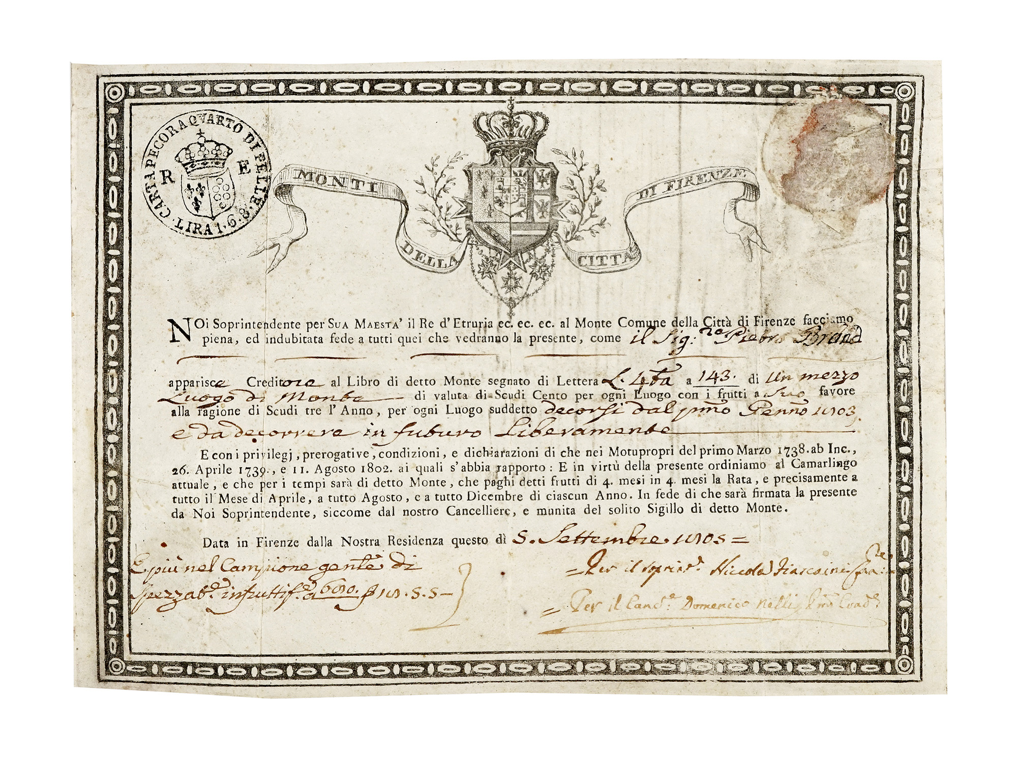 Monte della Città di Firenze. Datato 1805.