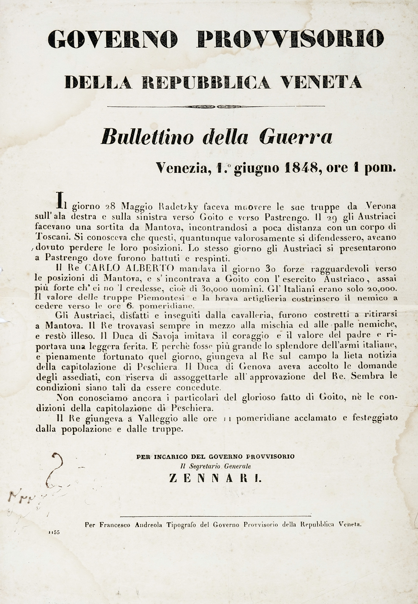 Documenti a stampa. Minime tracce di umidità, ma nel complesso in buono stato. Dimensioni varie (il più grande 410x275 mm ca.). (4) I manifesti vennero stampati a Venezia dalla Tipografia Alvisopoli, dalla Tipografia Rizzi al S. Marco, da Francesco Andreola Tipografo del Governo Provvisorio della Repubblica Veneta e dal Tipografo Fontana. I titolo sono: Venezia non può essere bloccata dall'Austria per mare - Governo Provvisorio della Repubblica Veneta. Bollettino di guerra 1 giugno 1848 - Governo Provvisorio della Repubblica Veneta. Bollettino di guerra 9 luglio 1848 – Notizie di Marghera del cannoneggiamento del 29-30 corr. e del Parlamento Tedesco. Venezia, 31 ottobre 1848.
