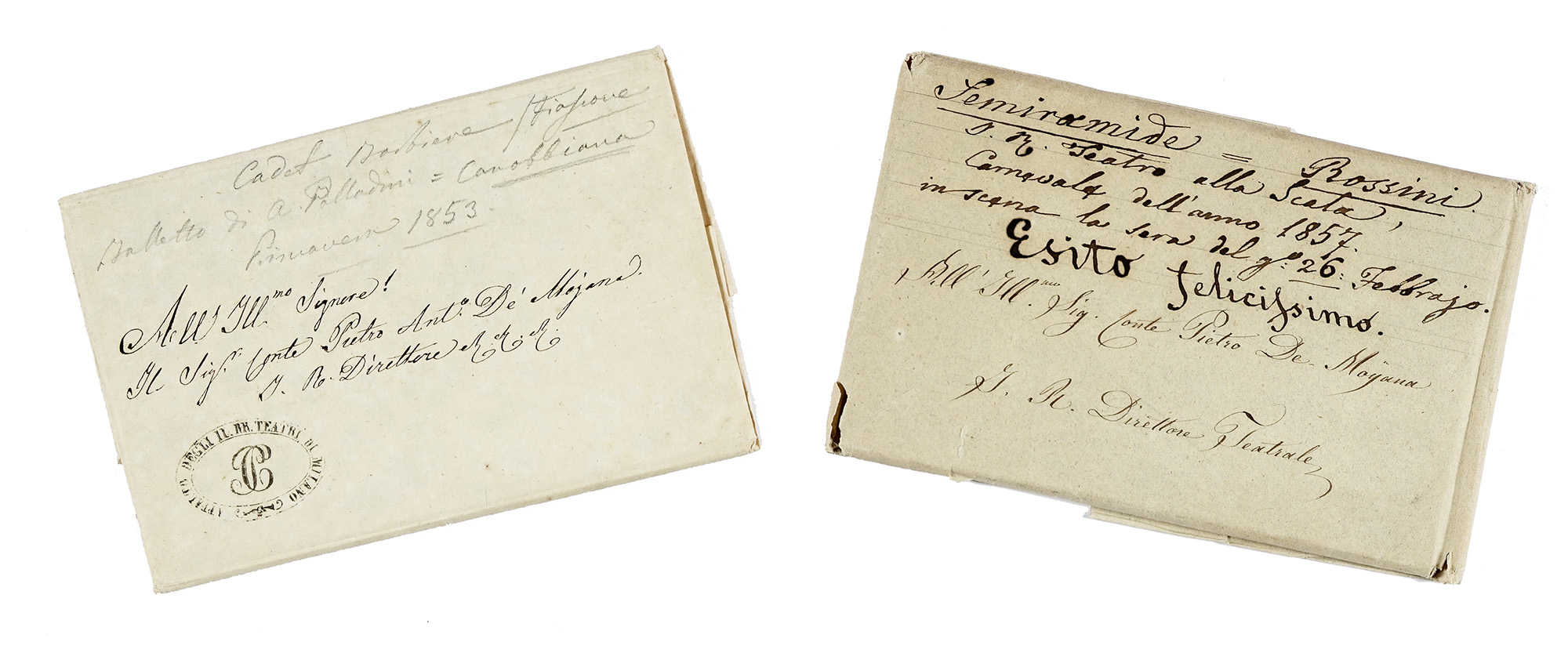 2 libretti inviati all’impresario conte Pietro Antonio de' Mojana, direttore teatrale alla Scala. Metà del XIX secolo.