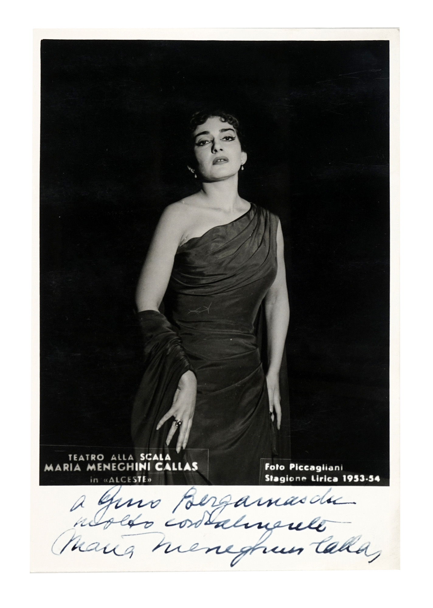 Callas Maria, Ritratto fotografico con abiti di Alceste con dedica e firma autografa. Non datato, ma 1953-54.
