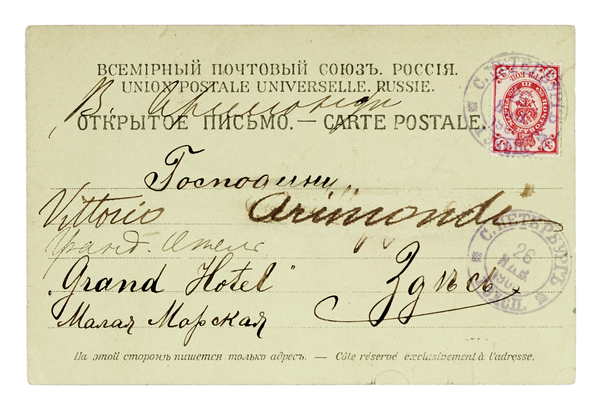Caruso Enrico, Cartolina postale viaggiata, autografa firmata, inviata al basso Vittorio Arimondi. S. Pietroburgo 1900.
