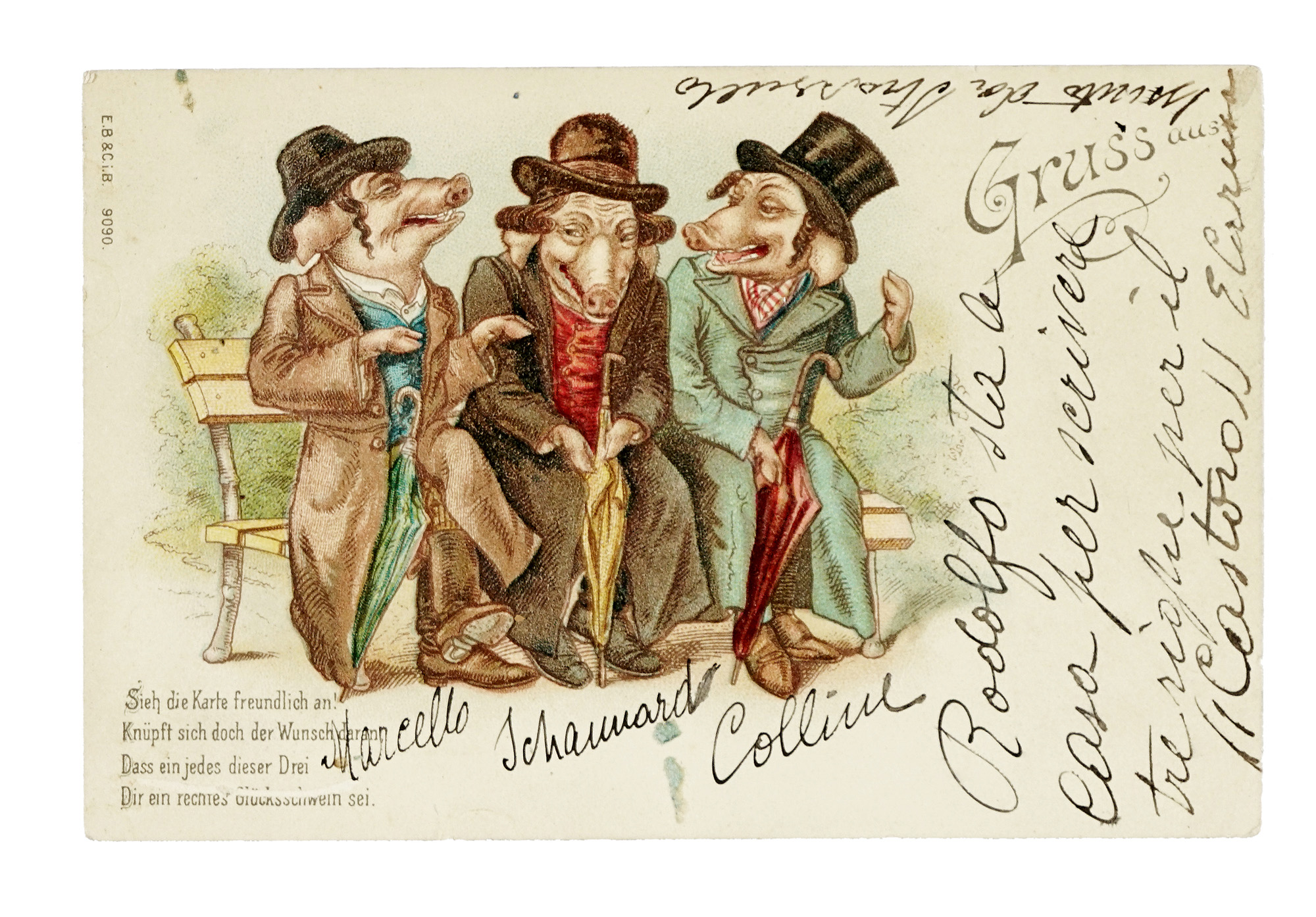 Manoscritto a inchiostro nero. La cartolina raffigura tre porcellini. Dimensioni 90x140 mm. (1) Caruso scrive: Rodolfo sta a casa per scrivere tre righe per il Castori. E. Caruso. Nel 1900 Caruso venne invitato a S. Pietroburgo in Aida, Un ballo in maschera, Maria di Rohan, Manon, Tosca e per cantare nello Stabat Mater di Rossini.