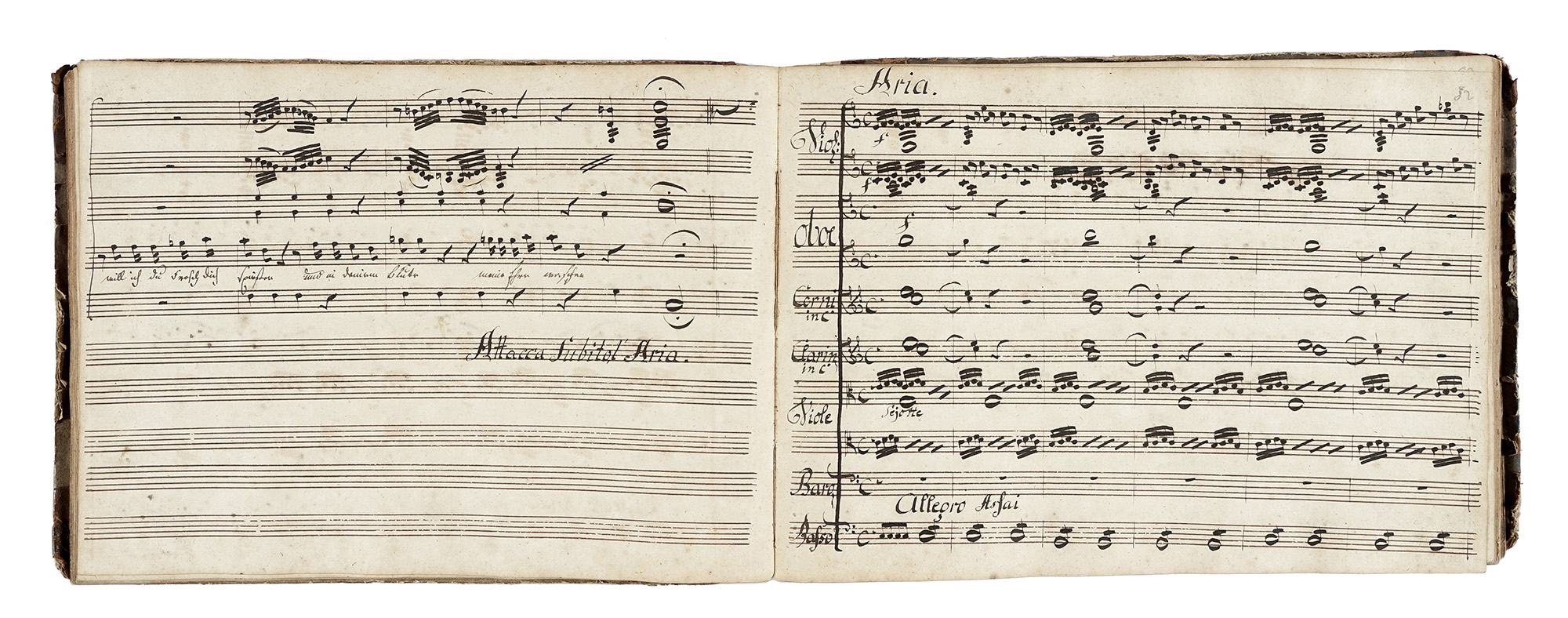 Manoscritto musicale a inchiostro bruno. Pagine 100 e 49 (numerazione indicata) a matita da mano moderna. Partitura. Al piatto è indicato, in tedesco, il titolo, il numero degli atti, il nome dell'autore e l'indicazione Mad. Waser. Al contropiatto, a inchiostro bruno in carattere minuscolo, "von Theater in Breslav". Carte ben conservate (sono state tagliate 4 carte, ma il testo musicale appare integro). Legatura dell'epoca in mezza pelle con angoli (alcuni segni del tempo). Dimensioni: 230x320 mm. (1) Singspiel in 2 atti composto da Francesco Zannetti (1737-1788). Originariamente l'opera aveva il titolo di Le lavandrine e venne rappresentata la prima volta al Teatro Capranica di Roma nel 1772. Si conoscono 2 rappresentazioni della versione tedesca a Dresda (1774) e Lipsia (1781).