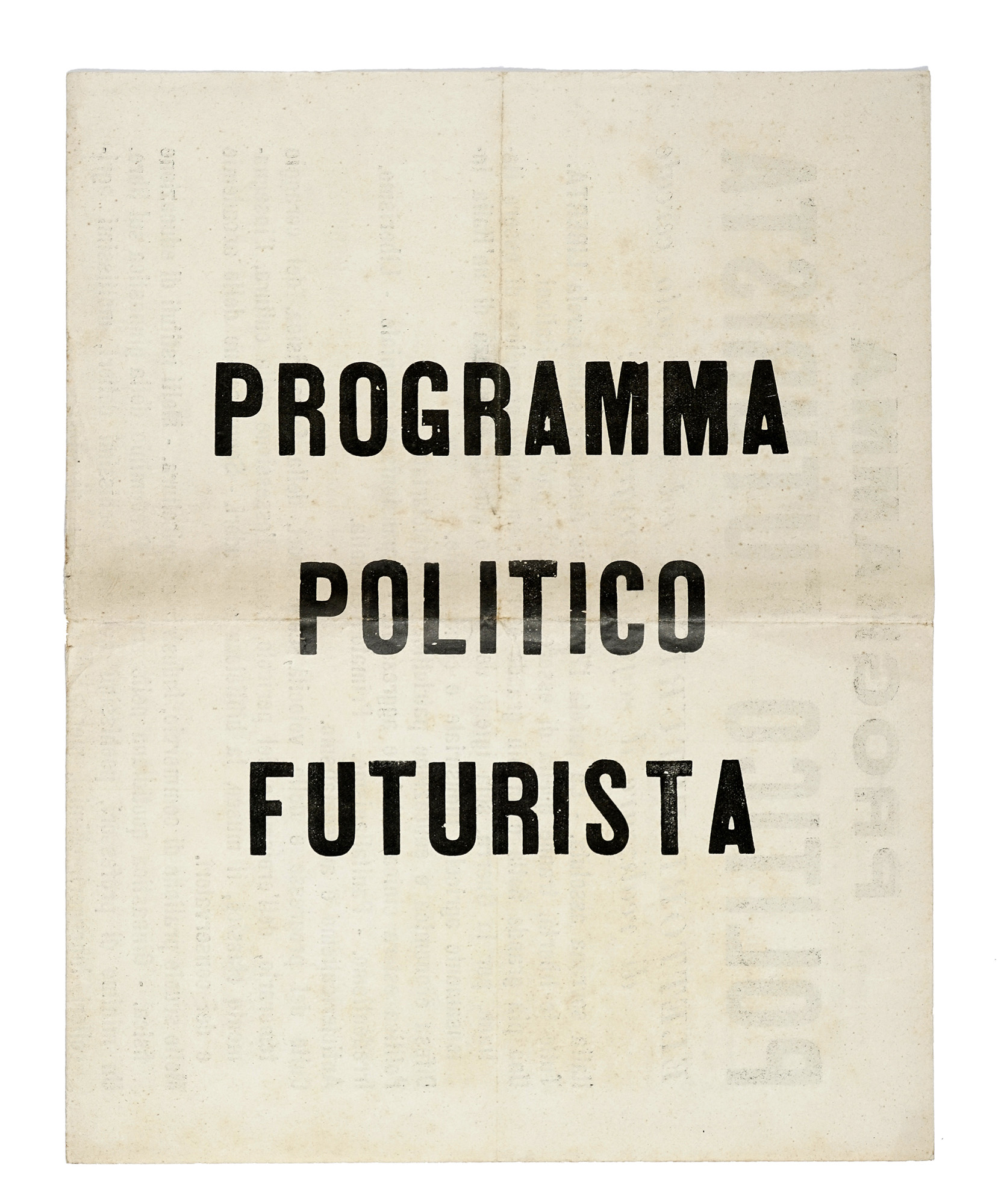 In-4° (chiuso: mm 290x230; aperto: 460x290 ca.). Carte [2]. Segni centrali di precedenti piegature e fioriture sparse. (1) Prima edizione in formato grande di questo manifesto-locandina, sottoscritto da Marinetti, Boccioni, Carrà e Russolo, pubblicato in 3 versioni con identica data di redazione (11 ottobre 1913): una stampata dalla Direzione del Movimento Futurista in nero su fondo chiaro (come il presente esemplare) e due stampate dalla Direzione della Sezione Futurista Siciliana, di cui una in nero su fondo rosso e l'altra, in formato ridotto, stampata in nero su fondo verde. Futurismo (catalogo di vendita n. 100). Firenze: Libreria Salimbeni, 1991, 318; Tonini, Manifesti, 66.1.