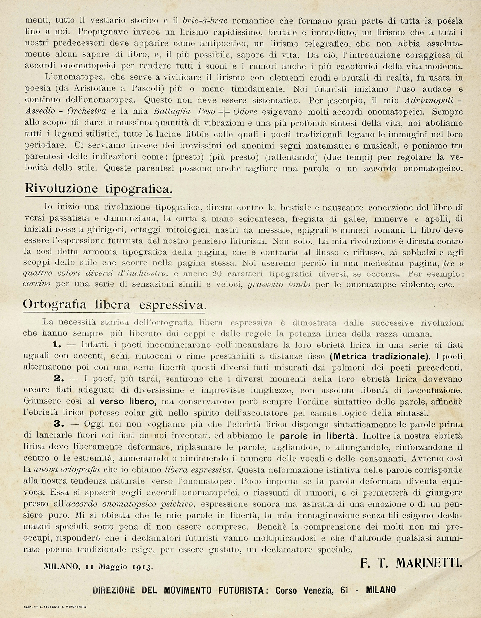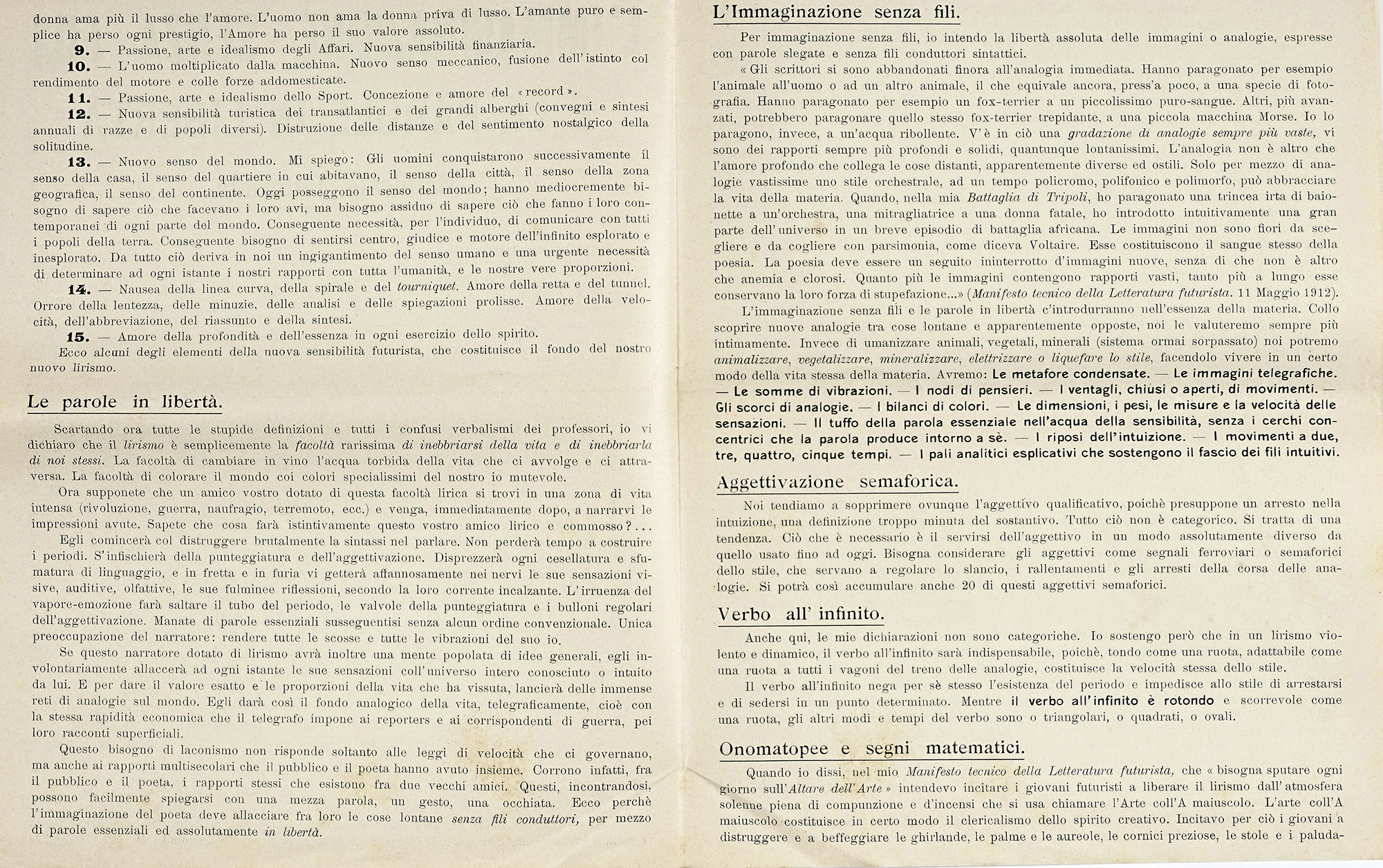 Marinetti Filippo Tommaso, L’immaginazione senza fili e le parole in libertà. Milano: Direzione del Movimento Futurista (Tip. A. Taveggia), 11 maggio 1913.