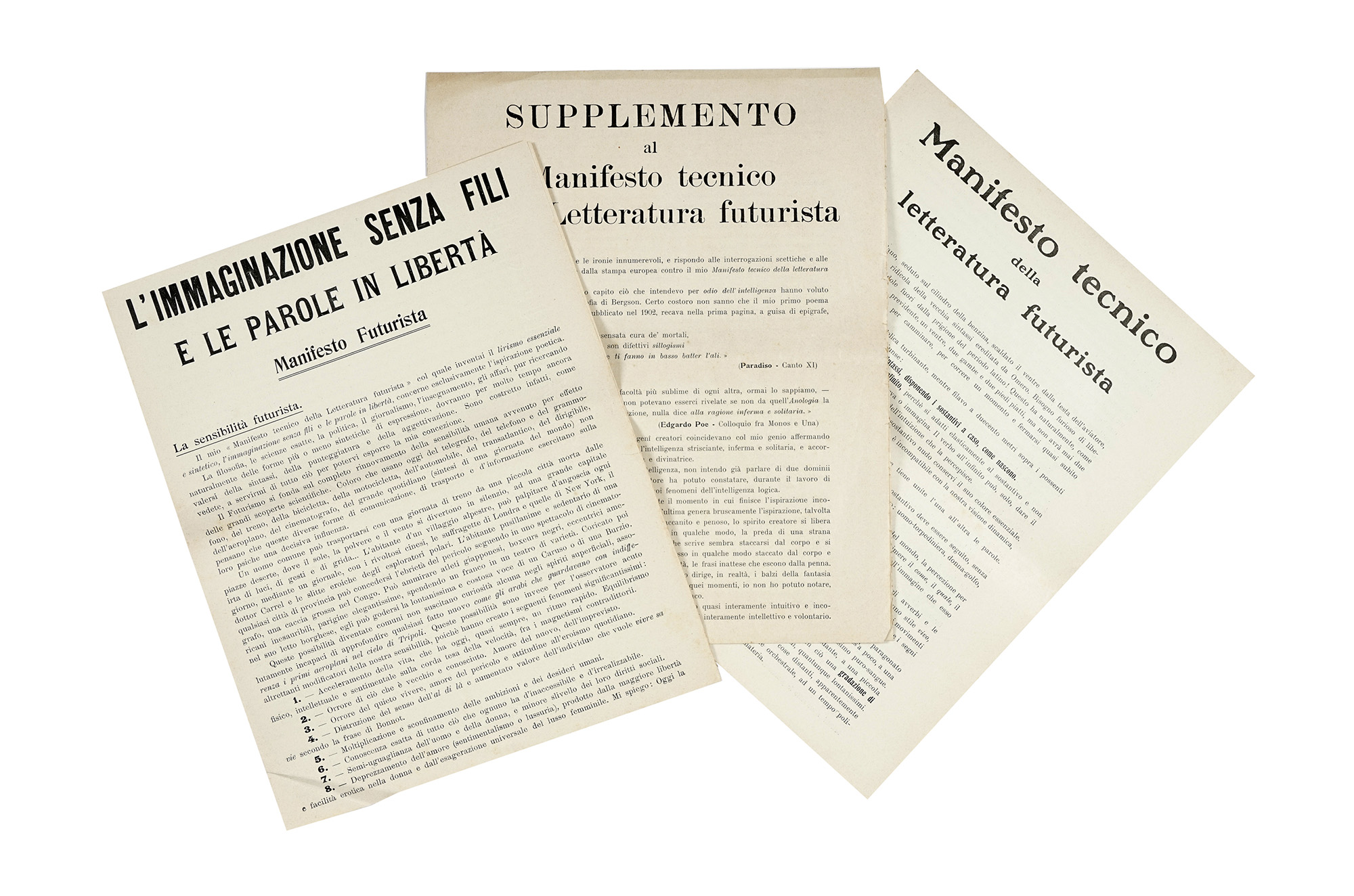 In-4° (mm 290x230). Carte [2]. Segno centrale di precedente piegatura, lievi fioriture sparse e una piega marginali alla prima carta, ma nel complesso buon esemplare. SI AGGIUNGE: Id., Manifesto tecnico della letteratura futurista. Milano: Direzione del Movimento futurista, 11 maggio 1912. In-4° (mm 290x230). Carte [2]. Segno centrale di precedente piegatura e lievi fioriture sparse, altrimenti ottima conservazione. SI AGGIUNGE: Id., Supplemento al Manifesto tecnico della Letteratura futurista. Milano: Direzione del Movimento futurista, 11 agosto 1912. In-4° (mm 290x230). Carte [2]. Segno centrale di precedente piegatura, lievi e diffuse fioriture e strappetti marginali. (3) I OPERA: Prima edizione integrale, in lingua italiana, di questo manifesto, in cui «si puntualizzano molti dei concetti già apparsi nel Manifesto tecnico della letteratura futurista: La sensibilità futurista, Le parole in libertà, L'immaginazione senza fili, L'aggettivazione semaforica, Verbo all'infinito...» (Futurismo (catalogo di vendita n. 100). Firenze: Libreria Salimbeni, 1991, 314); Futurismo (catalogo di vendita n. 43). Gussago (BS): L'Arengario Studio Bibliografico, 2001, 46; Tonini, Manifesti 58.1; Echaurren Pablo, Futurismo. Collaudo 1909-2009 (catalogo di vendita). Milano: Libreria Antiquaria Pontremoli, 2009, 63. II OPERA: Rara edizione originale, particolarmente importante dal punto di vista letterario, in cui Marinetti precisa gli strumenti con cui il futurismo vuole scardinare lo stile del passato e creare la letteratura dell'avvenire, teorizzando l'uso ardito dell'analogia e abolendo le congiunzioni. Futurismo (catalogo di vendita n. 100). Firenze: Libreria Salimbeni, 1991, 306; Futurismo (catalogo di vendita n. 43). Gussago (BS): L'Arengario Studio Bibliografico, 2001, 42; Echaurren Pablo, Futurismo. Collaudo 1909-2009 (catalogo di vendita). Milano: Libreria Antiquaria Pontremoli, 2009, 50. III OPERA: Raro manifesto di risposta alle critiche suscitate dal precedente, che «oltre agli otto punti di supplemento, [...] ospita la parolibera Battaglia. Peso + odore» (Echaurren Pablo, Futurismo. Collaudo 1909-2009 (catalogo di vendita). Milano: Libreria Antiquaria Pontremoli, 2009, 55); Cammarota, 16; Futurismo (catalogo di vendita n. 100). Firenze: Libreria Salimbeni, 1991, 307; Futurismo (catalogo di vendita n. 43). Gussago (BS): L'Arengario Studio Bibliografico, 2001, 44.