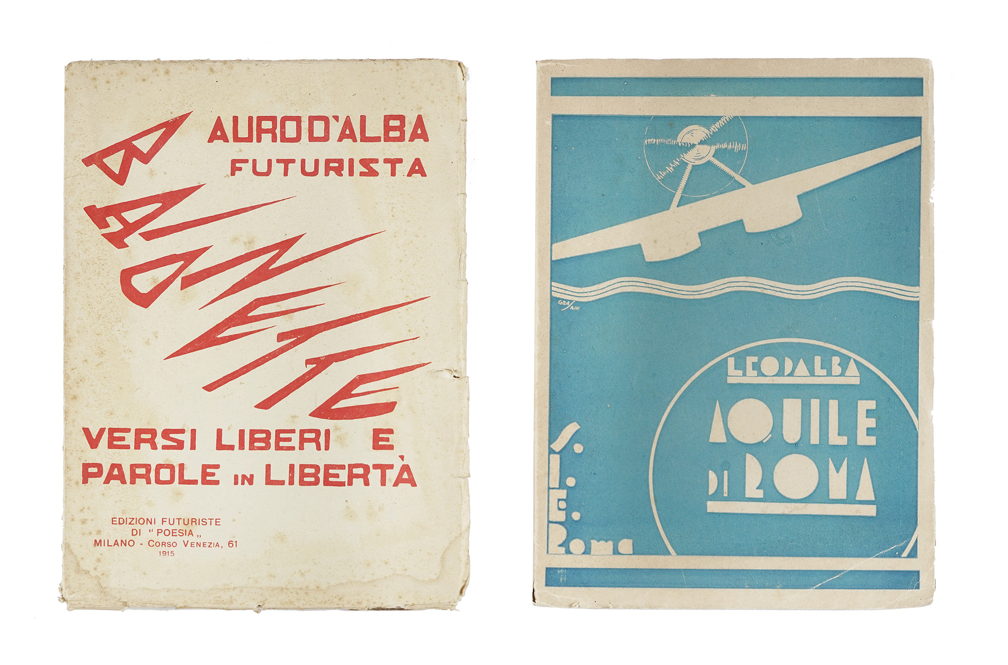 In-8° (mm 225x160). Pagine 140, [4]. Esemplare in barbe, con lievi e uniformi bruniture marginali e rarissime fioriture. Brossura originale con una composizione parolibera in rosso di Filippo Tommaso Marinetti al piatto anteriore e titoli al dorso. Fioriture ai piatti, gora e strappetti marginali e dorso parzialmente staccato. SI AGGIUNGE: Maraffa Abate Salvatore, Aquile di Roma. Roma: S.I.E., [1935]. (2) I OPERA: Rara e ricercata prima edizione, con una composizione parolibera in rosso di Filippo Tommaso Marinetti. Cfr. Gambetti-Vezzosi 238.
