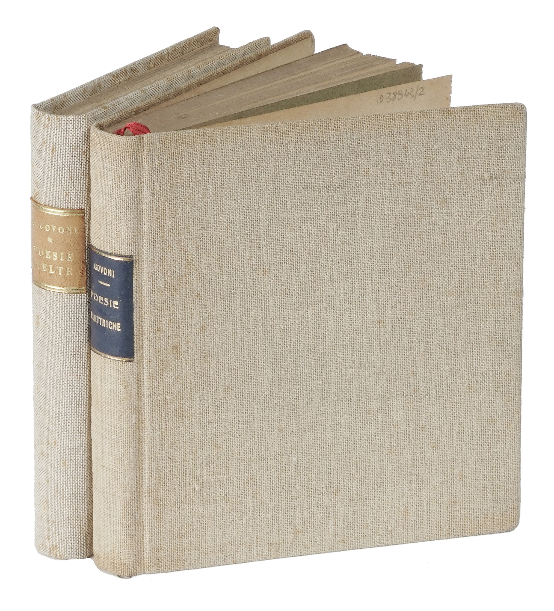 In-16° (mm 187x170). Minime tracce d'uso, ma nel complesso buona copia. Legatura successiva in piena tela con titoli in oro su tassello al dorso; conservati all'interno i piatti della brossura originale verde con titoli in rosso. Formato quadrotto "a mattonella", tipico dei volumi delle Edizioni futuriste di Poesia. SI AGGIUNGE: Id., Poesie scelte. Ferrara: Taddei, 1918. Legatura moderna in piena tela, con titoli in oro su tassello al dorso. (2) I OPERA: Prima edizione, in gran parte originale, di questa rara raccolta di poesie versolibere, che segna l'esordio di Govoni con la casa editrice di Marinetti, la stessa che nel 1915 darà alle stampe suo capolavoro futurista 'Rarefazioni e parole in libertà'. II OPERA: Prima edizione in raccolta, con alcune poesie inedite (incluse alcune liriche del periodo futurista). Cfr. Cammarota, 249.16; Gambetti-Vezzosi 397; Salaris 41.