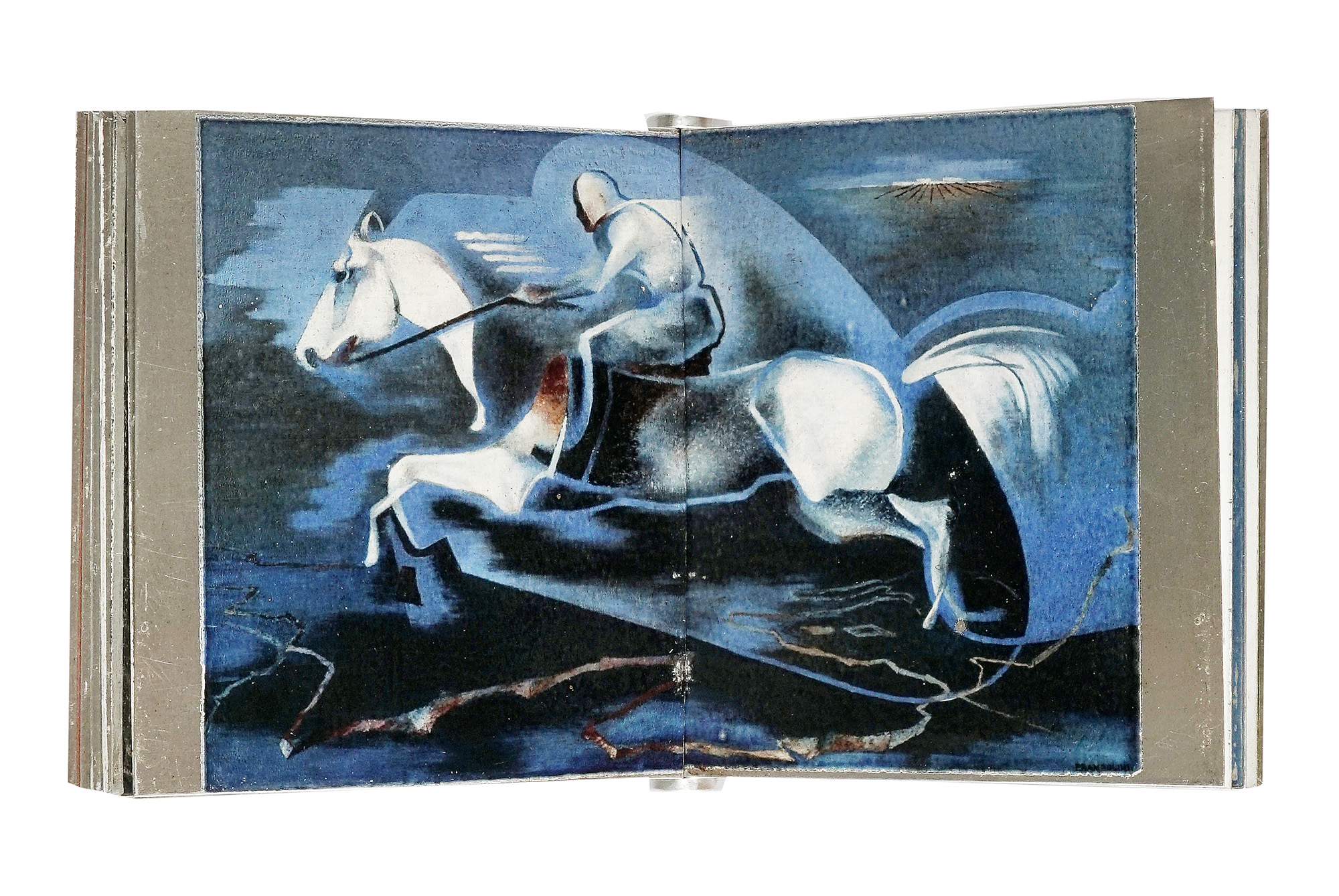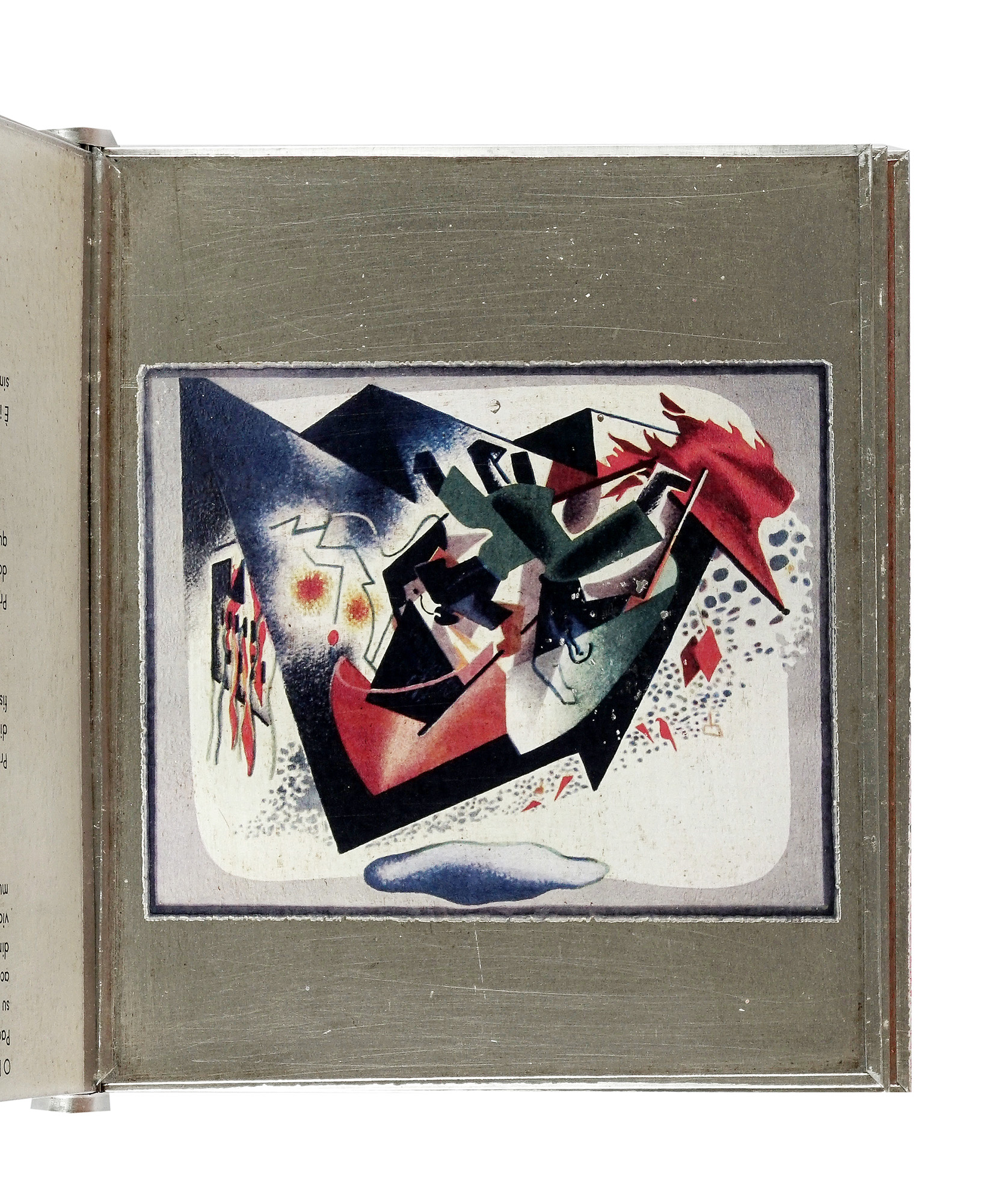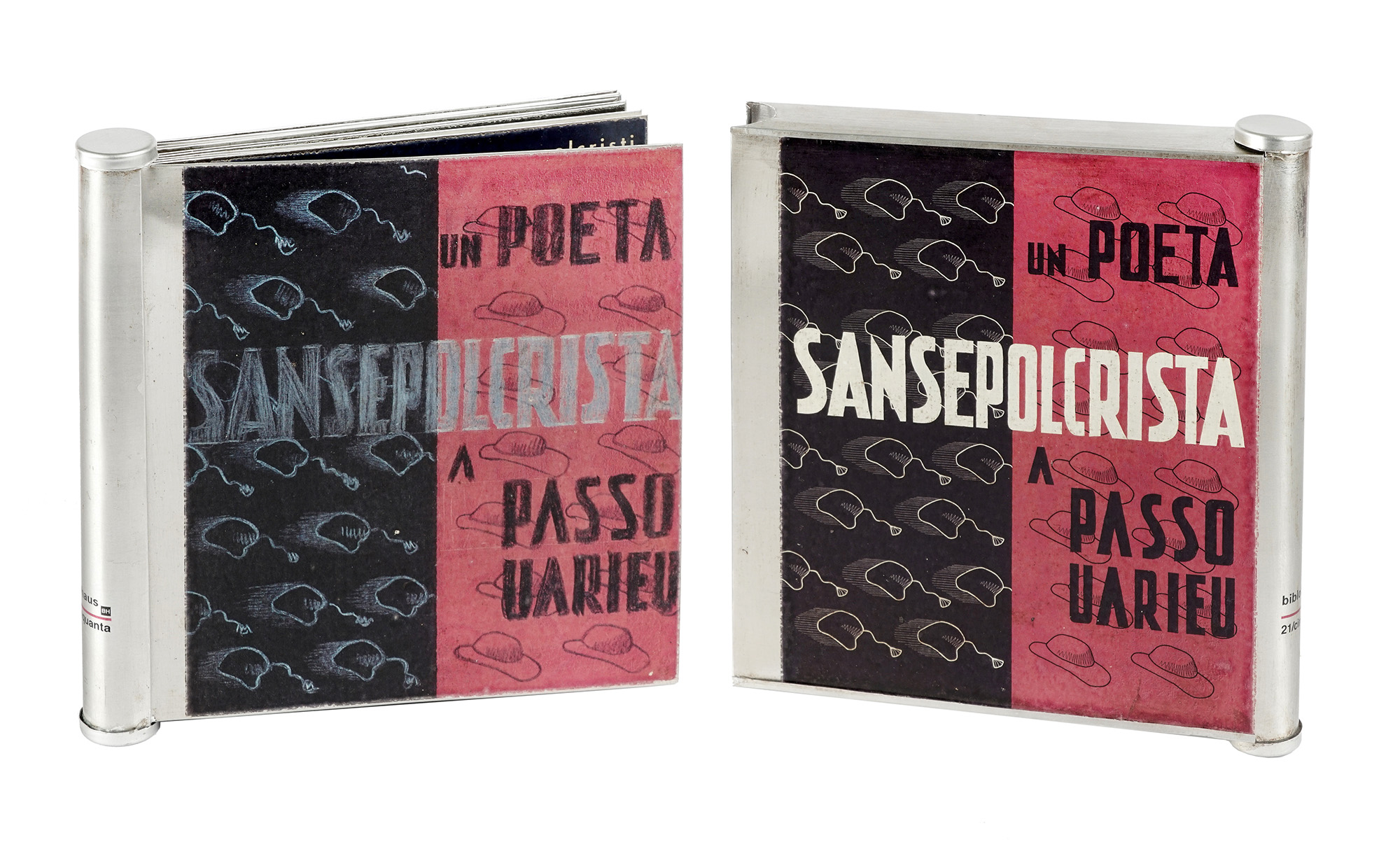 In-8° (mm 190x170). Carte [10] in metallo, illustrate recto/verso, con la riproduzione delle opere di Prampolini e Thayaht, con testo a fronte. Legatura in metallo con piatto anteriore illustrato, entro cofanetto in metallo coordinato. Con 1 carta di facsimile della rivista Futurismo, a descrizione dell'opera, allegata sciolta. Il tutto entro scatalora editoriale in carta con riproduzione applicata al piatto. Esemplare 21/50. (2) Tutti i collezionisti di rari reperti bibliografici del '900, conoscono – almeno di fama – le due celebri litolatte futuriste: Parole in libertà Olfattive Tattili-Termiche di F. T. Marinetti (4 novembre 1932), illustrate da Tullio D'Albisola, e L'Anguria lirica (lungo poema passionale) dello stesso Tullio D'Albisola (agosto 1934), illustrata da Bruno Munari. Solo pochi specialisti della materia però, ricordano che all'epoca fu progettata e messa in cantiere anche una terza opera poetica in litolatta, destinata ad essere stampata sempre dall'industria lattoniera di Vincenzo Nosenzo a Zinola; il titolo di quest'opera in lavorazione era I Sansepolcristi, un aeropoema sintetico e parolibero di Marinetti, dedicato all'esaltazione lirica della tristemente celebre Adunata di Piazza San Sepolcro (1919)...» (dal testo di Domenico Cammarota).