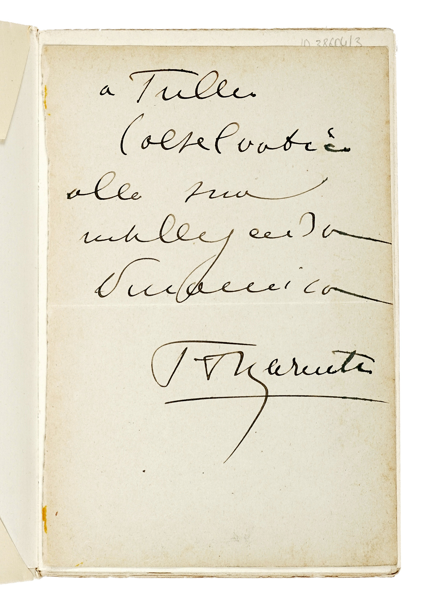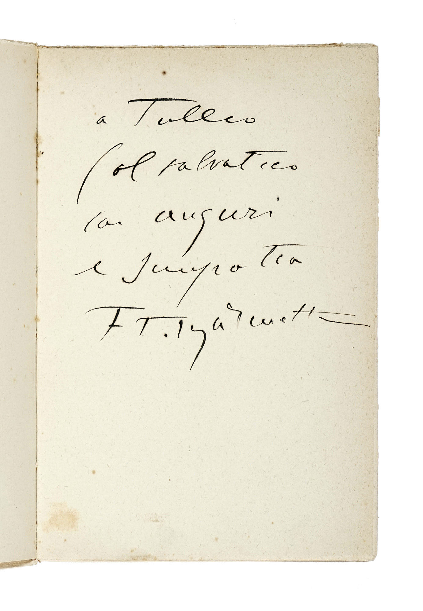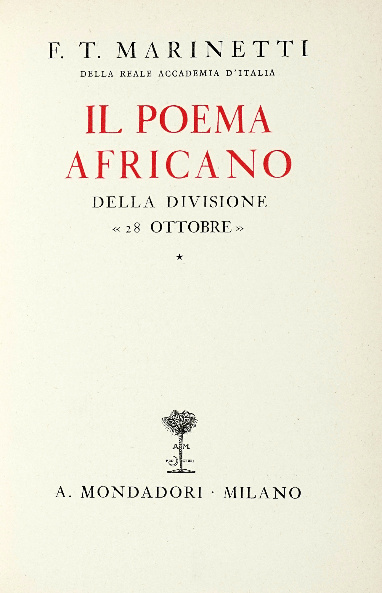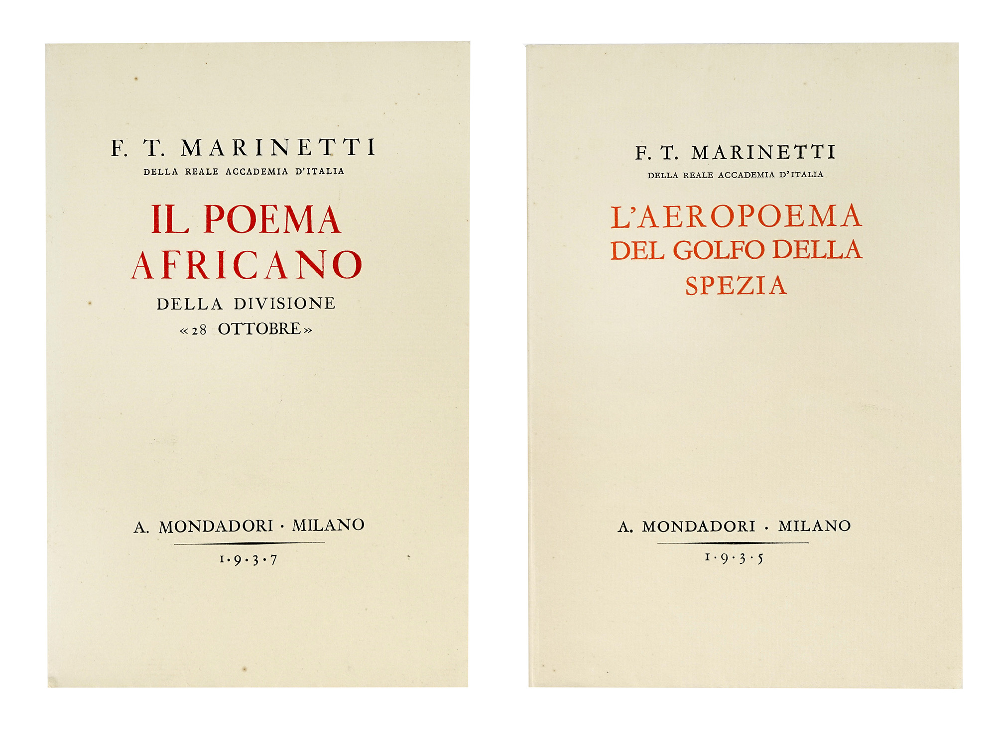 In-8° (mm 192x125). Pagine [2], 127, [7]. Lievissime e rare fioriture, altrimenti ottimo esemplare in barbe. Esemplare numerato, come da timbro a secco all'occhietto, altro timbro a secco alla stessa carta e iniziali S.S. traforate al frontespizio e alla carta successiva. Brossura editoriale alla francese con sovraccoperta risvoltata a tamburo, con titoli in rosso e nero al piatto anteriore. Dedica autograda di Marinetti a Tullio Colselvatico. SI AGGIUNGE: Id., Il poema africano. Milano: A. Mondadori, [1937]. In-8° (mm 190x130). Pagine 319, [1]. Marca editoriale al frontespizio in rosso e nero. Carta di occhietto quasi completamente staccata, ma presente e ben conservata, altrimenti ottimo esemplare intonso, perfettamente conservato nelle sue barbe. Brossura editoriale alla francese con sovraccoperta risvoltata a tamburo, con titoli in rosso e nero al piatto anteriore. SI AGGIUNGE: Foglio sciolto, con la dedica autografa di Marinetti a Tullio Colselvatico al recto. (3) I OPERA: Prima edizione aumentata, dopo l'opuscoletto di 32 pagine del 1933, che include anche nella prefazione il manifesto dell'aeropoesia. La prima importante opera di aeropoesia, rara a trovarsi in così perfette condizioni come il nostro esemplare. Cfr. Cammarota, Marinetti 189; Gambetti-Vezzosi 520. II OPERA: Rara prima edizione in prima tiratura, datata 15 febbraio, come si evince dal verso dell'ultima carta. Buona parte della tiratura originale fu ritirata in blocco dalla SNIA VISCOSA per farne dono ai combattenti: questo rese necessaria la pronta ristampa del libro, che avvenne con una seconda tiratura, molto più comune, nel maggio 1937. «Il poema africano» è una importante raccolta di poemi simultanei di guerra, dedicata «Ai futuristi volontari della guerra veloce», che in gran parte erano stati pubblicati sulle colonne della Gazzetta del popolo, quotidiano torinese con il quale Marinetti aveva collaborato attivamente l'anno precedente.