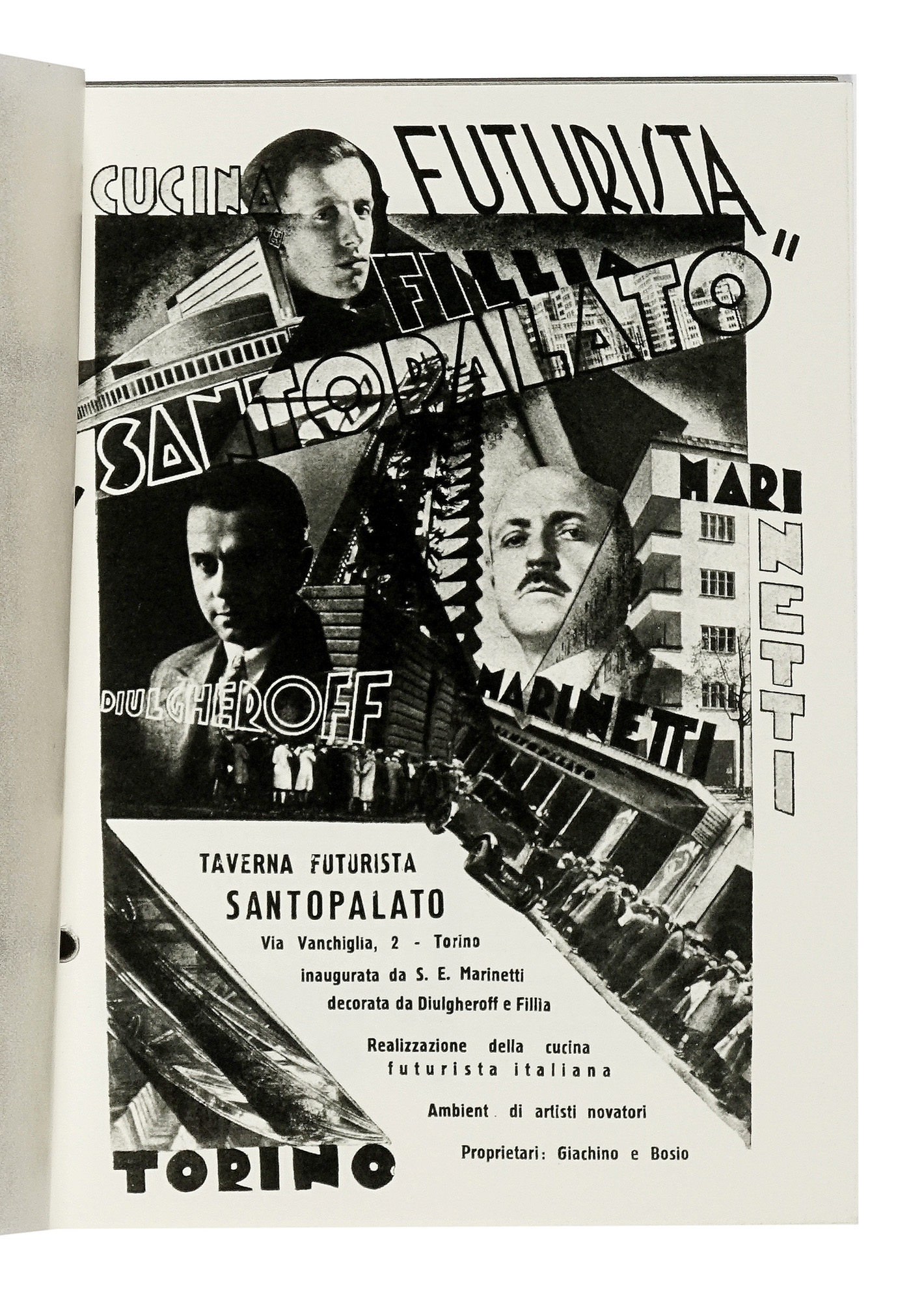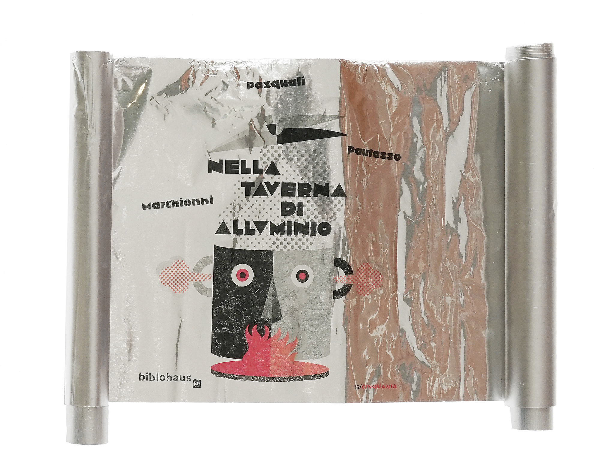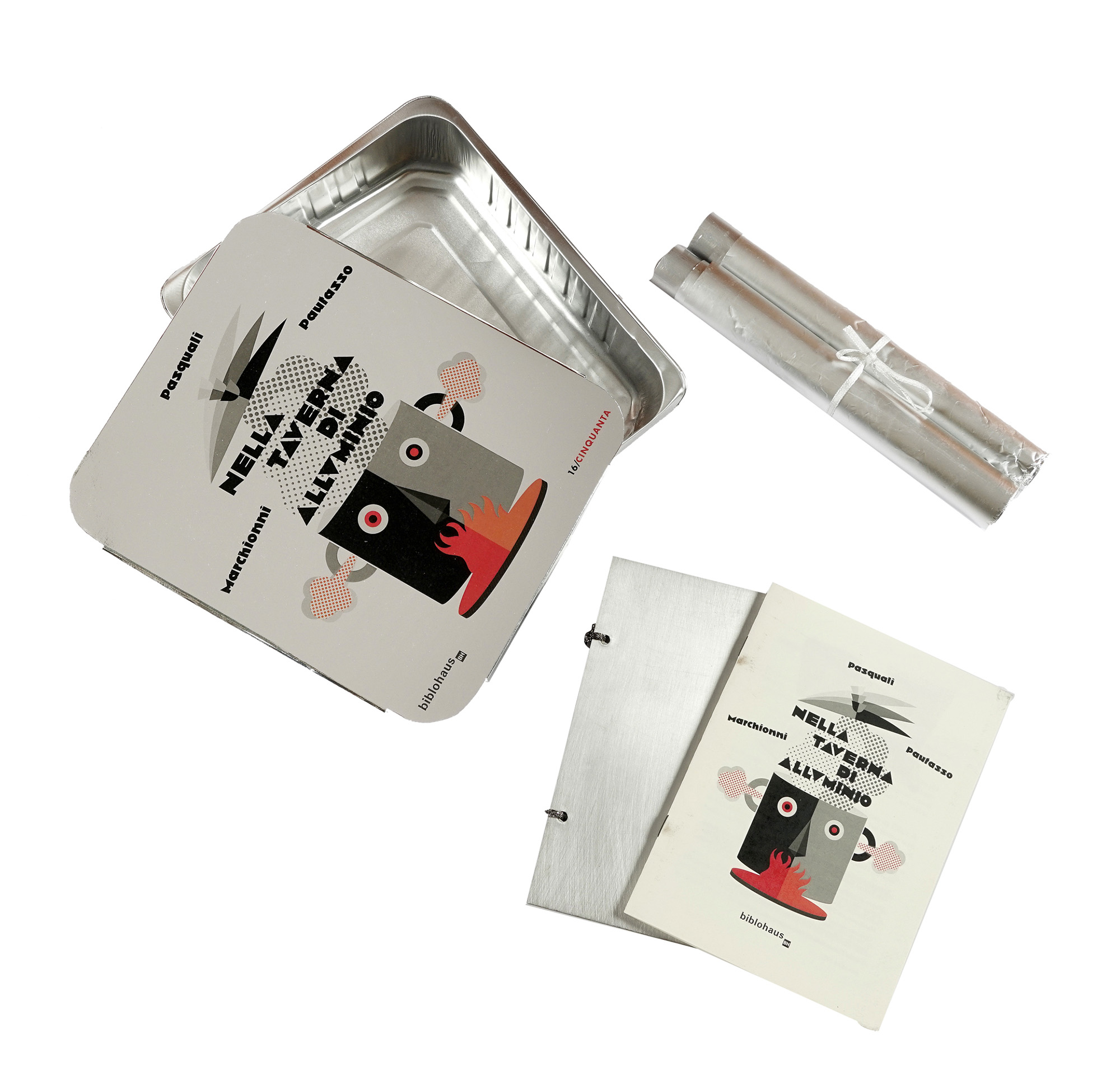 1 vaschetta in alluminio, destinato alla conservazione degli alimenti, con coperchio stampato (mm 235x200) contenente: 1) la ristampa anastatica del Lista vivande, con copertina in metallo della Taverna Santopalato (mm 185x135); 2) rotolo di alluminio per cucina con l'articolo Dal Brodo solare al Pollo d'acciaio nella taverna futurista di Santopalato, apparso per l'inaugurazione del ristorante futurista nel «Corriere di Napoli» l'11 marzo 1931, profusamente illustrato da Valentina Marchionni, contenuto entro sacchetto trasparente per alimenti; 3) Nella taverna di alluminio, opuscolo illustrato, con uno scritto di Guido Andrea Pautasso; 4) guanti bianchi in cotone. Il tutto perfettamente conservato entro scatola editoriale illustrata al piatto anteriore. Esemplare 16/50. (4) L'8 marzo 1931 venne inaugurato a Torino il primo ristorante futurista, la Taverna Santopalato, descritta da Fillìa e Marinetti ne La cucina futurista, ristrutturato in chiave futurista dallo stesso Fillìa e da Nicolay Diulgheroff, che rivestirono le pareti con dell'alluminio e arredarono il locale con uno stile minimalista anti-decorativo. In occasione del novantesimo anniversario della pubblicazione del libro La Cucina futurista, Biblohaus ha reso omaggio al genio gastronomico futurista, con la ristampa anastatica della lista delle vivande in metallo della Taverna Santopalato e dello spiritoso articolo Dal Brodo solare al Pollo d'acciaio nella taverna futurista di Santopalato, apparso sul Corriere di Napoli per l'inaugurazione del ristorante, stampato su rotolo d'alluminio da Simone Pasquali e graficamente reinterpretato da Valentina Marchionni.
