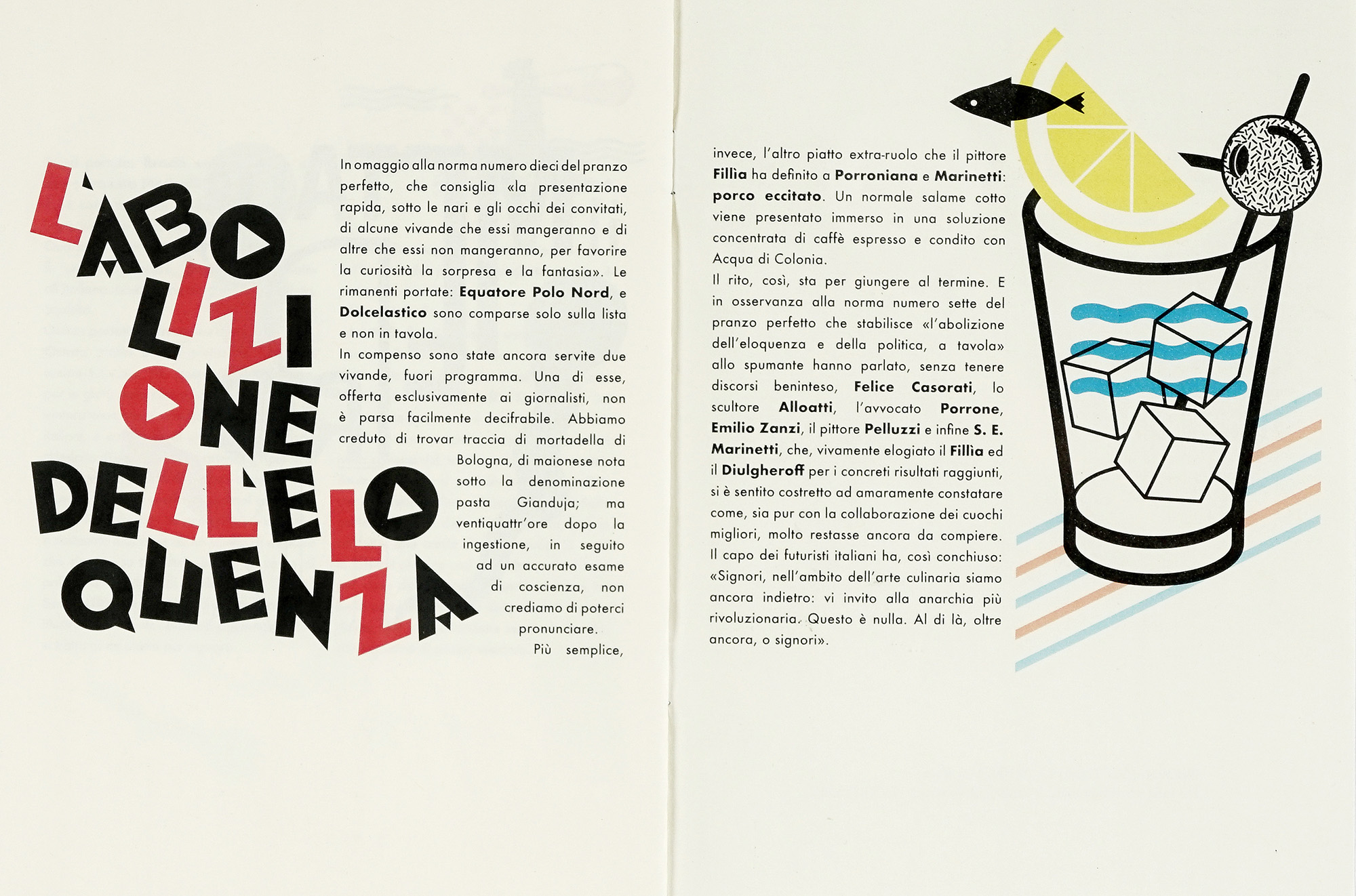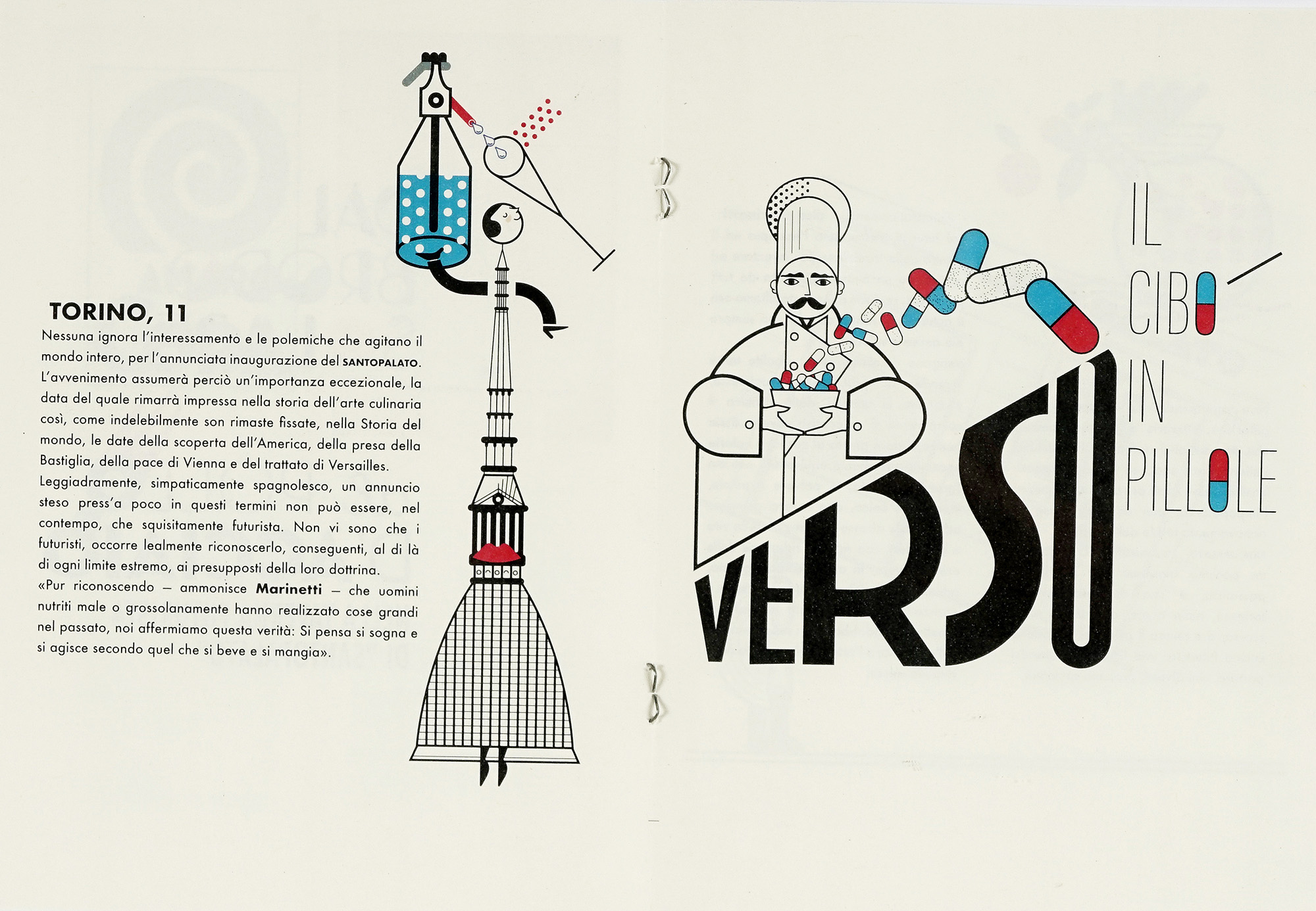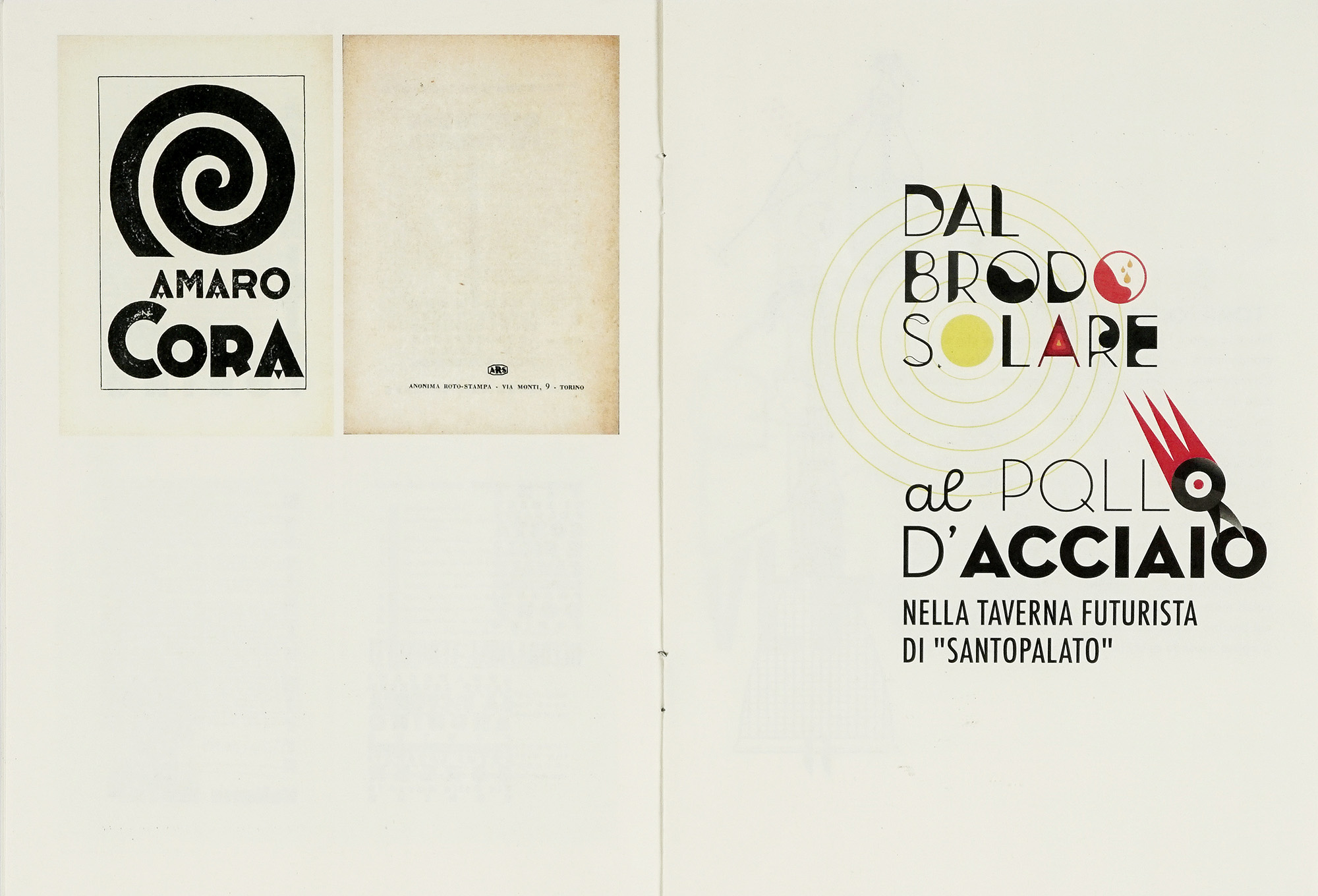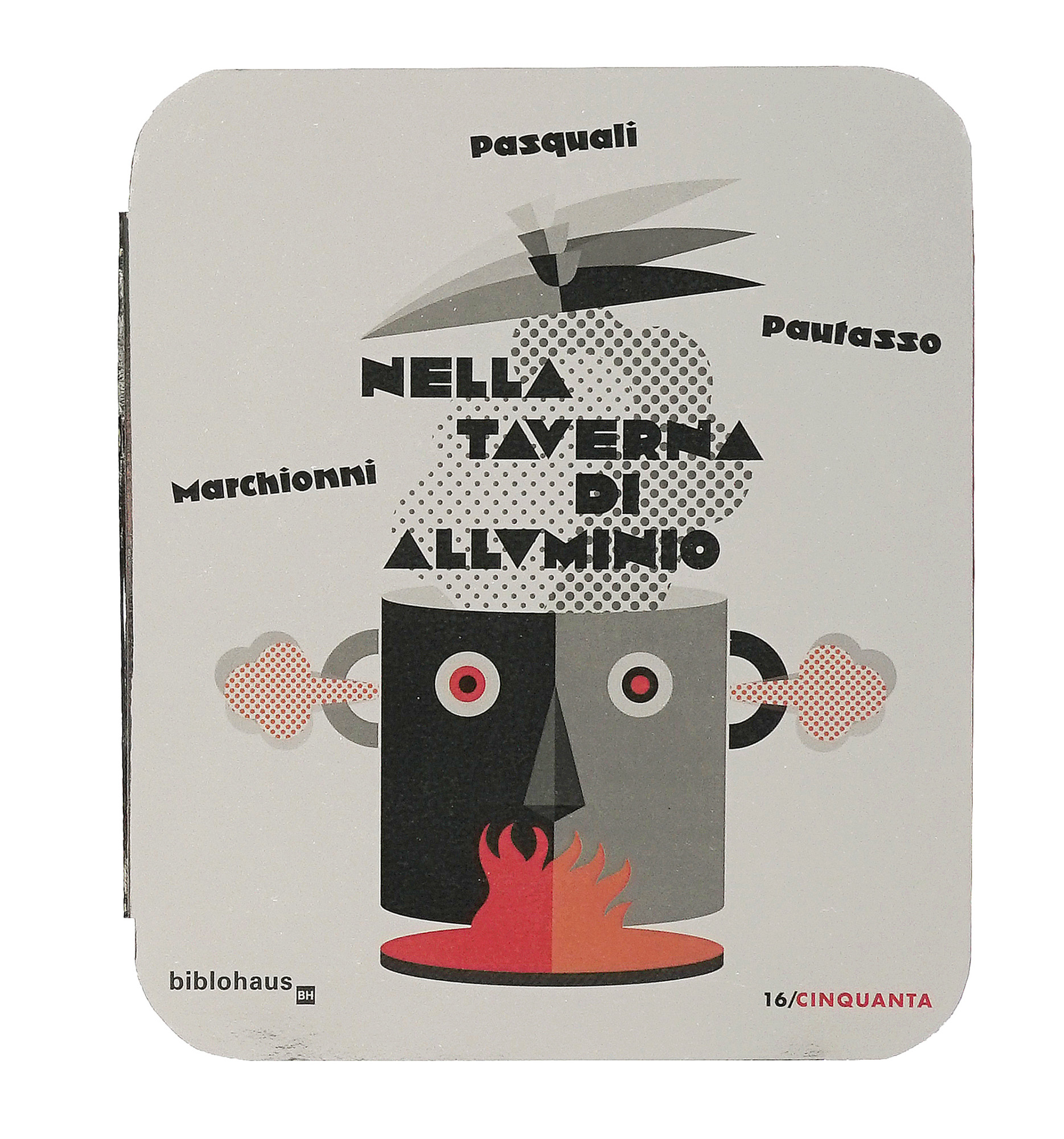 1 vaschetta in alluminio, destinato alla conservazione degli alimenti, con coperchio stampato (mm 235x200) contenente: 1) la ristampa anastatica del Lista vivande, con copertina in metallo della Taverna Santopalato (mm 185x135); 2) rotolo di alluminio per cucina con l'articolo Dal Brodo solare al Pollo d'acciaio nella taverna futurista di Santopalato, apparso per l'inaugurazione del ristorante futurista nel «Corriere di Napoli» l'11 marzo 1931, profusamente illustrato da Valentina Marchionni, contenuto entro sacchetto trasparente per alimenti; 3) Nella taverna di alluminio, opuscolo illustrato, con uno scritto di Guido Andrea Pautasso; 4) guanti bianchi in cotone. Il tutto perfettamente conservato entro scatola editoriale illustrata al piatto anteriore. Esemplare 16/50. (4) L'8 marzo 1931 venne inaugurato a Torino il primo ristorante futurista, la Taverna Santopalato, descritta da Fillìa e Marinetti ne La cucina futurista, ristrutturato in chiave futurista dallo stesso Fillìa e da Nicolay Diulgheroff, che rivestirono le pareti con dell'alluminio e arredarono il locale con uno stile minimalista anti-decorativo. In occasione del novantesimo anniversario della pubblicazione del libro La Cucina futurista, Biblohaus ha reso omaggio al genio gastronomico futurista, con la ristampa anastatica della lista delle vivande in metallo della Taverna Santopalato e dello spiritoso articolo Dal Brodo solare al Pollo d'acciaio nella taverna futurista di Santopalato, apparso sul Corriere di Napoli per l'inaugurazione del ristorante, stampato su rotolo d'alluminio da Simone Pasquali e graficamente reinterpretato da Valentina Marchionni.