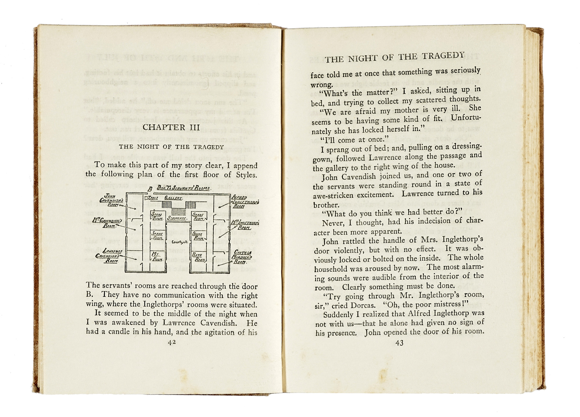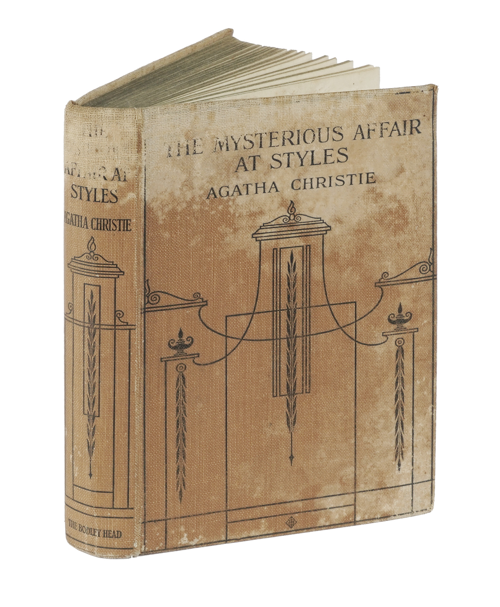 In-8° (mm 185x120). Pagine 296. Illustrazioni in nero nel testo. Uno strappo restaurabile alle pagg. 21-22, rare macchie e lievi fioriture sparse, più corto di 0,5 cm il margine inferiore delle pagg. 135-140 e di oltre 1 cm quello laterale delle pagg. 131-134, ma nel complesso buona copia. Legatura editoriale in piena tela, con un'illustrazione in stile Art Decò e titoli in nero al piatto anteriore e al dorso. Ampie abrasioni al margine superiore dei piatti e del dorso, con parziali perdite di testo, soprattutto al dorso. Nota di possesso manoscritta, parzialmente cassata, al foglio di guardia anteriore e al frontespizio. Mancante la sovraccoperta, come in tutti gli esemplari in commercio. (1) Prima rara edizione inglese (la prima, americana, è del 1920) del primo, celebre romanzo di Agatha Christie, debutto di Hercule Poirot. A causa delle restrizioni imposte dal tempo di guerra, l'edizione fu stampata su carta di bassa qualità e rilegata con una sottile rilegatura in tela, per cui le copie sopravvissute si trovano spesso in cattive condizioni.