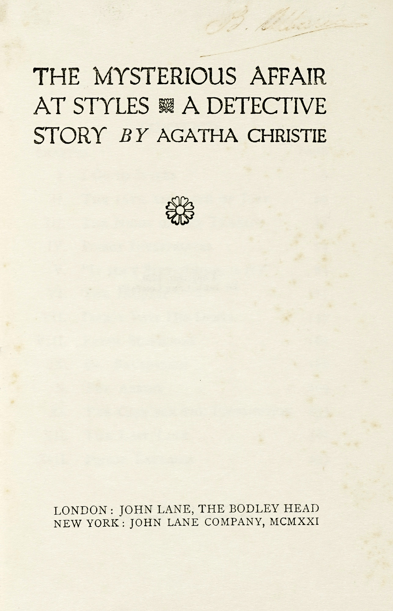 Christie Agatha, The Mysterious Affair at Styles. A detective story. London: John Lane, 1921.