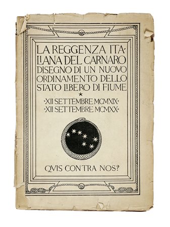 In-folio (mm 321x220). Pagine 85, [3]. Fascicoli allentati, altrimenti buon esemplare intonso. Brossura originale con titoli entro cornice tipografica al piatto anteriore. Strappi marginali ai piatti e mancanze al dorso. Internamente staccata. Esemplare da studio, non passibile di restituzione. (1) Rara tiratura ordinaria in volume della «Carta del Carnaro», la costituzione fiumana che si pone a documento-simbolo di quella sorprendente avventura rivoluzionaria cominciata il 12 settembre 1919 con la marcia dei legionari da Ronchi e conclusasi nel 1920 col Natale di sangue. Si tratta della prima costituzione mai scritta da un poeta - nella quale D'Annunzio riprende e sviluppa un'idea elaborata dall'anarco-sindacalista Alceste De Ambris, suo capo di Gabinetto - pubblicata per la prima volta, in un centinaio di esemplari, il 27 agosto 1920; questa prima tiratura, si distingue da quella ordinaria, del mese di settembre (il presente esemplare) per un refuso negli articoli XVIII e XXXV, nei quali, al posto di "Reggenza", troviamo il termine "Repubblica". Si delinea un modello di democrazia diretta, in cui sono propugnati la centralità sociale del lavoro produttivo e la sua importanza rispetto al diritto di proprietà, il salario minimo garantito, il diritto allo studio, l'assistenza medica gratuita, la pensione, il diritto al risarcimento in caso di abuso di potere o errore giudiziario, il liberismo commerciale, il diritto referendario, la revocabilità in ogni momento dei governanti e dei funzionari e loro responsabilità civile e penale per eventuali errori o abusi. In questa prima stesura il termine "Repubblica", gradito a quelli che volevano fare la rivoluzione, era però intollerabile per i monarchici del Regio Esercito. Con il termine "Reggenza", invece, D'Annunzio rassicura i monarchici senza cambiare la sostanza del progetto di De Ambris.