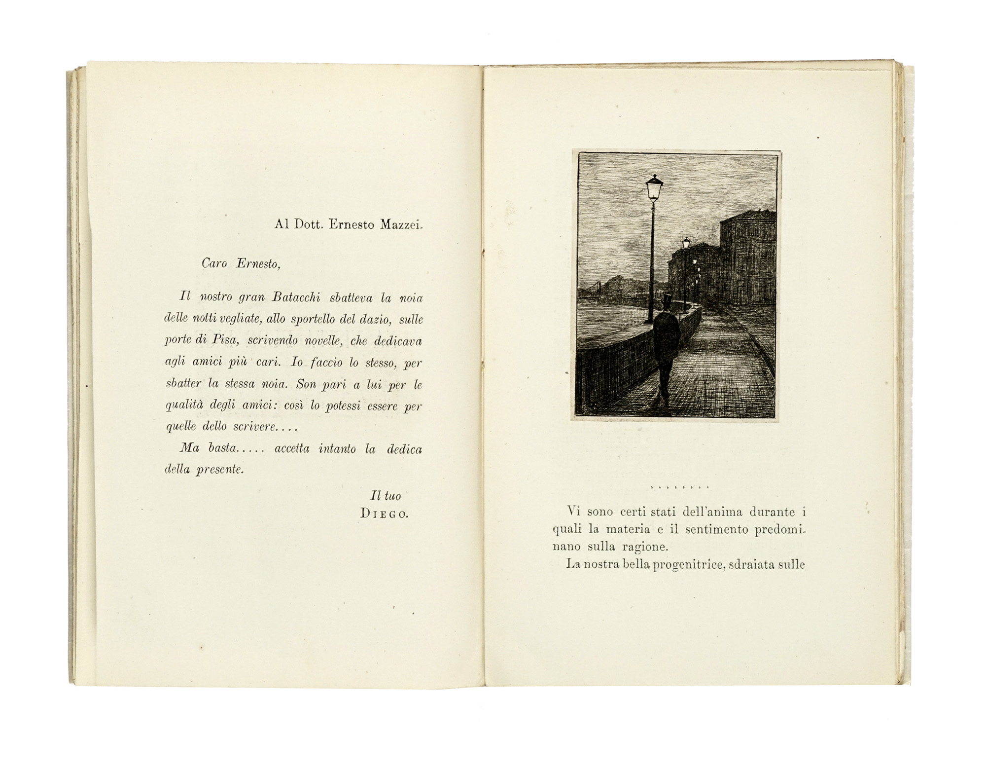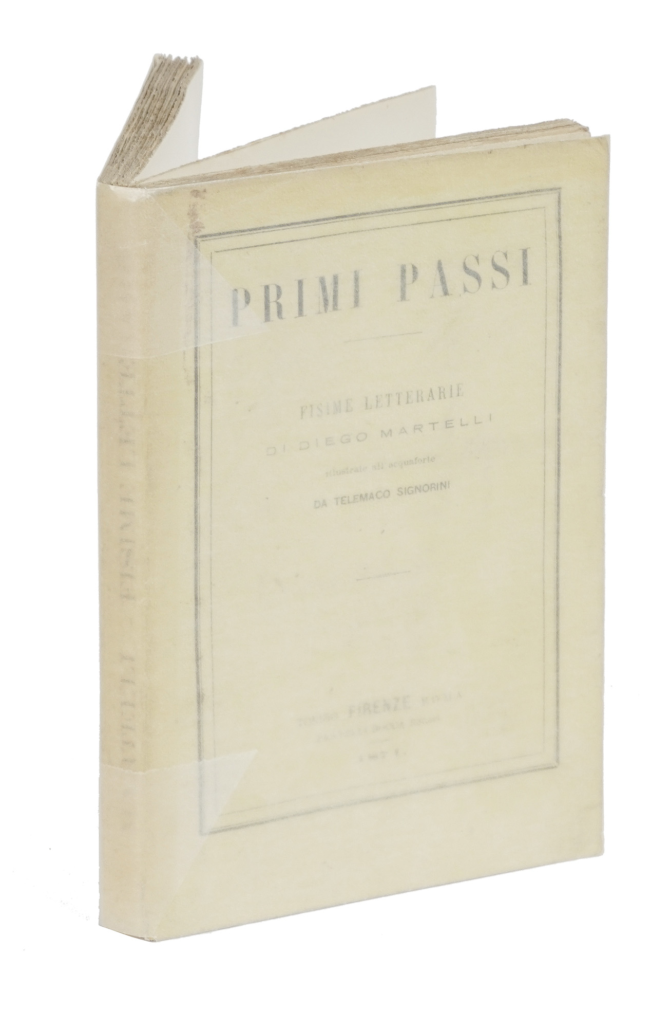 In-16° (mm 188x123). Pagine 202, [1], 1 bianca. Con 18 belle acqueforti di Telemaco Signorini applicate alle pagine. Macchie marginali, altrimenti buona copia in barbe. Brossura editoriale in carta gialla con titoli impressi in nero a piatti e dorso; velina protettiva. Restauri al dorso. (1) Prima edizione, risalente al periodo in cui Signorini si avvicina alla tecnica dell'incisione (sia in acquaforte che a puntasecca): è in questi anni che si inaugura la felice collaborazione con Diego Martelli, con il quale fondò il Gazzettino delle arti del disegno (1867) e il Giornale artistico (1873) e per il quale illustrò poi anche le Fornicazioni di Fra Mazzapicchio. I rami originali dei Primi passi sono stati biffati e donati dagli eredi dell'Artista al comune di Firenze; si trovano attualmente presso la Galleria d'arte moderna fiorentina.