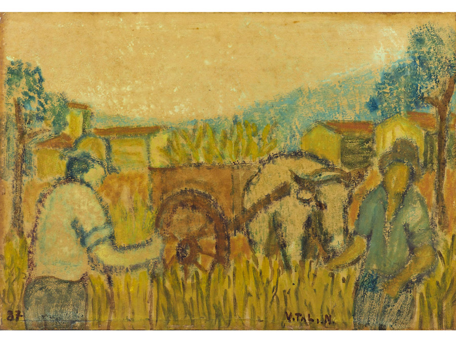 Nazzareno Vitali (XX secolo) Contadini al lavoro Olio su masonite Firmato e datato 1987 Misure 35x50 cm