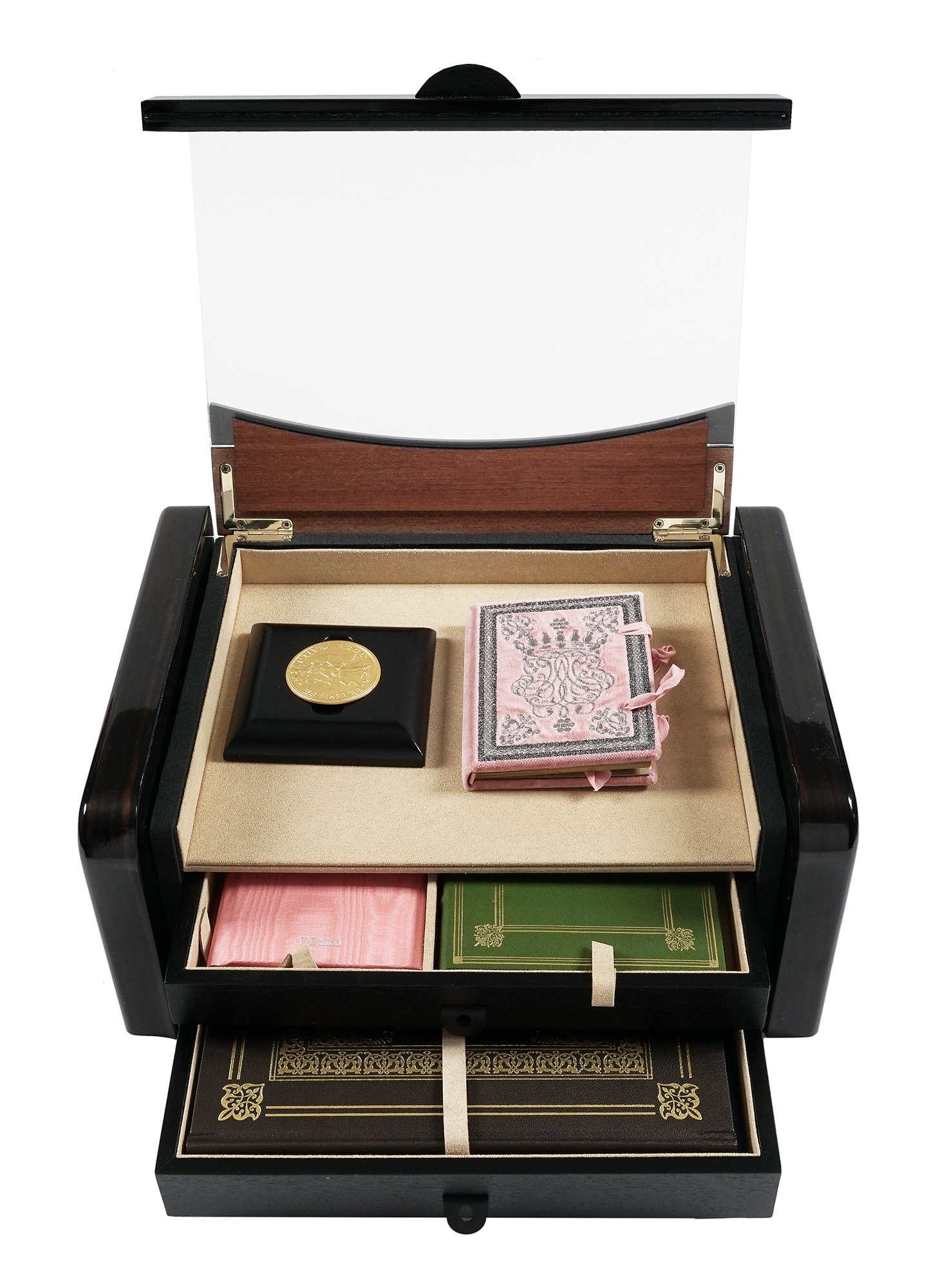 1 scrigno in legno di ebano, conforme alla custodia originale, interamente rivestito in alcantara, con coperchio apribile in plexiglas e doppio cassetto con maniglie in pelle (mm 350x260x160) contenente: 1) Libro d'ore di Renata di Francia: facsimile del codice francese del 1517 ca., in bella legatura in velluto rosa antico, con ricami a fili d'argento, laccetti e tagli dorati. Presente anche il volume di Commentario in seta rosa con titoli impressi in argento al piatto; 2) Histoire d'amour sans paroles: facsimile del codice francese di inizio '500, conservato al Museo Condé di Chantilly, con legatura in pelle verde con cornici e tagli dorati. Presente anche il volume di Commentario rilegato in seta; 3) Inventario delle gioie di Isabella d'Este (Codice Stivini): facsimile de codice mantovano del 1542, in pelle marrone con cornici e fregi fitomorfi in oro ai piatti e tagli dorati. Presente anche il volume di Commentario in seta blu e la medaglia La Vittoria alata, ripresa da quella casellata da Giancristoforo Romano nel 1498 ca. per Isabella d'Este. Quest'ultima, in oro 750/1000, è dotata di fermagli per essere anche indossata. Presente anche il certificato di Garanzia dell'opera. Uno dei 26 esemplari contrassegnati dalla A alla Z e appartenenti alla dotazione d'archivio dell'editore. (7)