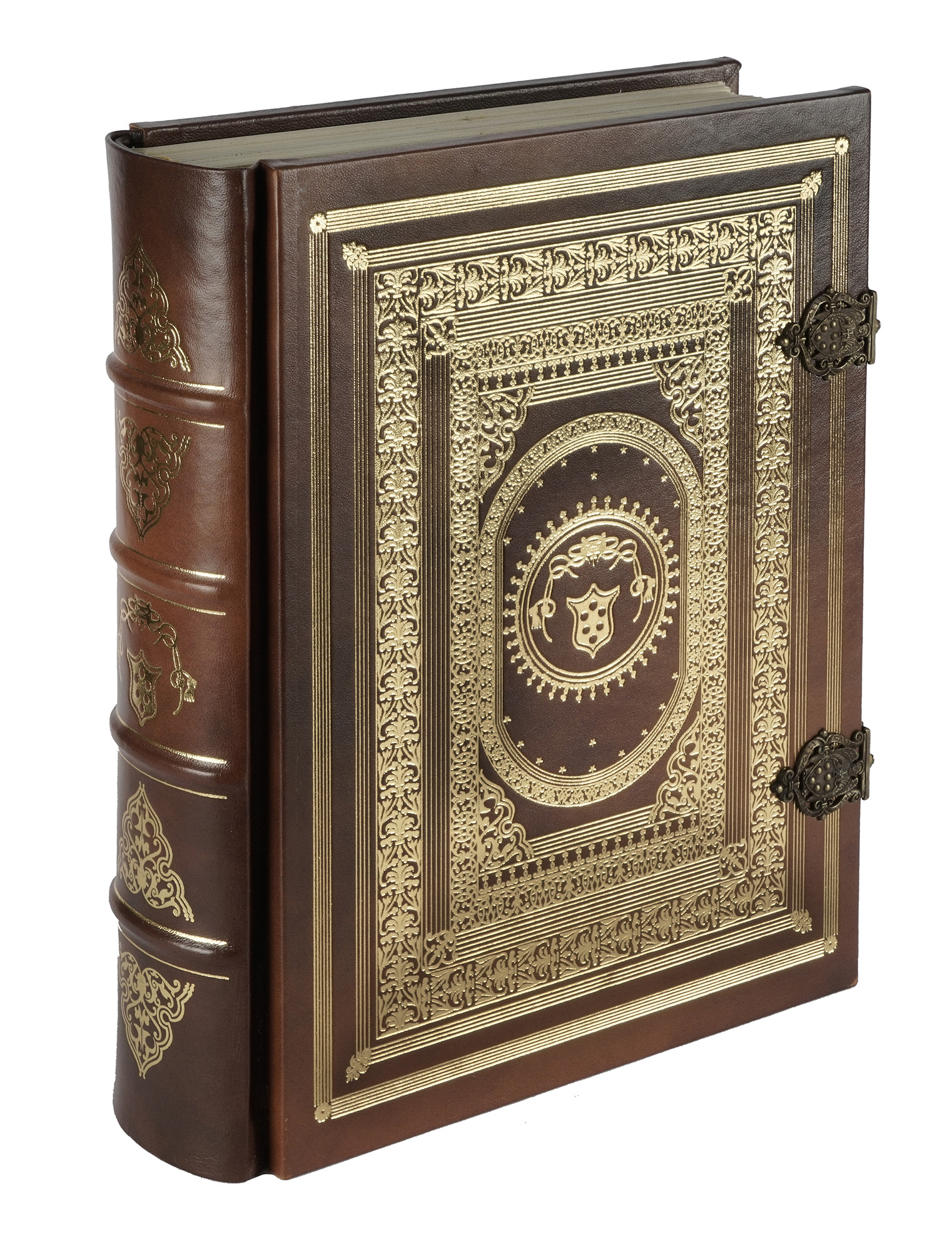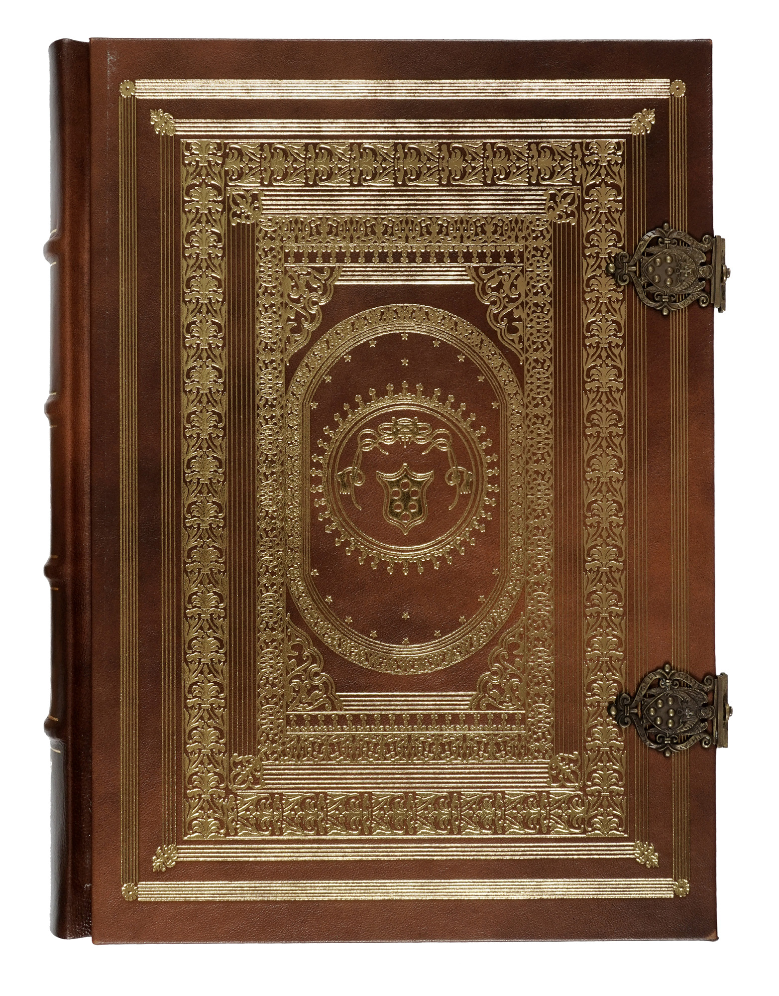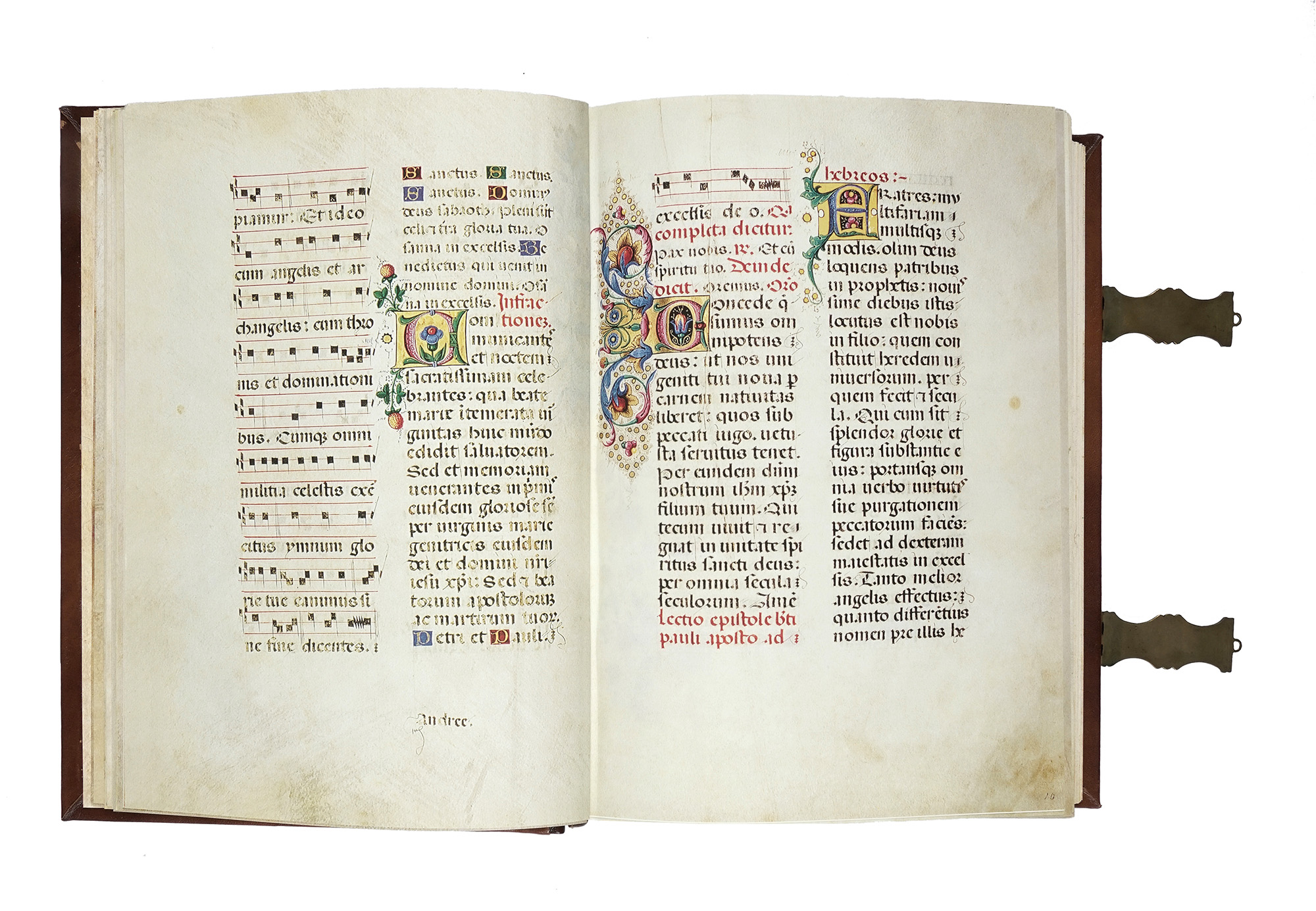 In-folio (mm 385x280). Con splendide miniature, innumerevoli iniziali miniate e bordi riccamente decorati. Legatura editoriale in piena pelle marrone con ricchi decori in oro al dorso a 4 nervi e ai piatti, con fermagli riccamente decorati in metallo. Presente il volume di Commentario. Il tutto contenuto entro cofanetto editoriale di plexiglass, con piedini in legno al piatto posteriore. (2) Riproduzione facsimilare a colori del celebre codice custodito presso la Curia Arcivescovile di Chieti, con splendide miniature, innumerevoli iniziali miniate e bordi riccamente decorati.