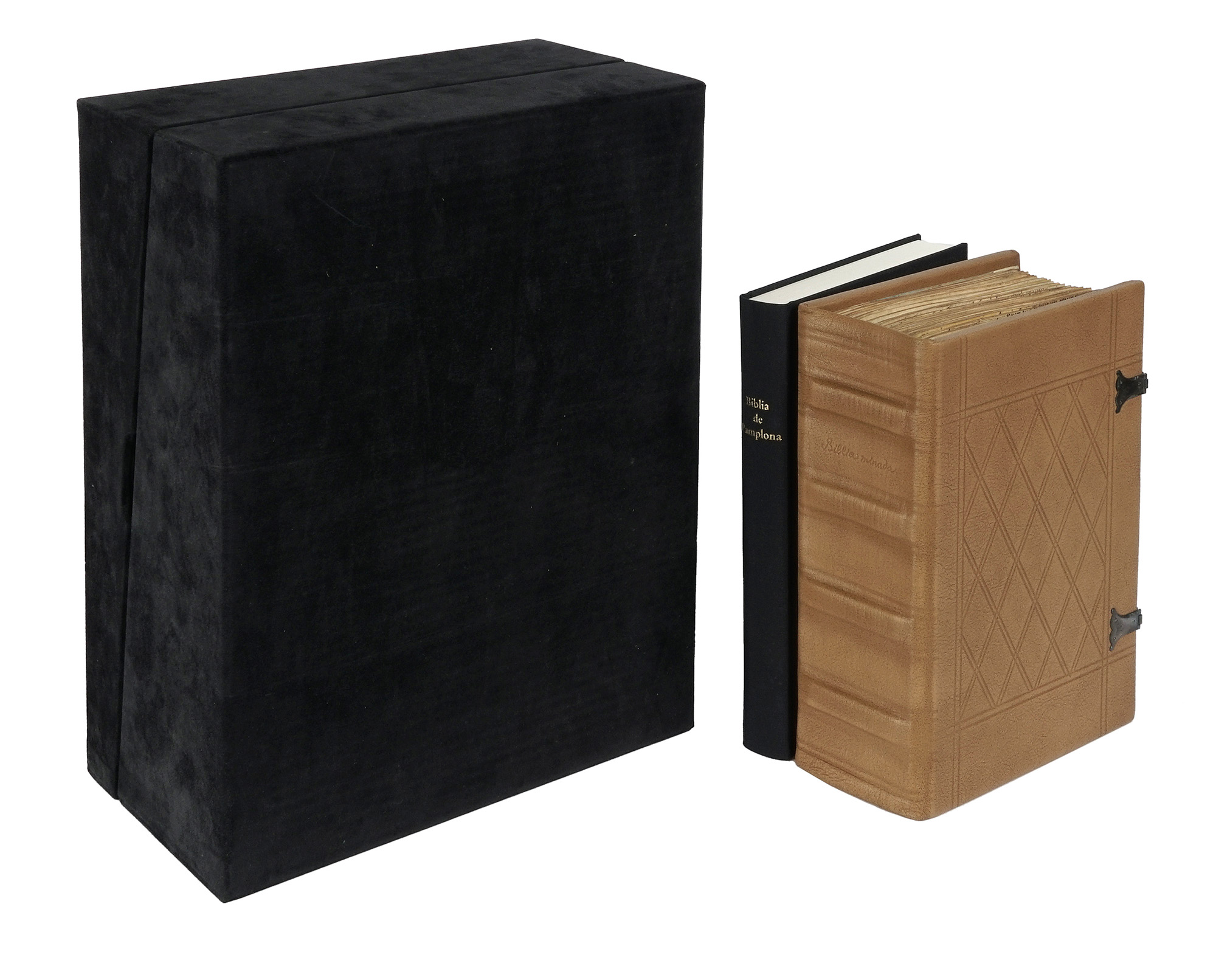 In-4° (mm 245x165). Riproduzione facsimilare profusamente illustrata del manoscritto conservato nella Biblioteca dell'Università di Augusta, Collezione Oettingen-Wallerstein. Legatura in pelle con impressioni a secco ai piatti, fermagli e legacci in pelle. Presente il volume di Commentario, con tracce di usura ai piatti. Il tutto entro cofanetto editoriale in velluto, con medaglione a sbalzo al piatto anteriore. Una delle 995 copie numerate. Presente anche il fascicolo di Commentario al Codice in lingua italiana. (3) La Bibbia di Pamplona contiene il più grande ciclo di immagini bibliche anteriore al XIII secolo, dalla Creazione al Giorno del Giudizio; fu commissionata dal re Sancio VII di Navarra, come manuale moralistico, sotto la direzione del chierico Petrus Ferrandus nella cancelleria reale di Pamplona.