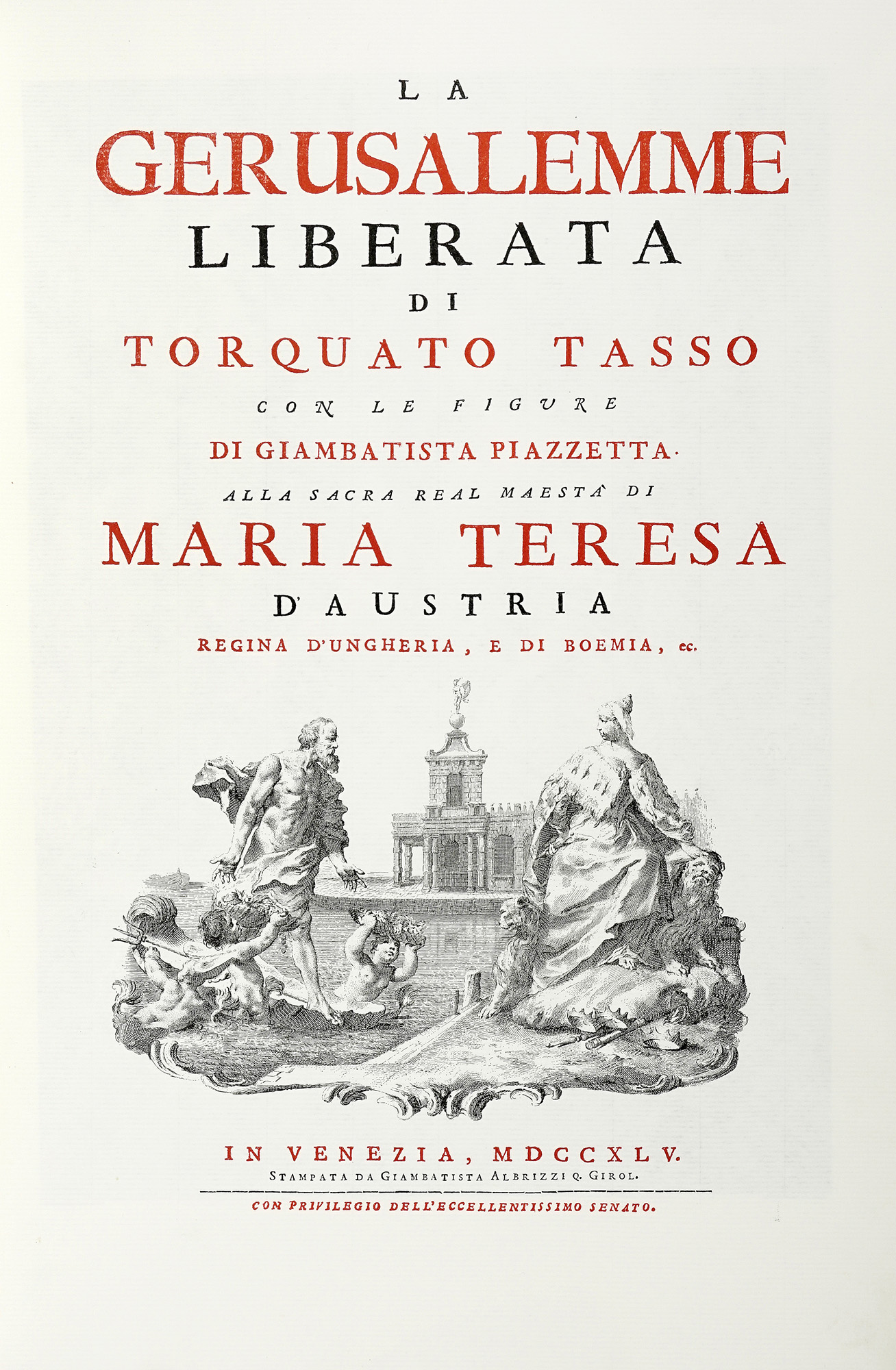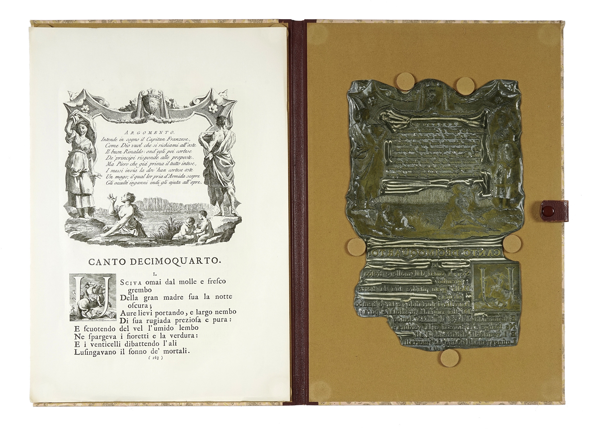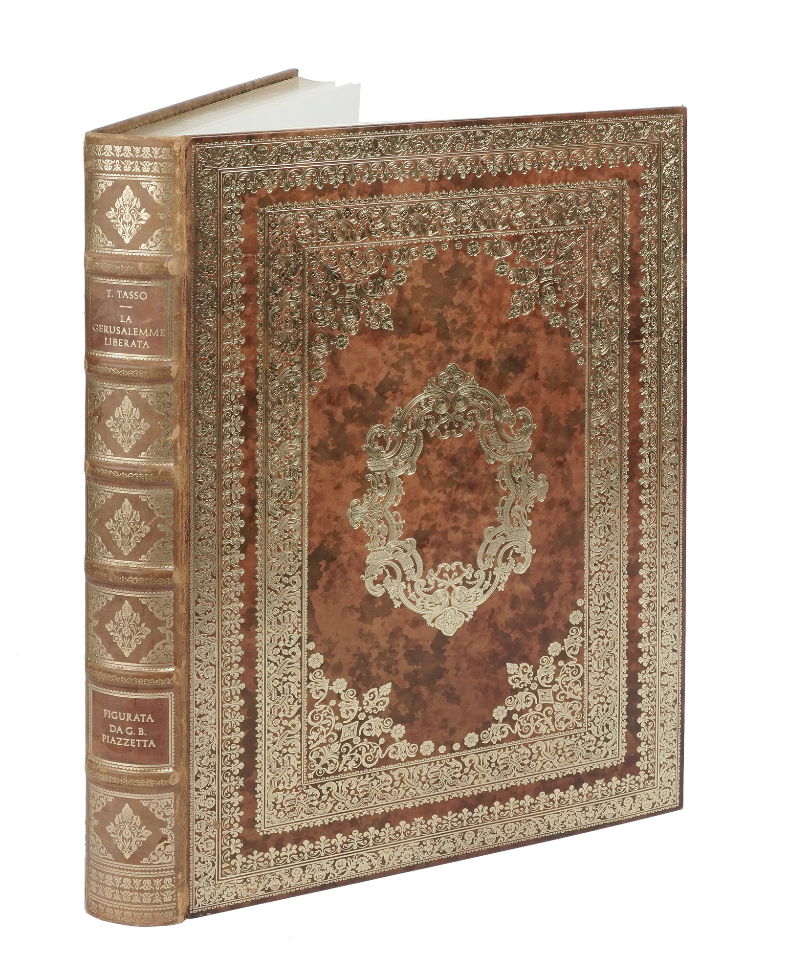 In-folio (mm 430x300). Splendida copia, perfettamente conservata. Legatura in pieno vitello, con ampie cornici dorate al piatto, dentelles, fregi e titoli in oro al dorso e tagli dorati. Tracce d'uso alle cerniere. Entro cofanetto in cartonato, con il taglio inferiore parzialmente staccato. Tiratura in 1001 esemplari numerati, uno dei 60 contenenti una lastra originale in rame. SI AGGIUNGE: Lastra originale in rame, entro cofanetto editoriale. (2) Riproduzione fedelmente e precisamente ritratta de La Gerusalemme Liberata del 1745, con le figure di Giambattista Piazzetta.