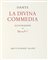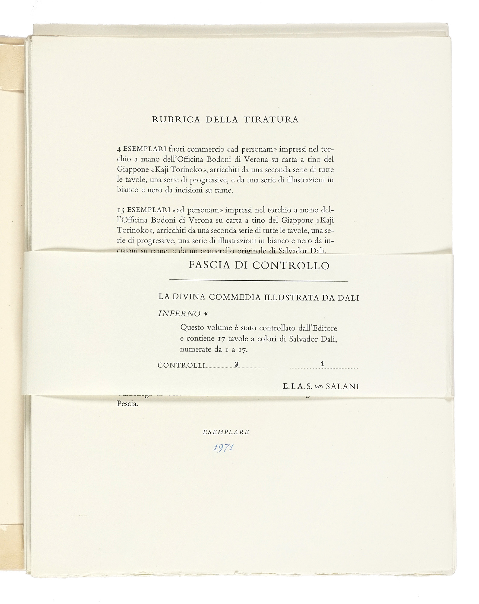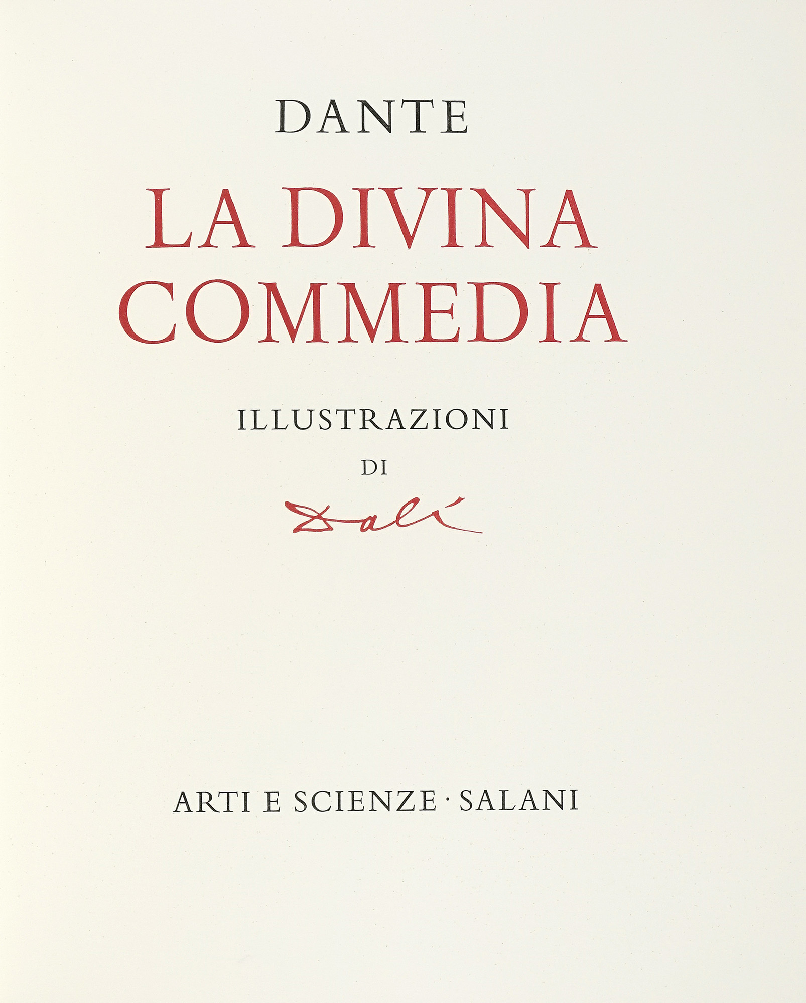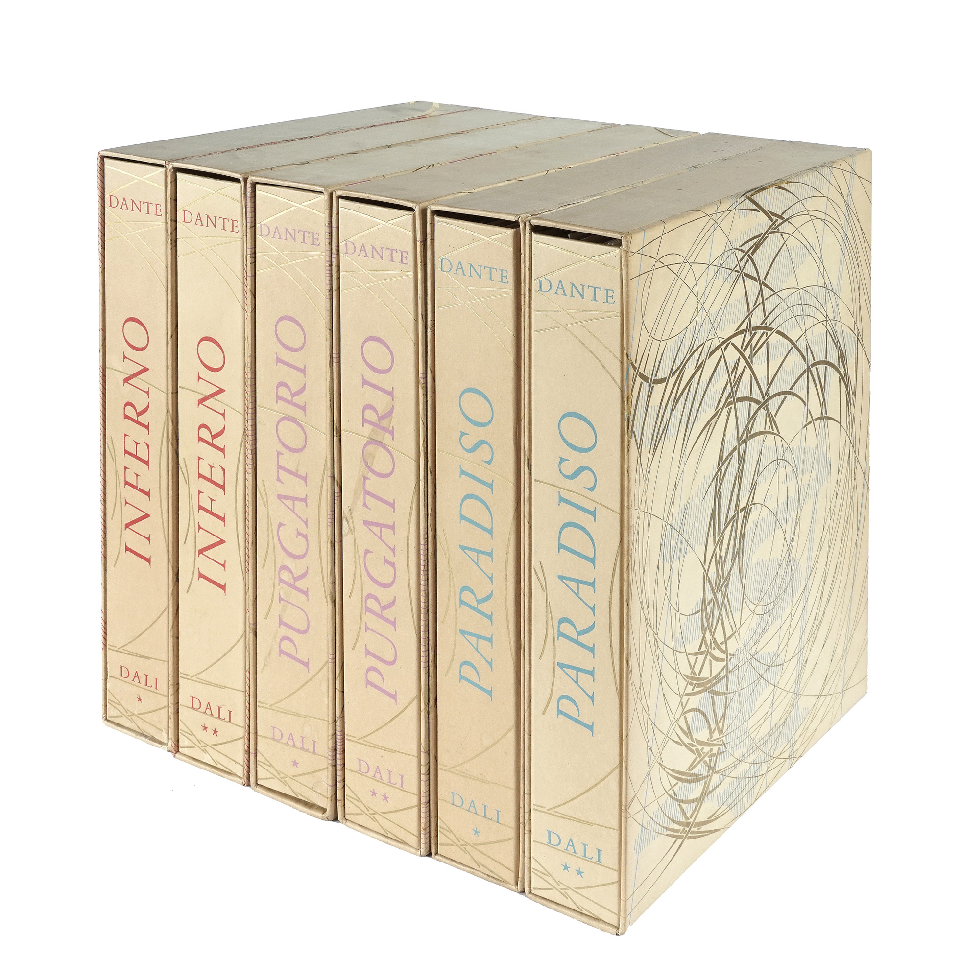6 volumi in-folio (mm 332x253). Con, complessivamente, 100 splendide tavole a colori di Salvador Dalì, numerate al verso, sciolte e fuori testo. Lievi bruniture uniformi ad alcune tavole, altrimenti buona copia in barbe a fascicoli sciolti, stampata in nero; testo a due colori, rosso per i due tomi dell'Inferno, viola per il Purgatorio e blu per il Paradiso. Ottime condizioni. Ciascun volume entro brossura con titolo in rosso al piatto anteriore e velina protettiva, cartella e custodia in cartonato editoriali a motivi geometrici colorati, con macchioline sparse e spellature ai tagli della custodia del primo volume dell'Inferno, del secondo del Purgatorio e del primo del Paradiso. Conservate tutte e 6 le fascette di controllo e la rubrica delle tirature. Uno dei 2900 esemplari impressi dalla Stamperia Valdonega su carta a mano dei Fratelli Magnani di Pescia, su una tiratura complessiva di 3044 copie. (6) Celeberrima edizione della Commedia illustrata da Dalì. Mardersteig 133.