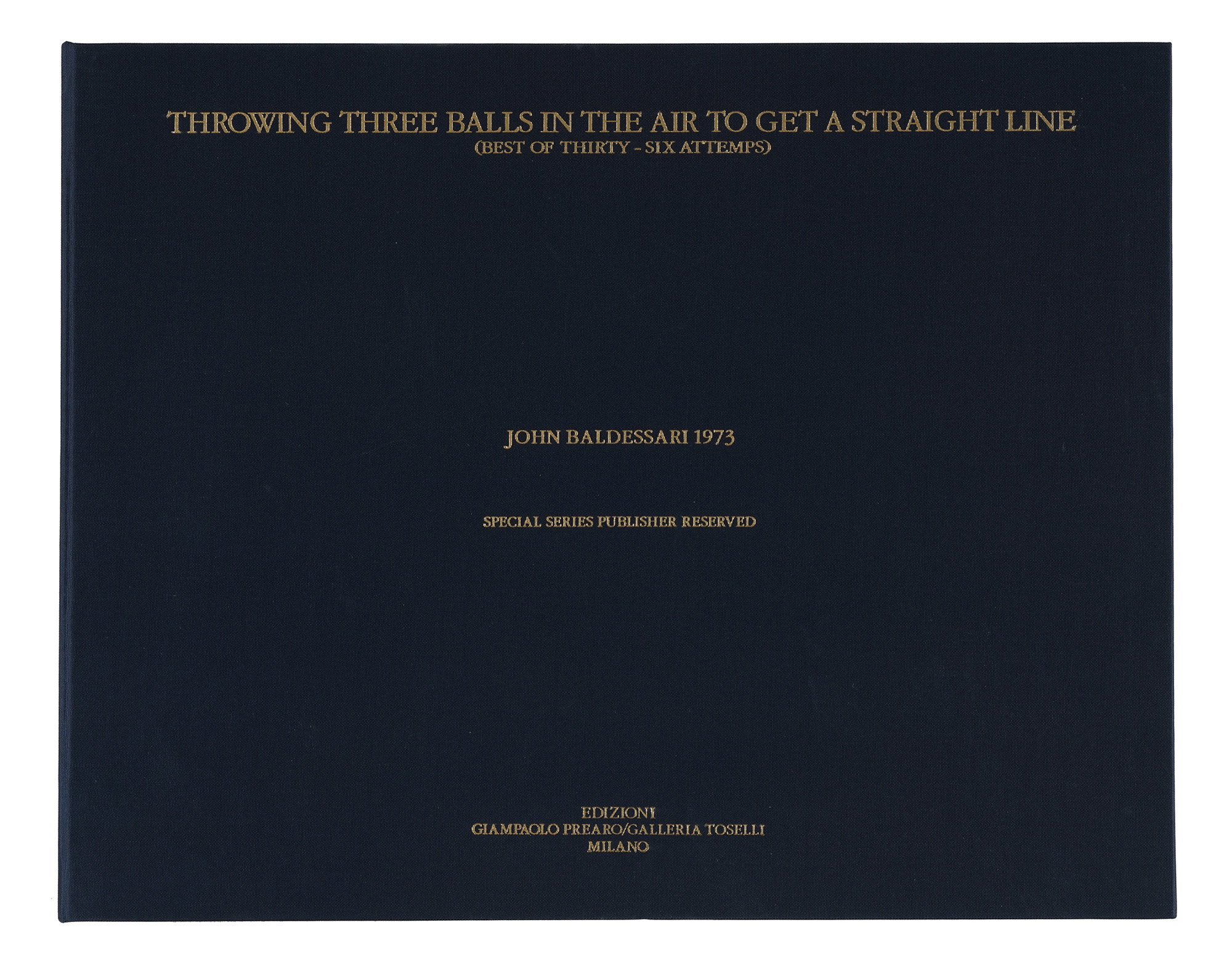 1 cartella editoriale in cartonato in-4° oblungo (mm 243x320) con, sciolte, 1 carta di frontespizio, 12 litografie offset a colori (con stiker Artdata applicato al verso) e 1 carta di colophon. Il tutto perfettamente conservato entro cofanetto editoriale in piena tela, con titoli in oro al piatto e al dorso. Tiratura in 500 esemplari numerati riservati all'editore, con la firma dell'Editore e dal gallerista Franco Toselli al colophon. Presente anche lo Swiss Art Certificate, datato Milano, 24 novembre 2011. (1) Portfolio con i migliori 12 scatti (su 36) eseguiti dall'Artista John Baldessari per ottenere una linea retta lanciando contemporaneamente 3 palle in aria.