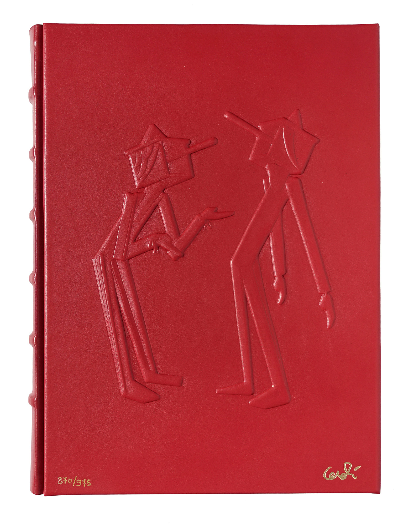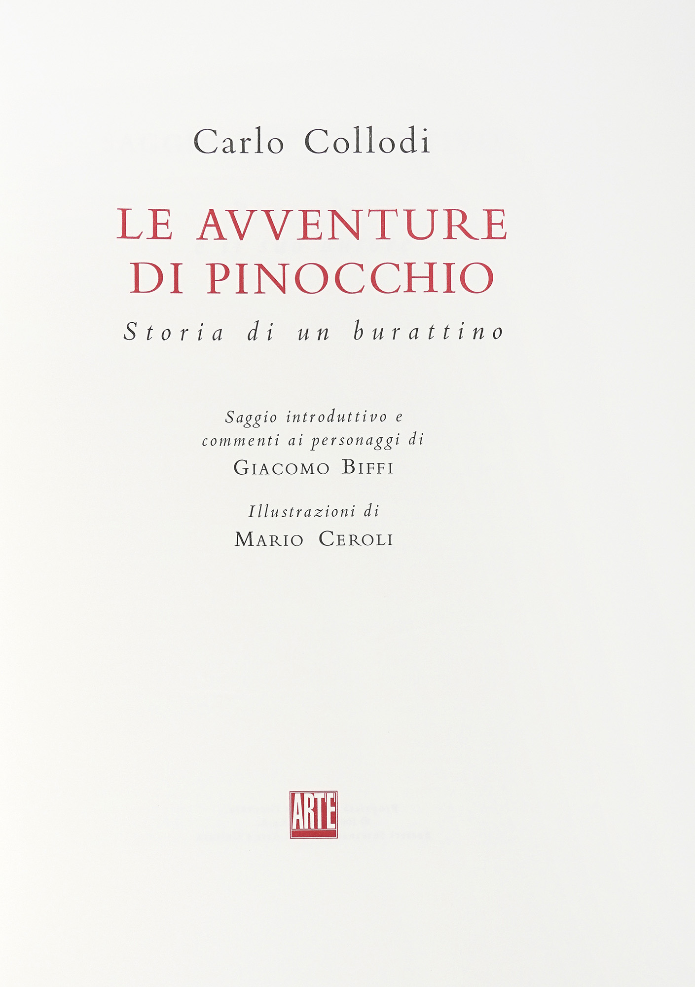 In-folio (mm 450x320). Con numerose illustrazioni a colori, anche a piena pagina fuori testo, di Mario Ceroli, tratte da disegni originali realizzati appositamente per questa edizione dall'Artista e stampate con tecnica litoserigrafica. Legatura editoriale in piena pelle, con bassorilievo al piatto, dal titolo Pinocchio contro Pinocchio, numerato e firmato in oro dall'Artista; titoli in oro al dorso a 6 nervi. Entro cofanetto editoriale in piena tela rossa, con titoli in oro al piatto e al dorso. Uno dei 975 esemplari in numeri arabi, su una tiratura complessiva di 1050 copie. (1)