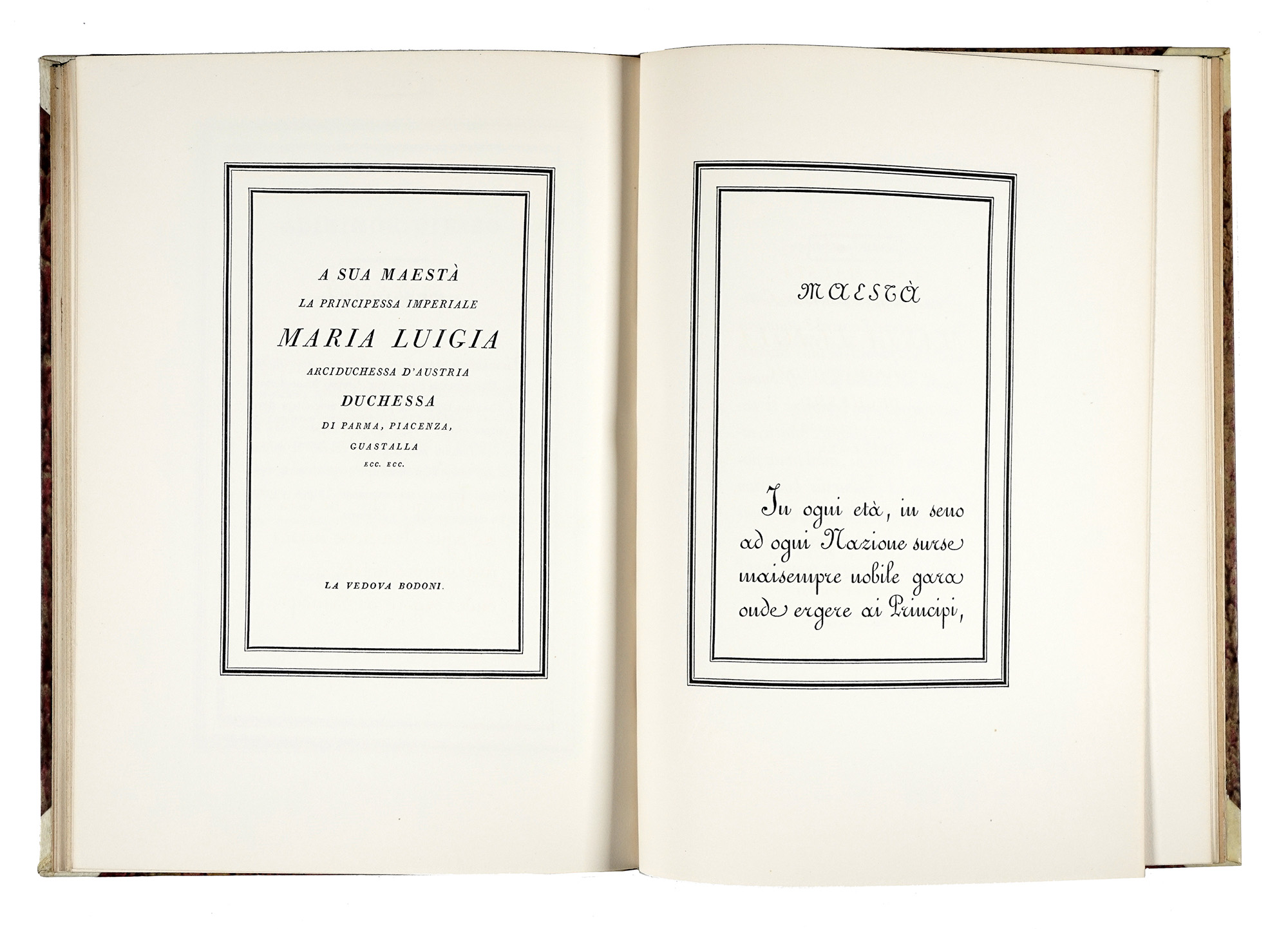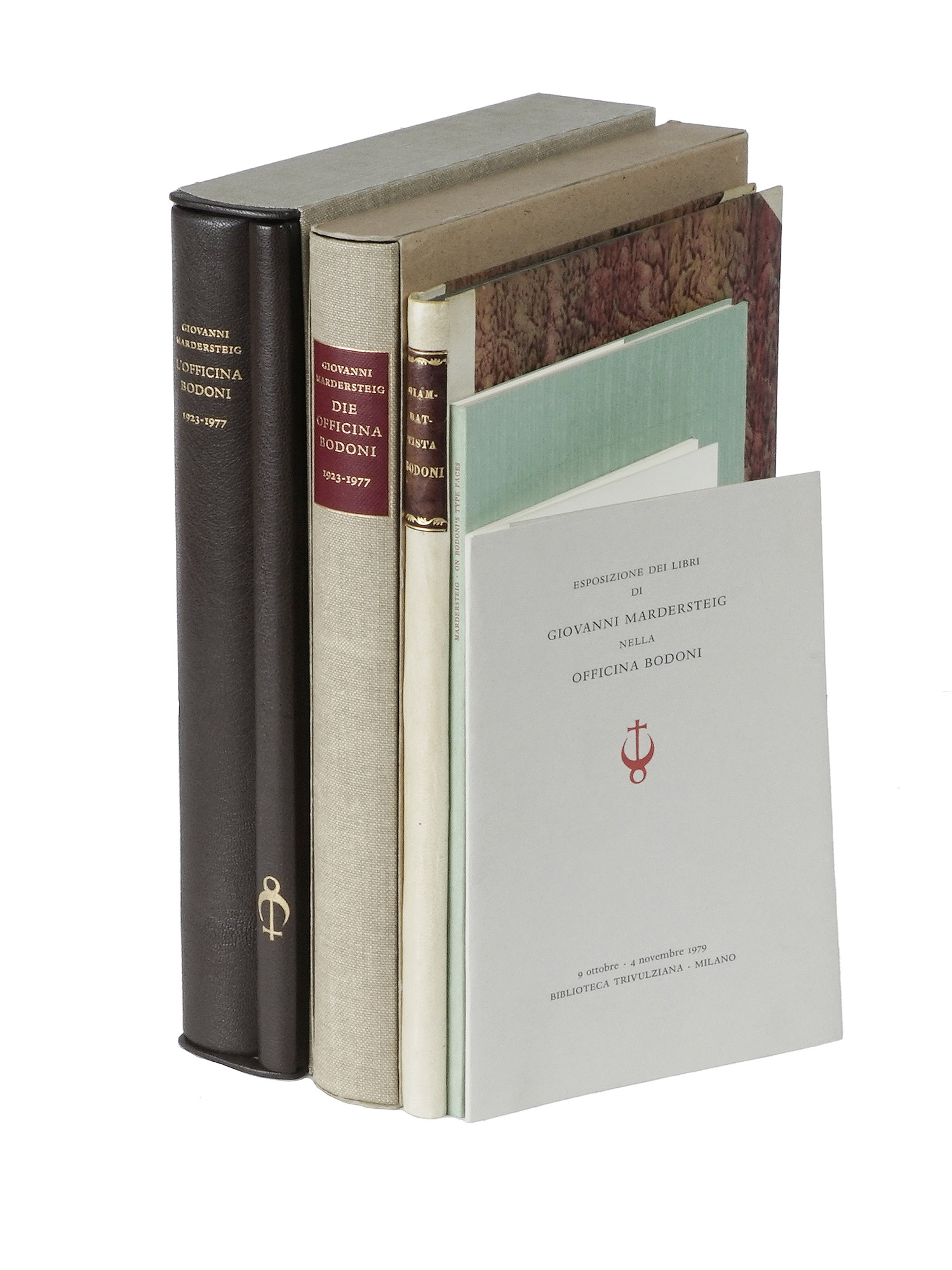 1 volume di testo in-4° (mm 300x205) e il volume Pagine originali di libri impressi nella Officina Bodoni tra il 1924 e il 1973 in-4° (mm 305x210). Esemplare illustrato, in ottimo stato di conservazione. Legatura omogenea in mezzo marocchino marrone con piatti in tela e custodia in piena tela. Uno dei 99 numerati con cifre arabe accompagnato da una suite contenente 10 quartini originali di volumi, su una tiratura di 1200 copie. SI AGGIUNGE: Id., Die Officina Bodoni. Das Werk einer Handpresse 1923-1977... Hamburg: Maximilian Gesellschaft, 1979; SI AGGIUNGE: Silomon Karl, Giambattiste Bodoni. Der König der Buchdrucker... Berlin: Maximilian Gesellschaft, 1941; SI AGGIUNGE: Giovanni Mardersteig on G.B.Bodoni 's type faces. Verona: Mardersteig, 1968. SI AGGIUNGE: Esposizione dei libri di Giovanni Mardesteig nella Officina Bodoni. 9 Ottobre - 4 Novembre 1979. Milano: Biblioteca trivulziana, 1979. Lotto non passibile di restituzione. (6)