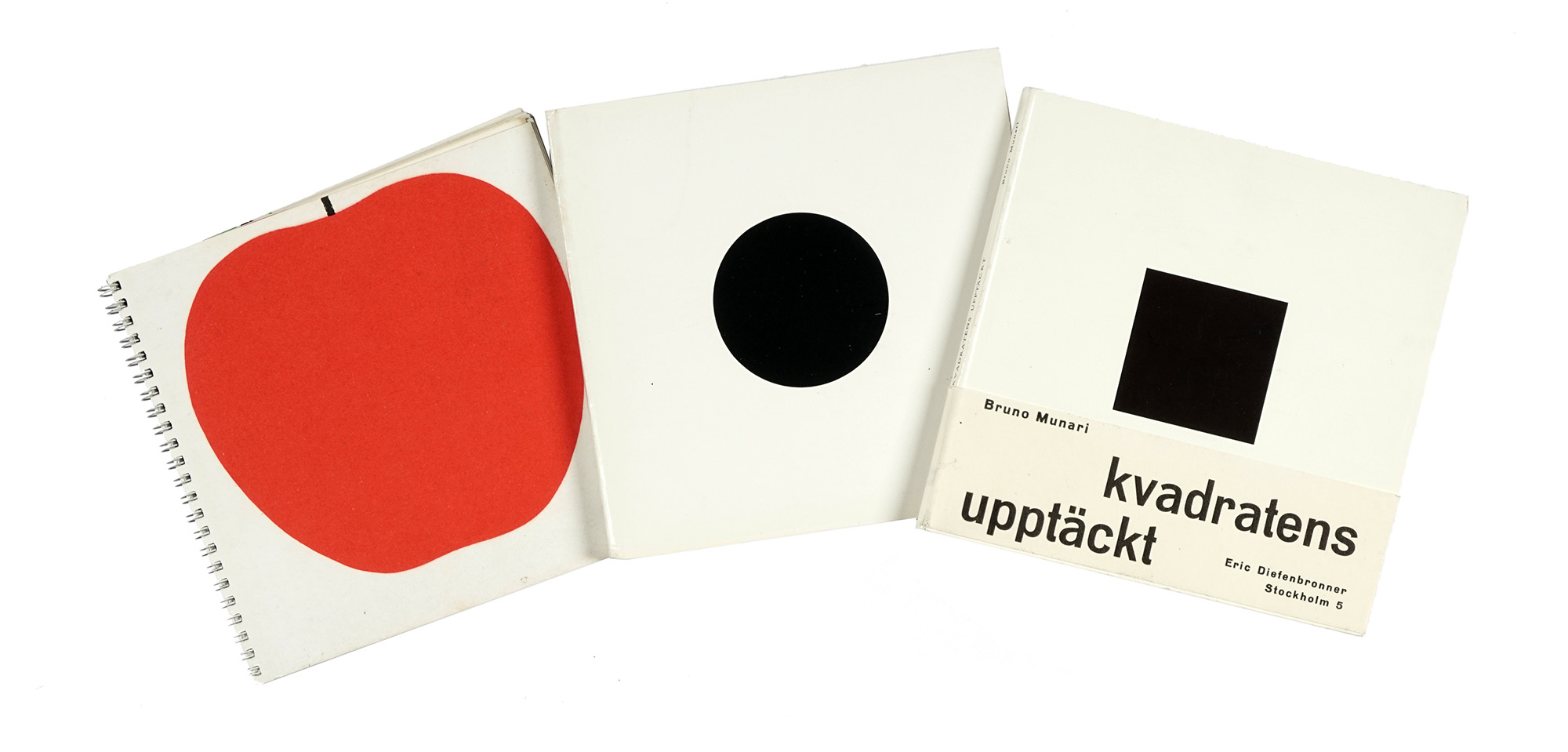 In-8° quadrotto (mm 149x155). Carte [14] completamente illustrate a colori da Iela ed Enzo Mari. Minime tracce d'uso, altrimenti ottima copia. Legatura con dorso a spirale, con illustrazione al piatto anteriore e titoli a quello posteriore. Quest'ultimo presenta una piega centrale. Mancante l'astuccio editoriale illustrato. SI AGGIUNGE: Munari Bruno, Il cerchio. Milano: All'insegna del Pesce d'Oro, 1964. In-16° carré (mm 155x155). Pagine 82, [6]. Ottima conservazione. Brossura editoriale illustrata. SI AGGIUNGE: Id., Kvadratens Upptackt. [Stockholm: Eric Diefenbronne, 1964]. (3) I OPERA: Esemplare distribuito da Eric Diefenbronner nel settembre del 1964, accompagnato da un bifolio sciolto con testo svedese, e con la data cancellata ad inchiostro al piatto posteriore. II OPERA: Edizione originale, impressa in 3000 copie, di una delle prime opere di Munari dedicate alle forme basilari.