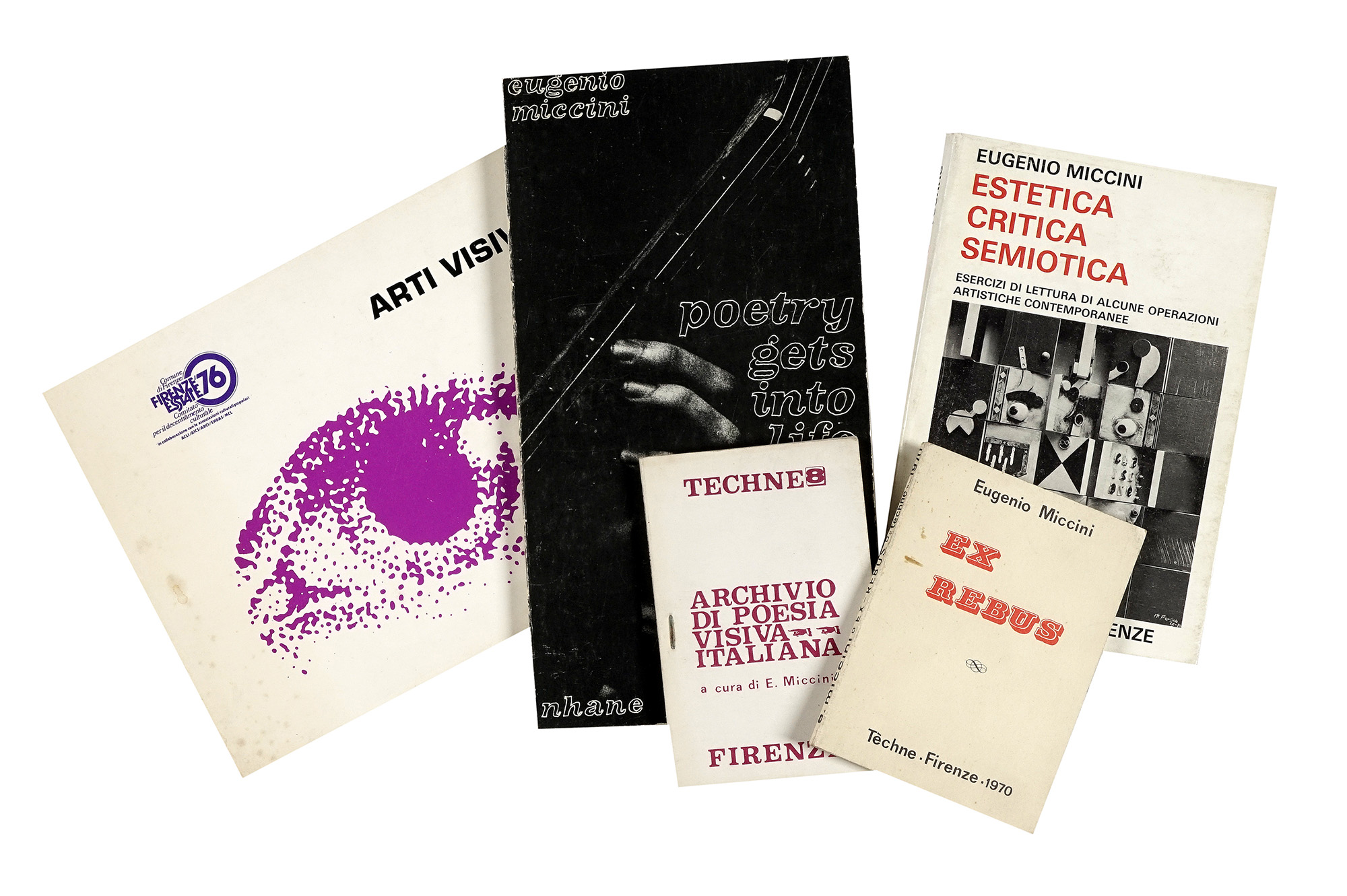 Compongono il lotto: 1) Miccini Eugenio, Poetry gets into life. London: s.e., 1975; 2) Id., Ex rebus. Firenze: Techne, 1970; 3) Id., Poesia e/o Poesia. Situazione della Poesia Visiva italiana. Brescia - Firenze: Edizioni Sarmic, 1972; 4) Id., Caro oggetto. Videoteche 1979. Firenze: Galleria La Piramide, 1979 (firma autograda di Miccini al piatto anteriore); 5) Id., Il senso comune. Firenze: Techne, 1979; 6) Ori Luciano, Spartiti teatrali 1971. Firenze: Te'chne, 1973; 7) Arti visive. Firenze, 1976. SI AGGIUNGE: Hanne Darboven, Diary NYC February 15 until March 4 1974. New York,Torino: Gian Enzo Sperone, 1974. Elenco completo disponibile su richiesta. (17) II OPERA: «Le poesie visive sono state stampate nella grandezza delle diapositive. Molte, pertanto, risulteranno quasi illeggibili. Alcune, peraltro, furono danneggiate dall'alluvione del 1966» (dalla nota introduttiva). Prima edizione; tiratura non dichiarata di 200 esemplari. III OPERE: Le edizioni Sarmic sono il risultato della collaborazione di Sarenco, direttore delle edizioni Amodulo, della rivista Lotta Poetica e di Eugenio Miccini, direttore della rivista «Techne». Esemplare profusamente illustrato dalle opere di Nanni Balestrini, Mirella Bentivoglio, Achille Bonito Oliva, Ugo Carrega, Emilio Isgrò, Lucia Marcucci, Eugenio Miccini, Luciano Ori, Michele Perfetti, Lamberto Pignotti ed altri. VII OPERA: Catalogo della manifestazione multidisciplinare realizzata nel quadro del festival Firenze Estate '76. VIII OPERA: Interessantissimo libro d'artista, facsimile del manoscritto originale, interamente illustrato con trascrizioni, operazioni numeriche, annotazioni, interventi testuali, tracciatura di linee e cancellature. Tiratura in 1000 esemplari.