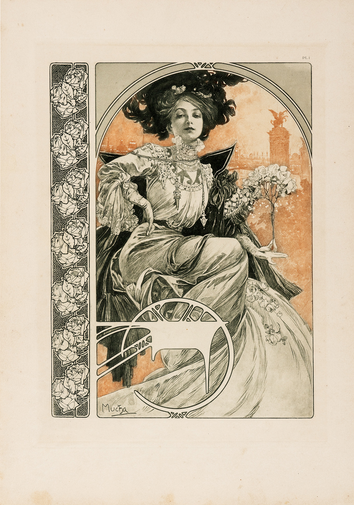 In-folio (mm 463x331). 1 carta di occhietto, 1 carta di frontespizio, 8 pagine di Préface e 72 splendide tavole a colori di Alphonse Mucha, di cui 8 applicate. Una leggera mancanza marginale alle tavole 39 e 42; strappetti alle tavole 40, 47, 48, fioriture e macchioline sparse alle altre, con lievissime e uniformi bruniture. Il tutto conservato sciolto entro cartella coeva in mezza tela, con i piatti della brossura originale figurata applicati. Abrasioni e macchie ai piatti, strappi alle cerniere e difetti alle cuffie. (1) Opera capitale dello stile Art Nouveau, eseguita da Mucha al culmine del suo successo, contiene un repertorio enciclopedico di quello stile applicato all'ornamentazione ed esplicato attraverso composizioni decorative aventi per soggetto figure femminili, fiori, specie botaniche, carte da parati, vetrate, gioielli ecc. Opera rara a trovarsi completa, perché spesso smembrata per vendere a prezzi elevati le tavole più belle.
