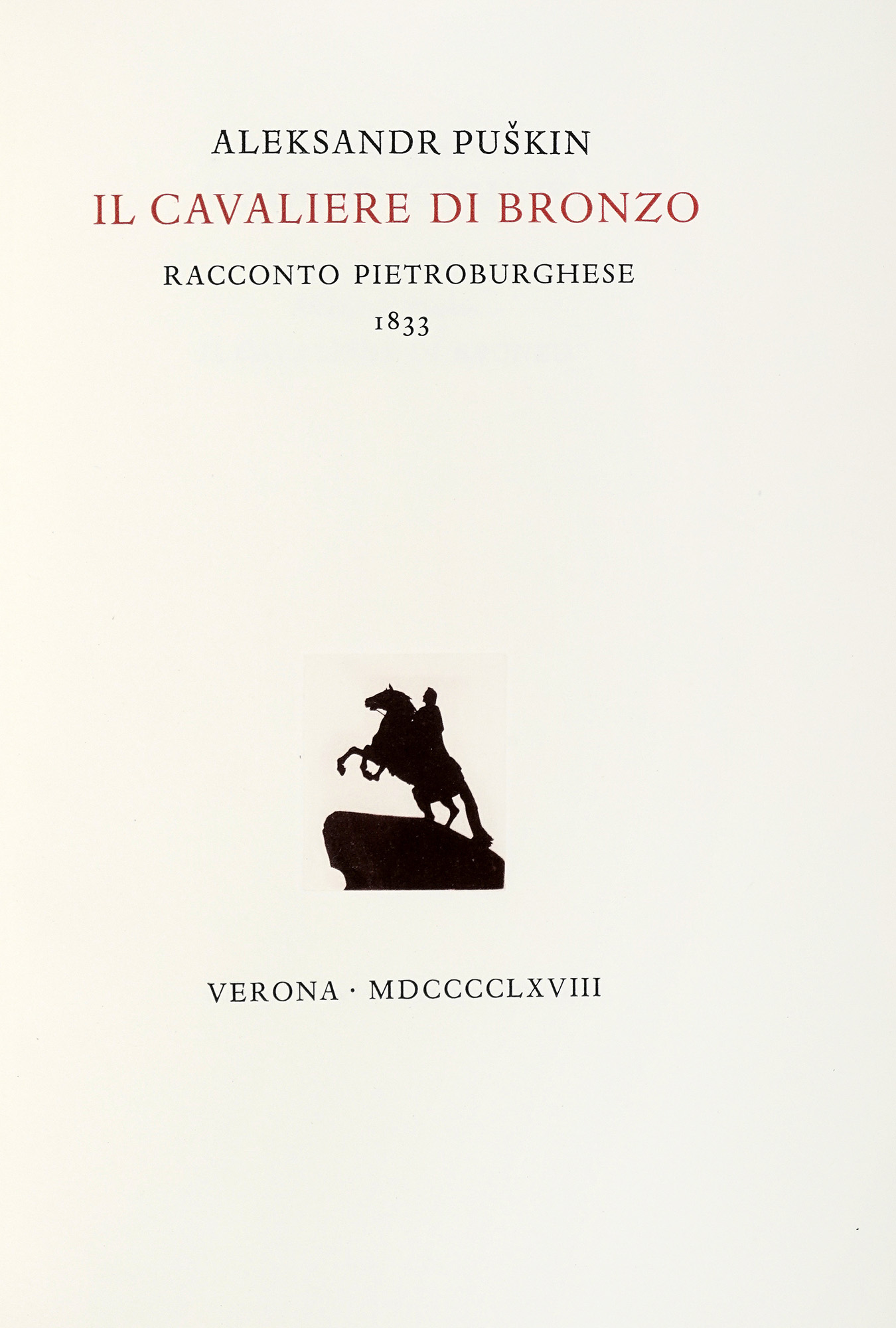 Puskin Aleksandr Sergeevic, Il Cavaliere di bronzo. Racconto Pietroburghese. 1833. Verona: [Officina Bodoni], 1968.
