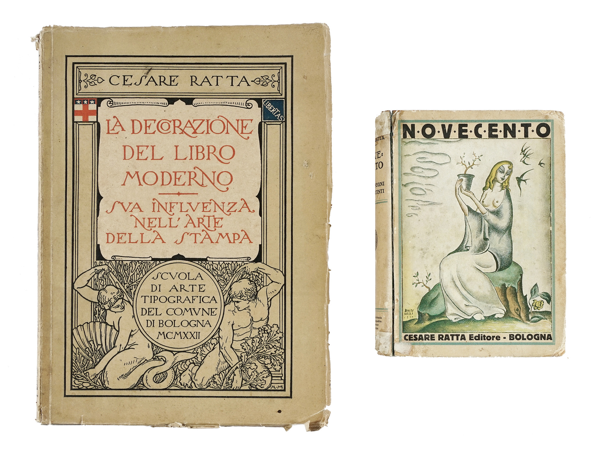 In-folio (mm 335x240). Con moltissime splendide illustrazioni nel testo, alcune ripiegate. Brossura editoriale illustrata, con titoli in rosso e nero al piatto e al dorso. Difetti e restauri al dorso. Edizione fuori commercio di 200 esemplari in edizione numerata. SI AGGIUNGE: Id., Novecento. Allegorie, imprese, auguri, partecipazioni, vignette, carte da lettere, ex-libris. 250 disegni di 95 artisti a cura di Cesare Ratta. Bologna: Cesare Ratta, [1932]. L'opera è illustrata da numerosissimi disegni, di cui alcuni a colori, altri con dettagli in oro o in argento, altri monocromi, altri stampati su carta patinata. Cartonato editoriale con copertina illustrata da Armando Baldinelli Difetti e maldestri restauri al dorso. Tiratura limitata a soli 150 esemplari numerati. Difetti da controllare, lotto non passibile di restituzione. (2) I OPERA: Fantastico insieme di numerosi saggi. II OPERA: Rara splendida antologia della grafica di inizio anni '30, con contributi di Anselmo Bucci, Bruno da Osimo, Adolfo De Carolis, Guido Marussig, Publio Morbiducci, Luigi Servolini Giulio Cisari, Luigi Bartolini e moltissimi altri.
