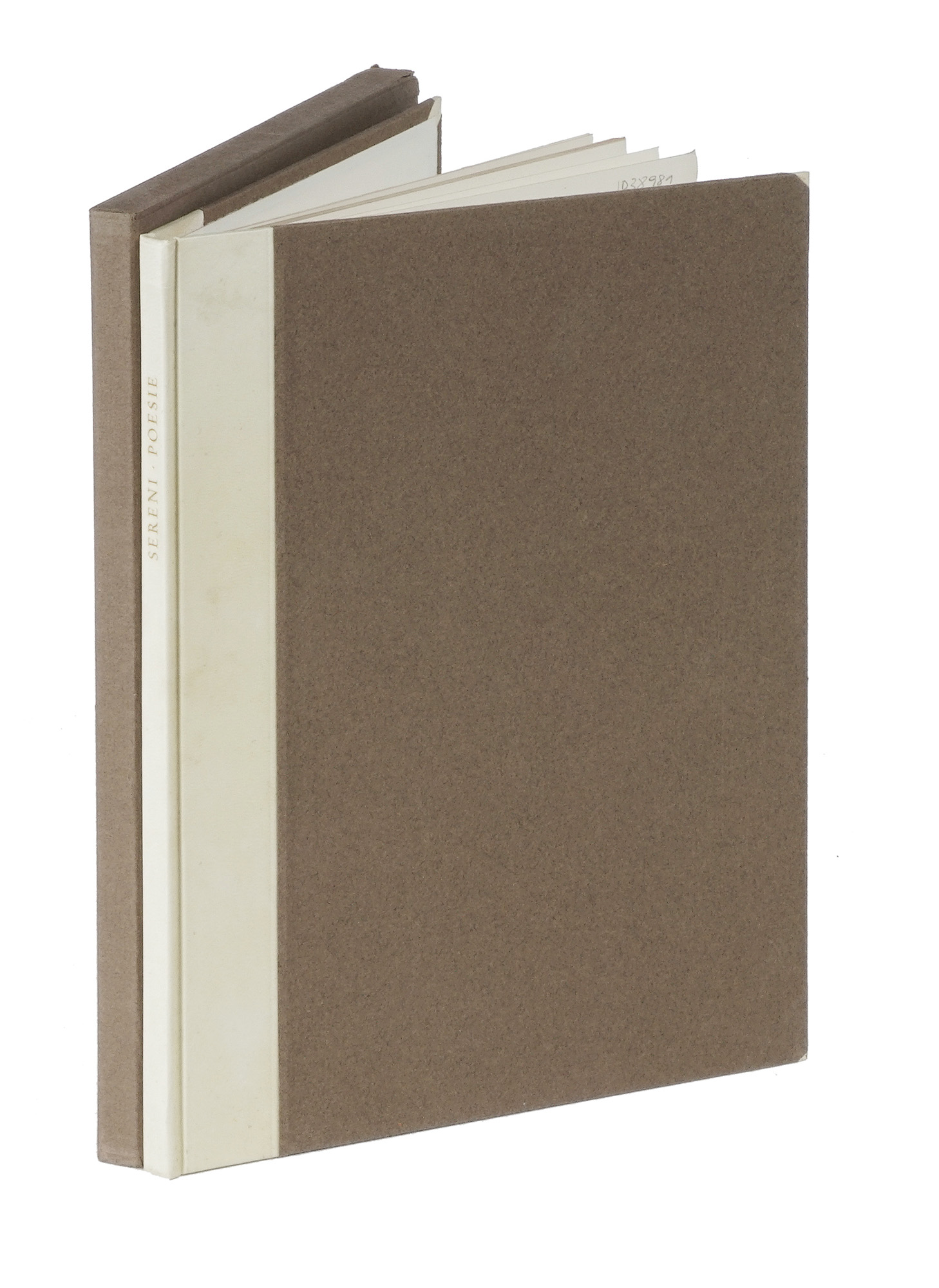 In-8° (mm 265x180). Ottimo esemplare in barbe, stampato a mano su carta forte per cura di Franco Riva. Legatura editoriale in mezza pergamena con piatti in carta e titoli in oro al dorso, con acetato trasparente protettivo. Entro cofanetto editoriale coordinato. Tiratura in 65 esemplari fuori commercio. (1) Franco Riva procurerà un'edizione illustrata, più comune, l'anno successivo.