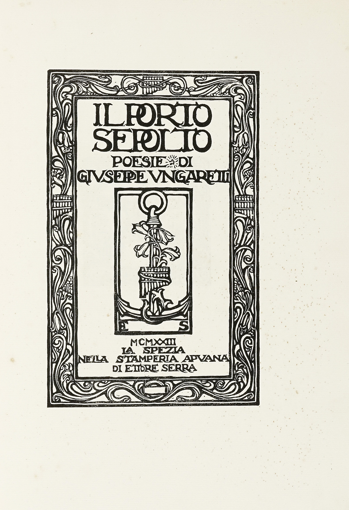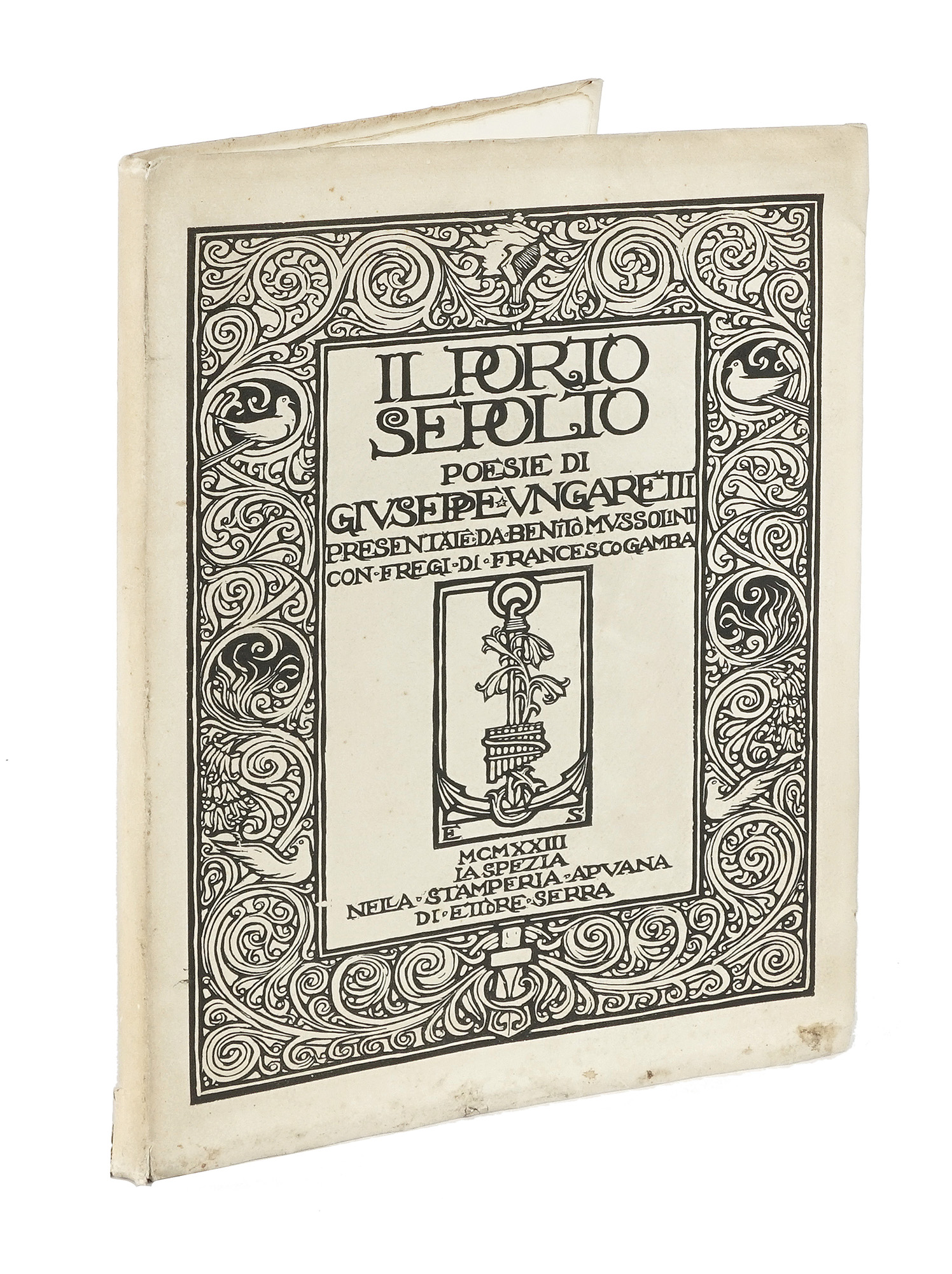 Ungaretti Giuseppe, Il porto sepolto poesie [...] presentate da Benito Mussolini con fregi di Francesco Gamba. La Spezia: nella stamperia Apuana di Ettore Serra, 1923.