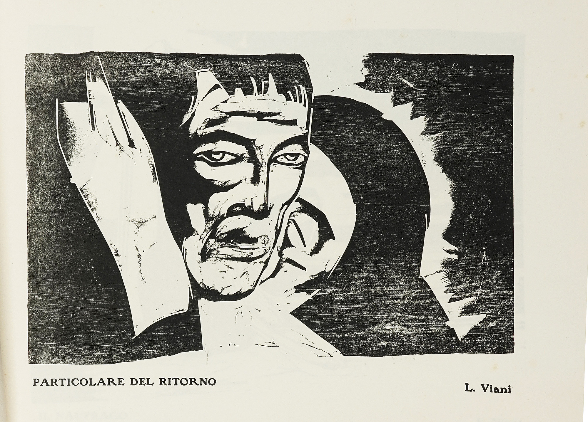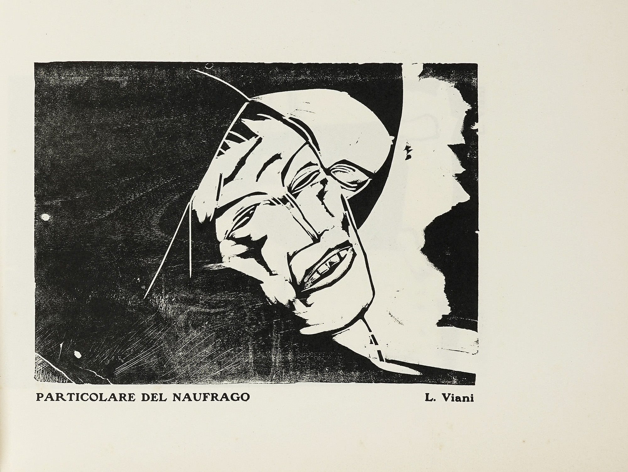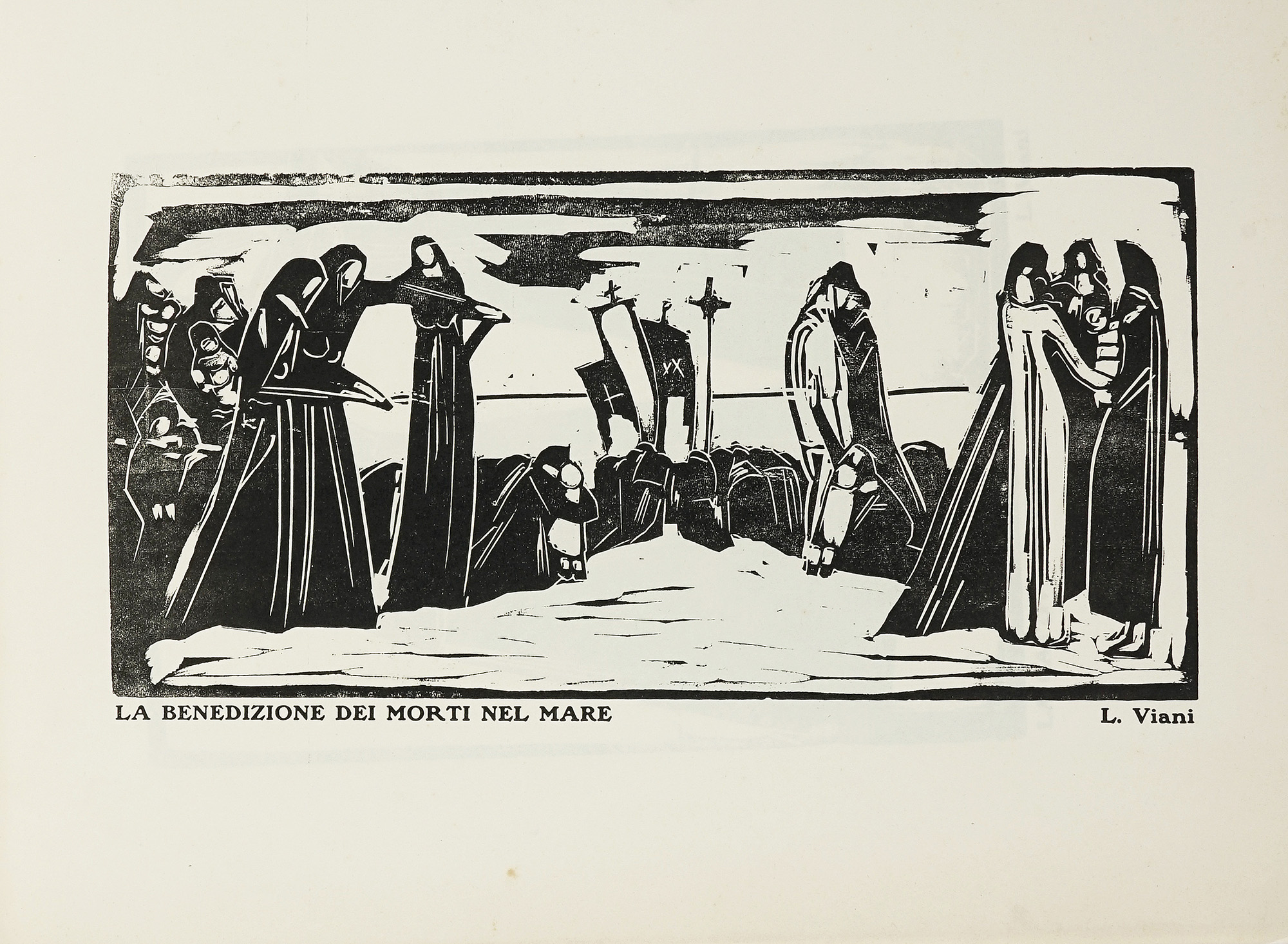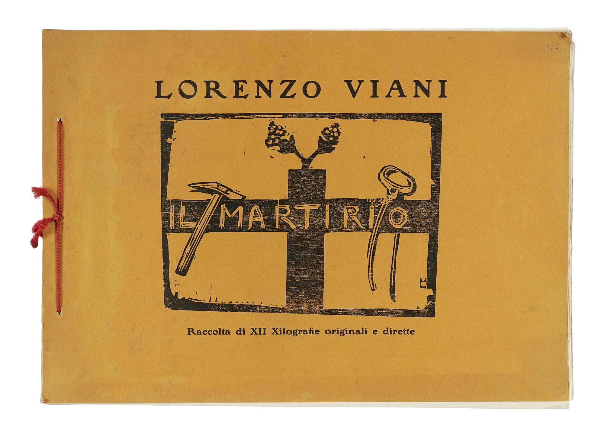 In-folio oblungo (mm 350x500). Esemplare con 12 xilografie di Lorenzo Viani, di cui 11 a piena pagina, con il titolo e il nome dell'Artista al margine inferiore. Lievi fioriture ad alcune tavole, ma ottimo esemplare, perfettamente conservato. Legatura in brossura editoriale in cartoncino giallo, legata con cordicella rossa, con 2 xilografie originali di Viani ai piatti. Lievi macchioline a quello anteriore, altrimenti ottima conservazione. (1) Nella prima tavola, accanto all'incisione di una vecchia con un bambino, l'artista riporta un testo esplicativo al contenuto dell'album: "Questa raccolta di xilografie è tratta dagli studi di un mio quadro, La benedizione dei morti del mare, che stò ultimando per la casa comunale del mio paese. Chi conosce da vicino l'ordine e la disciplina del mio lavoro, non si meraviglierà se queste tavole sono di una sintesi che un mio amico ha definito "disperata!" Il concetto che ha informato il mio lavoro mi ha portato a questa sommarietà di espressione che voglio sviluppare fino a che non sono giunto alla linea pura. Siccome penso che l'arte sia fenomeno di volontà, ho dato a quest'opera quello speciale carattere primitivo, nella disposizione dei gruppi, per rendere il concetto più vasto: universale!...". Le xilografie che seguono riportano i seguenti titoli: La benedizione dei morti del mare, La cattiva notizia, Il vicinato, Il ritorno, Particolare del ritorno, Il naufrago, La madre, Particolare del naufrago, L'attesa, L'offerta, La preghiera. Il martirio rappresenta, forse, il più alto esito di Viani xilografo: in queste incisioni dal segno sintetico e angoloso, neo-primitive ed espressioniste, c'è tutta la drammaticità, resa quasi sacra e ieratica, della dura vita del popolo del mare, ma resa ancora più cupa e luttuosa (ma non per questo priva di speranza) dalla coincidenza con gli anni della Grande Guerra.