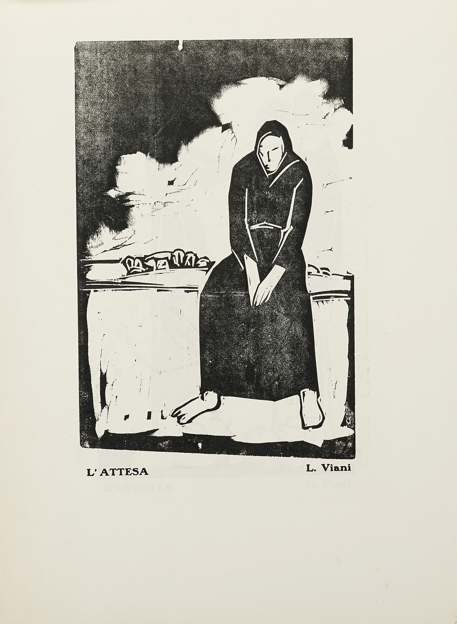 Viani Lorenzo, Il martirio. Raccolta di XII Xilografie originali e dirette. Viareggio: Tipografia O. Ciani, [s.d. ma 1916 ca].