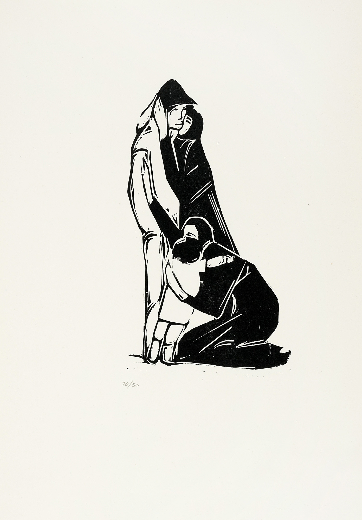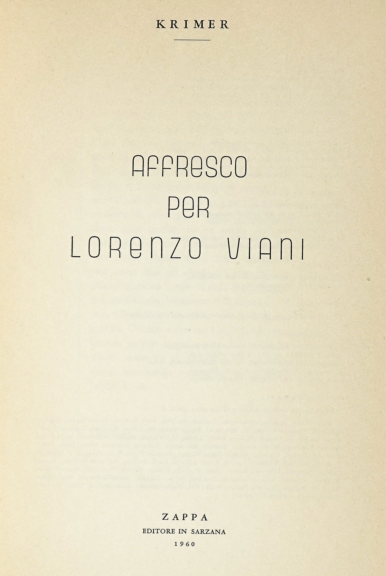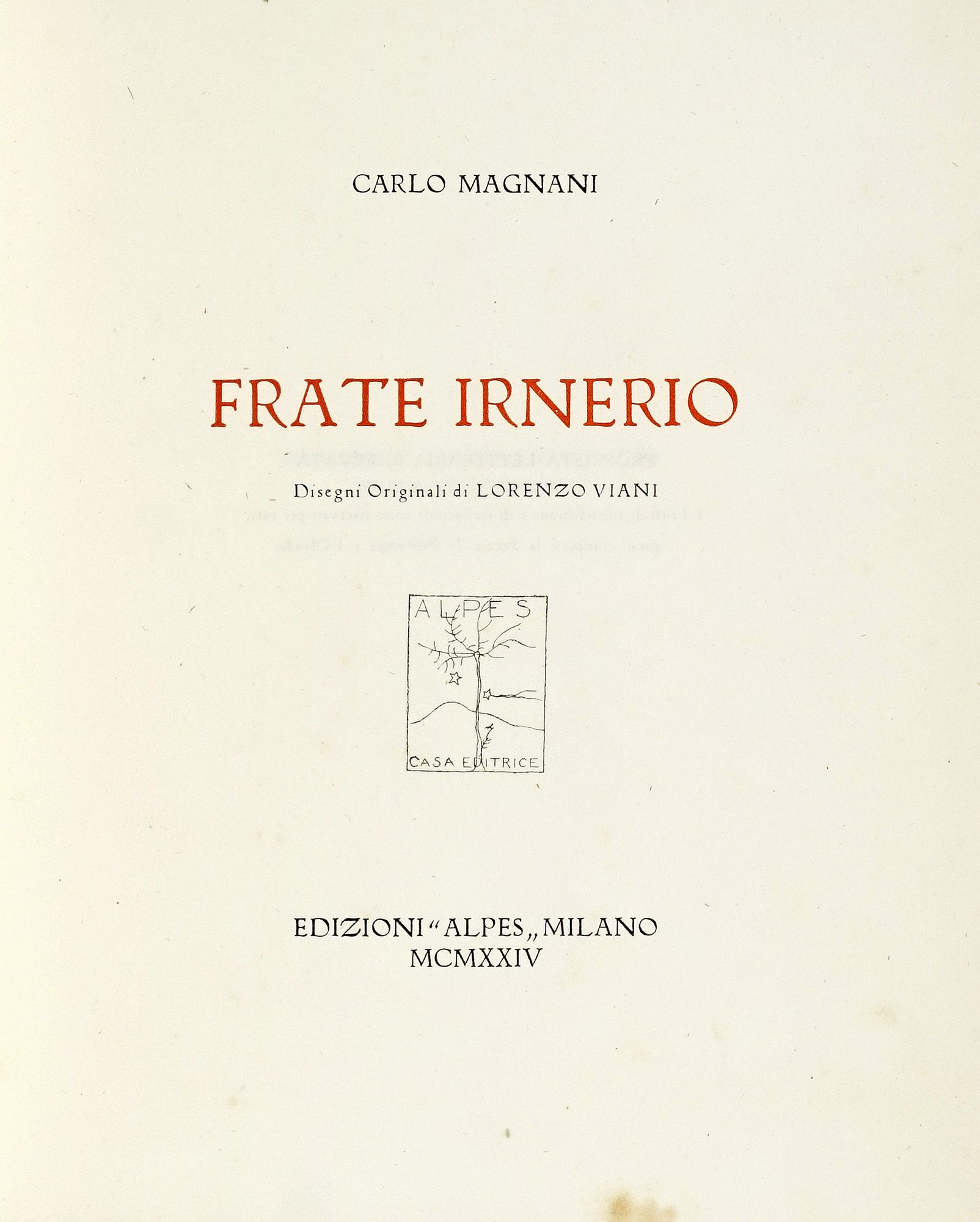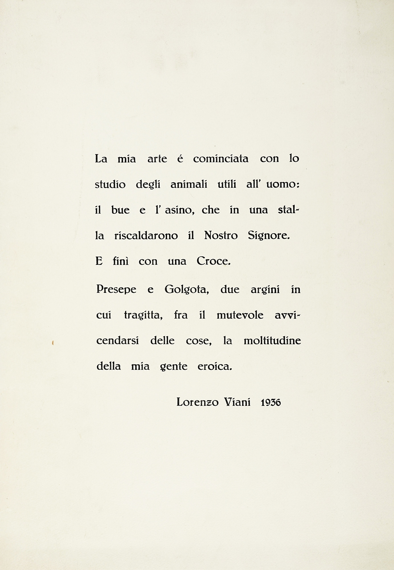 1 cartella editoriale con testo al piatto anteriore (mm 510x365) contenente 1 carta di frontespizio, 1 di colophon e 8 xilografie originali di Lorenzo Viani (La disgrazia, L'attesa, Vedova di marinaio, Le vedove, Cercatrici di legna, Le comari, Il reduce, Il riposo), numerate a matita e con il certificato di garanzia applicato al retro. Piccolissime pieghe marginali ad alcune incisione, altrimenti ottima conservazione. SI AGGIUNGONO: Magnani Carlo, Frate Irnerio. Disegni originali di Lorenzo Viani. Milano: Alpes, 1924; Krimer, Affresco per Lorenzo Viani. Sarzana: Zappa, 1960. (3) I OPERA: Cartella edita in occasione della mostra Viani Intimo del 28 agosto-18 settembre 1961 per il 25° anniversario della morte dell'Artista. Le xilografie sono state stampate su torchio a mano da Walter Piacesi, per concessione degli eredi Vivaldi Viani. II OPERA: Edizione a tiratura limitata di 400 esemplari, il nostro privo di numerazione.