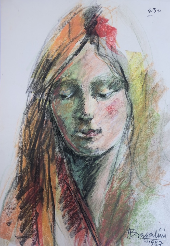 Angelo Bragalini (Fidenza 1913 - Bologna 1994). Ritratto di ragazza. Pastello su carta. Firmato e datato in basso a destra ABragalini 1987. Numerato in alto a sinsitra 430. Cm 25x17,5.
