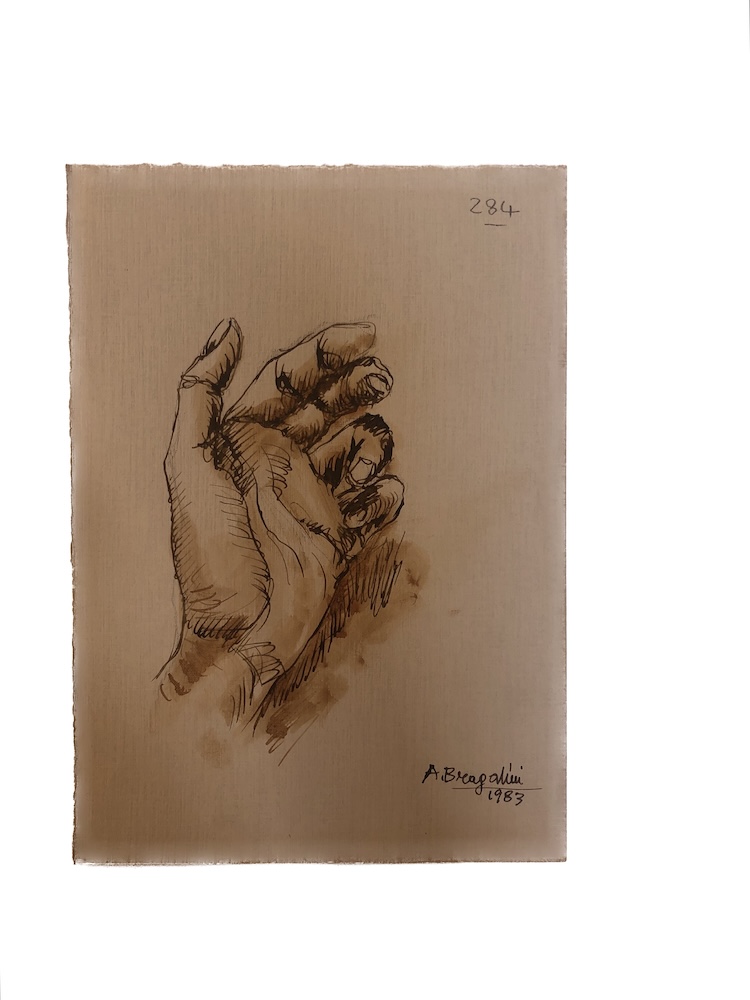 Angelo Bragalini (Fidenza 1913 - Bologna 1994). Studio di mano. China e acquerello su cartoncino. Firmato e datato in basso a destra A. Bragalini 1983. In alto a destra numeri 284. Al verso disegno di volto di donna. Cm 24,5x17,5.