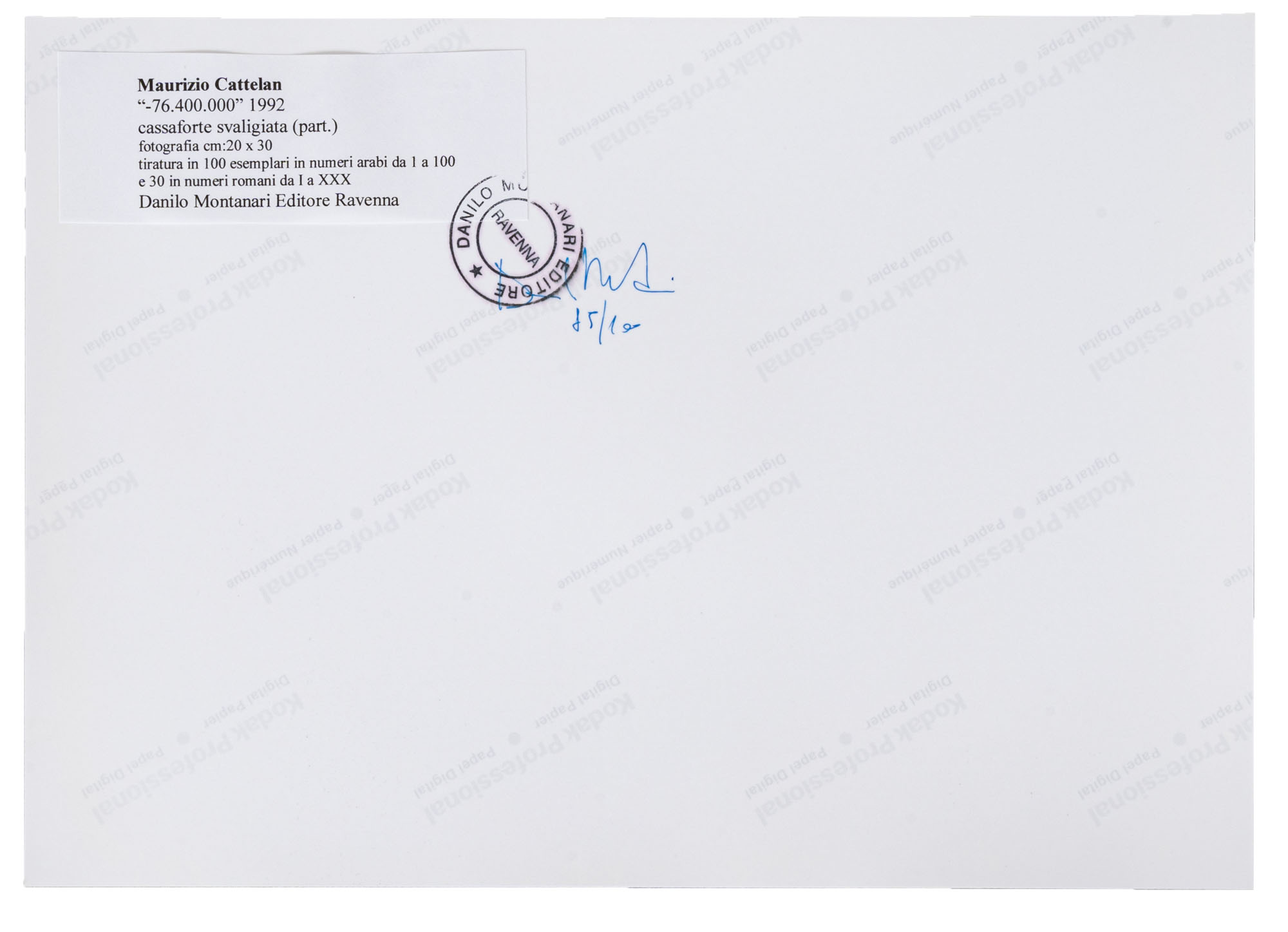 MAURIZIO CATTELAN(1960)Cassaforte svaligiata (part.) - 76.400.0001992Cartella contenente una stampa cibachrome, es. 85/100 su una tiratura complessiva di 100 esemplari in numeri arabi e 30 in numeri romani, Danilo Montanari Editore, RavennaDimensioni della cartella: 32 x 22 cmDimensioni della stampa cibachrome: 20 x 27,8 cmTimbro e firma Danilo Montanari Editore e numerazione al retro della stampa cibachromePROVENIENZA:Collezione privata, Milano