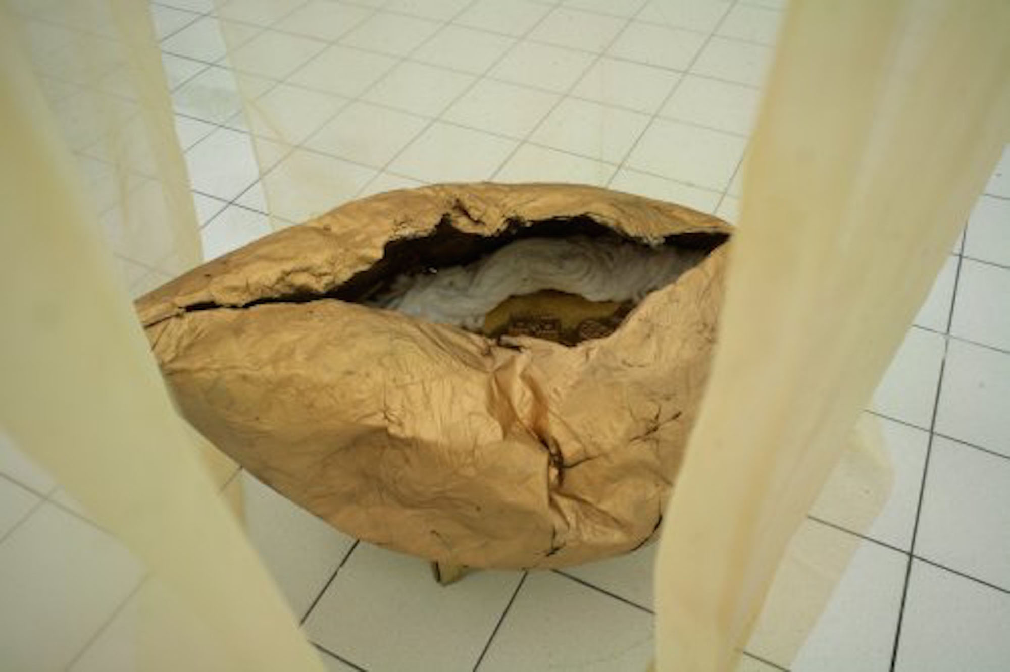 Scultura composta da cartapesta, intonaco, cotone idrofilo, adesivi, legno e tessuto