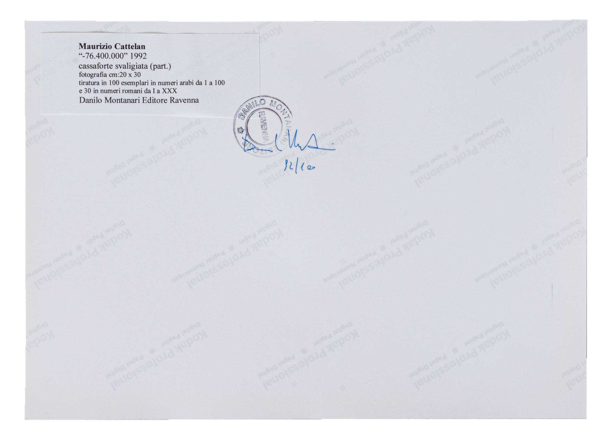 MAURIZIO CATTELAN(1960)Cassaforte svaligiata (part.) - 76.400.0001992Cartella contenente una stampa cibachrome, es. 92/100 su una tiratura complessiva di 100 esemplari in numeri arabi e 30 in numeri romani, Danilo Montanari Editore, RavennaDimensioni della cartella: 32 x 22 cmDimensioni della stampa cibachrome: 20 x 27,8 cmTimbro e firma Danilo Montanari Editore e numerazione al retro della stampa cibachromePROVENIENZA:Collezione privata, Milano